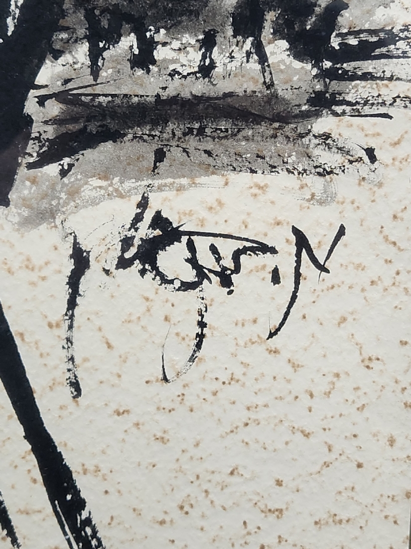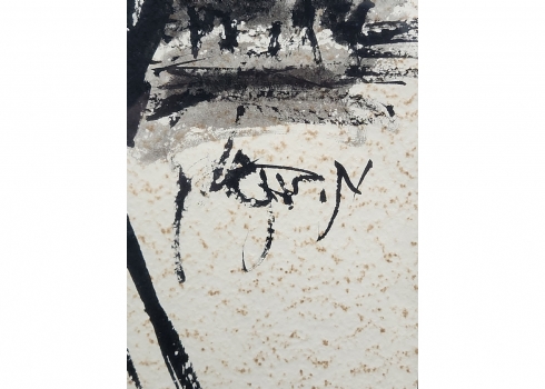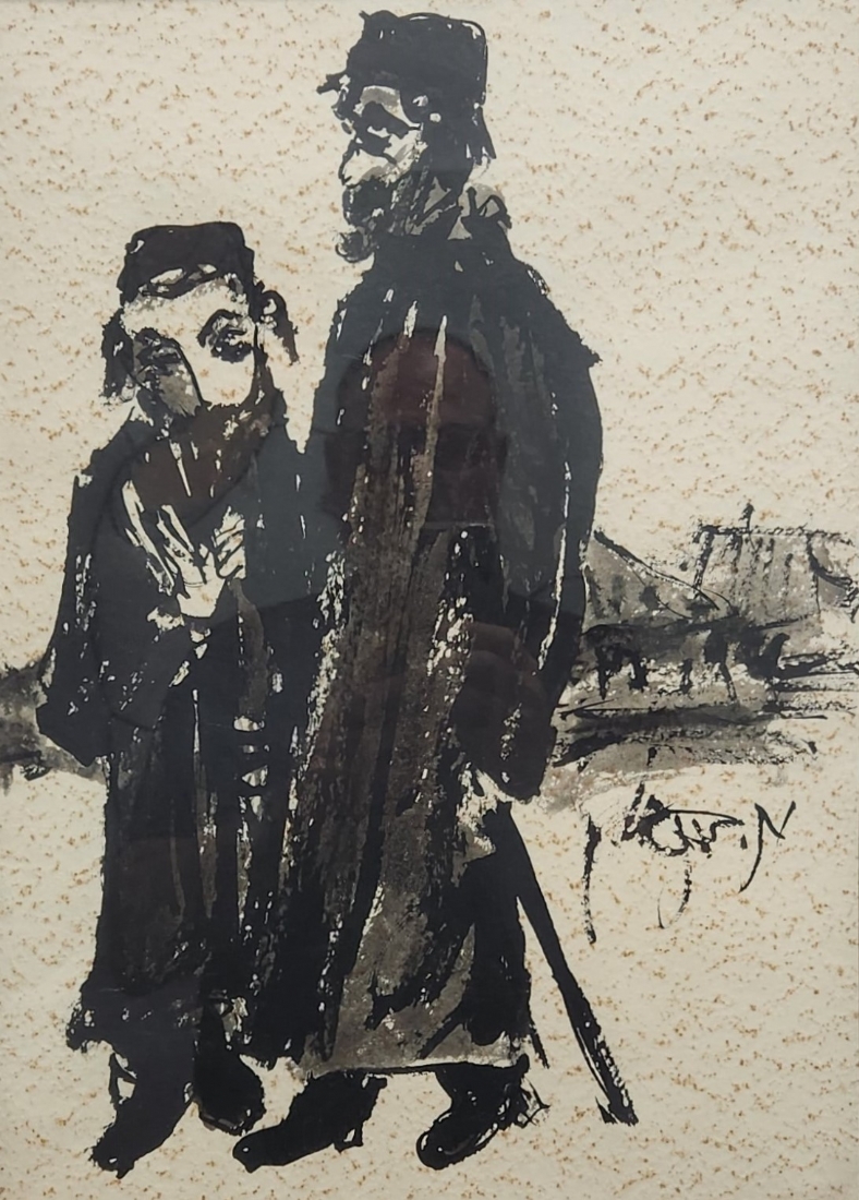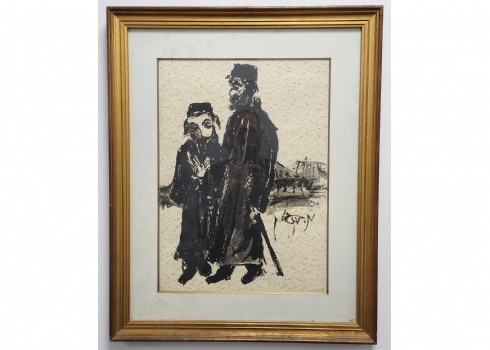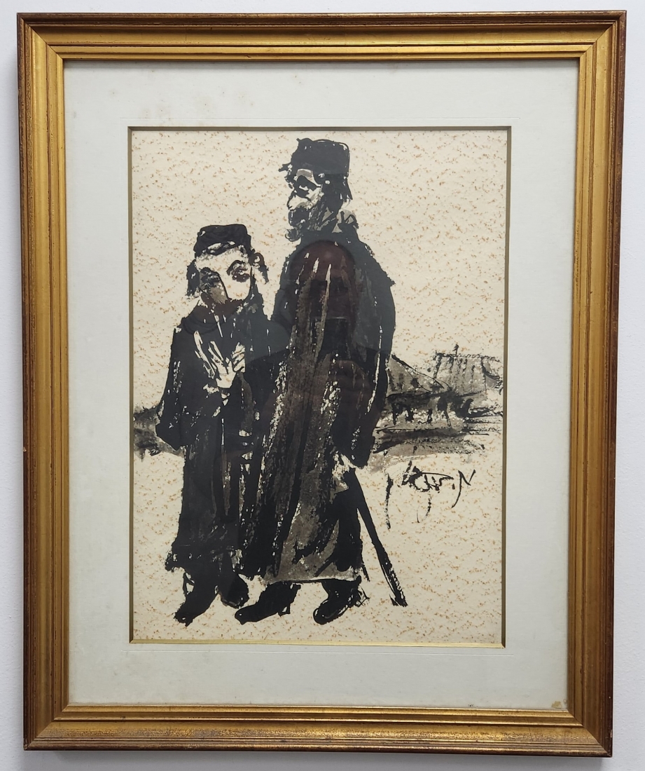 משה ברנשטיין (Moshe Bernstein) - 'אב ובנו בעיירה היהודית' - גואש ואקוורל שחור על נייר,70X57 ס"מ. כתמים לנייר (מצולם), חתום, מידות: 50X37 ס"מ, מידות המסגרת: 70X57 ס"מ.