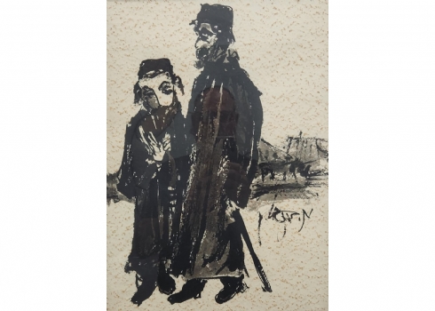 משה ברנשטיין (Moshe Bernstein) - 'אב ובנו בעיירה היהודית' - גואש ואקוורל שחור