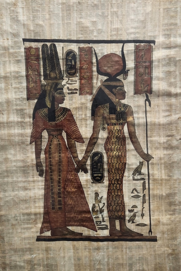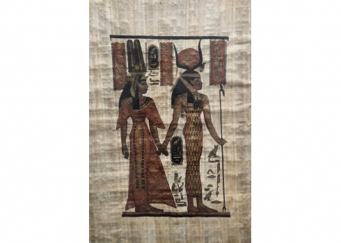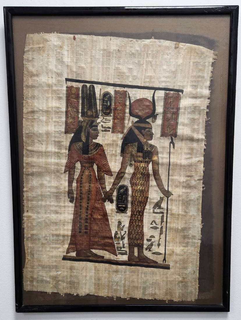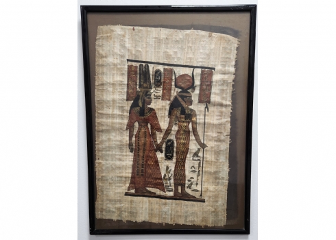 תמונה מצרית ישנה מצויירת בגואש על נייר פפירוס, מידות המסגרת: 76X56 ס"מ.