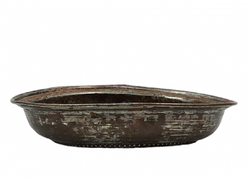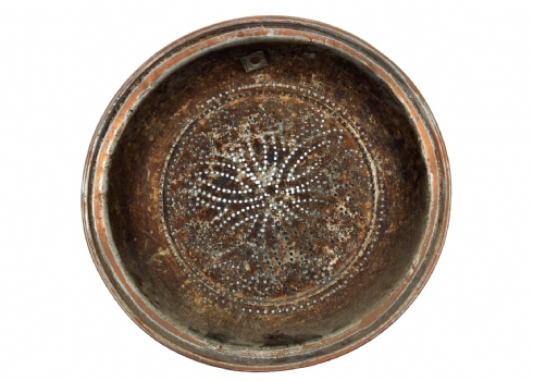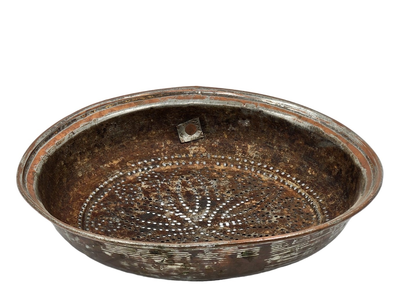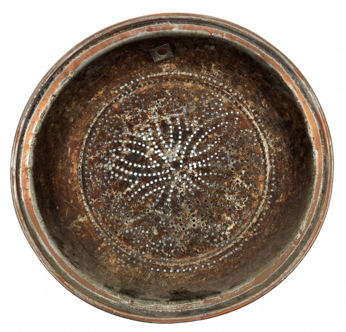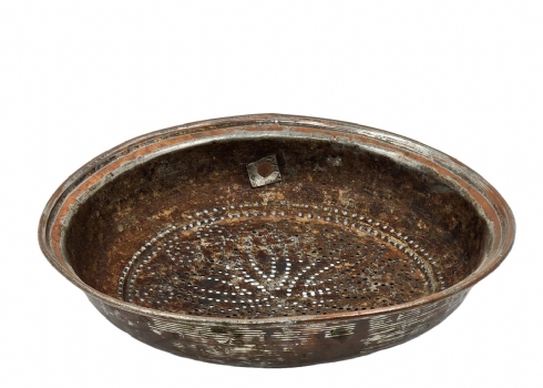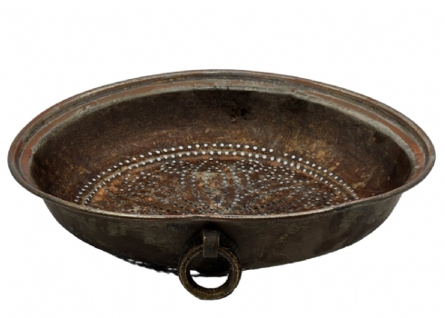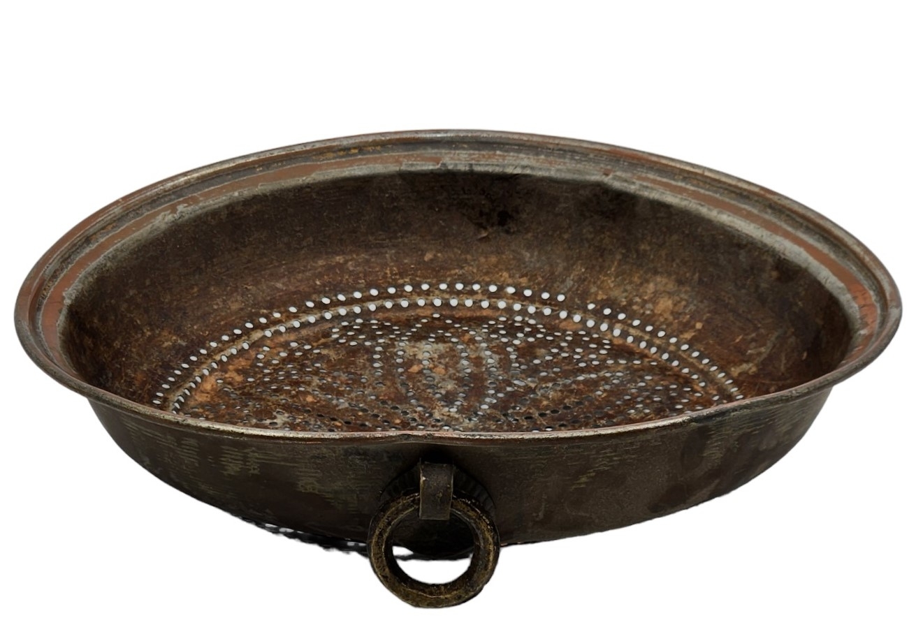 מסננת ישנה לתליה על קיר המטבח, צפון אפריקה, המאה העשרים, עשויה נחושת (שאריות ציפוי בדיל), קוטר: 33 ס"מ.