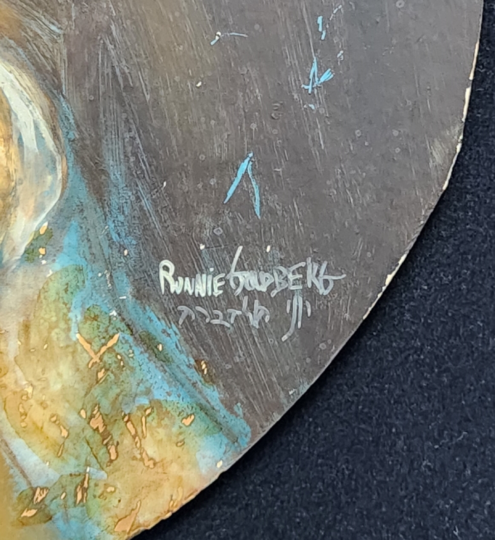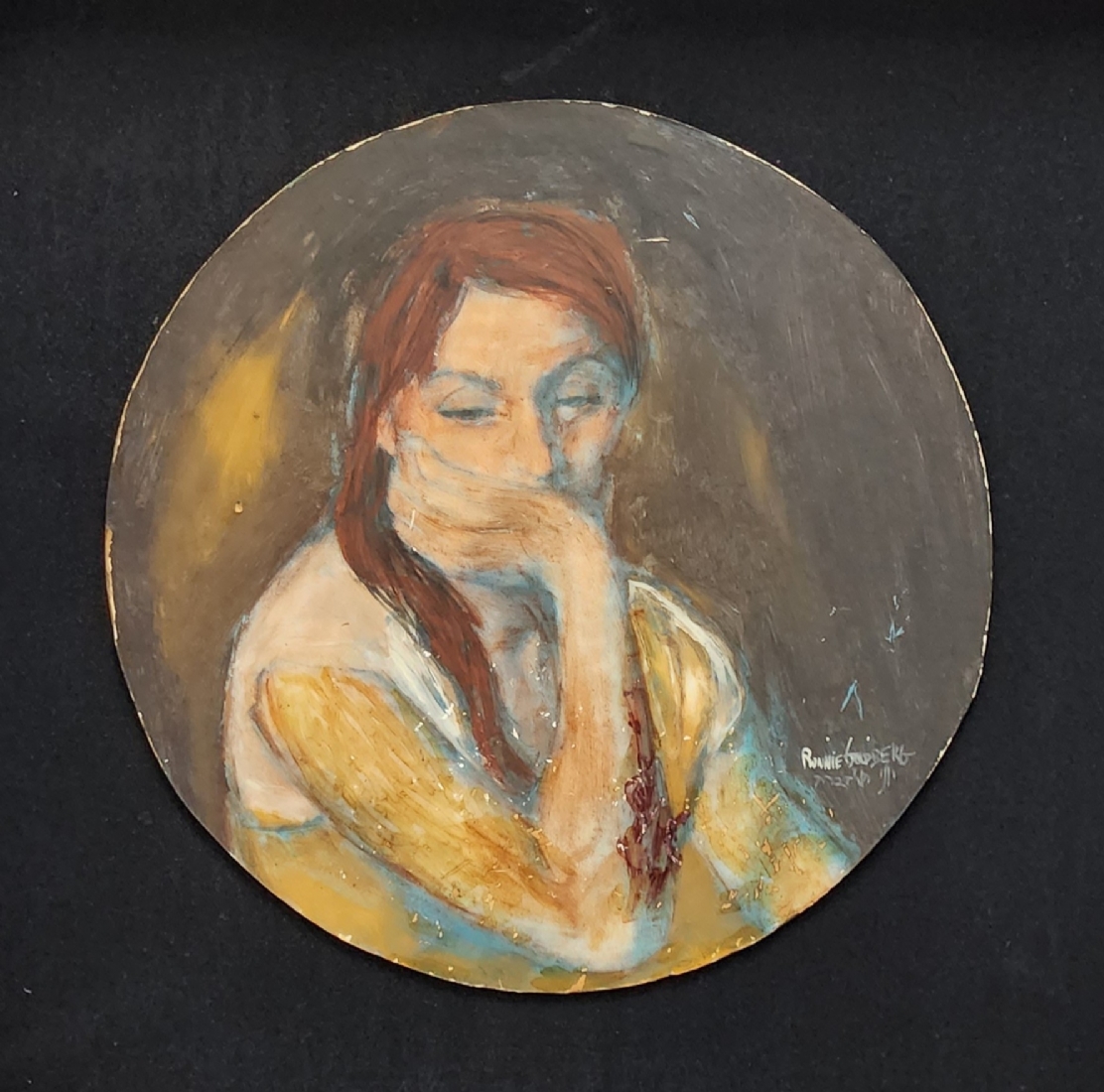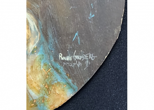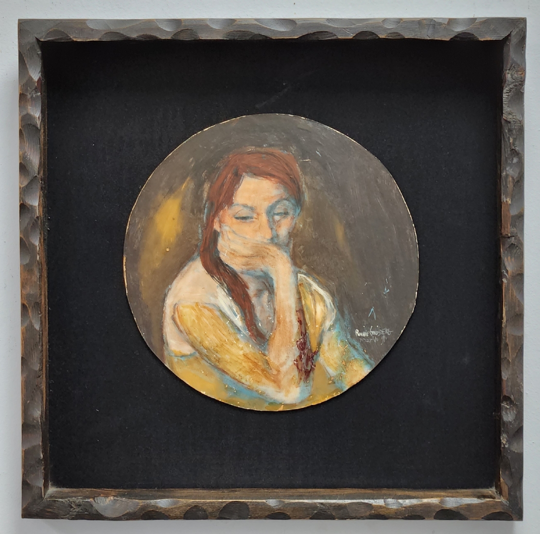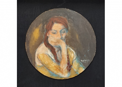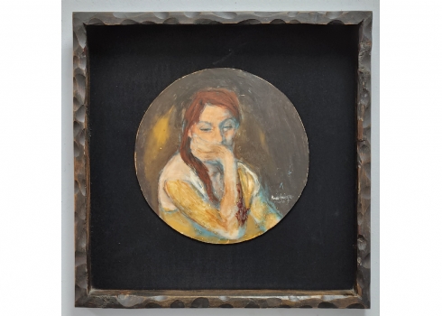 רוני גולדברג - 'אדמונית מהורהרת' - ציור ישן, שמן על לוח עגול, חתום, קוטר: 25 ס"מ, מידות המסגרת: 42X42 ס"מ.