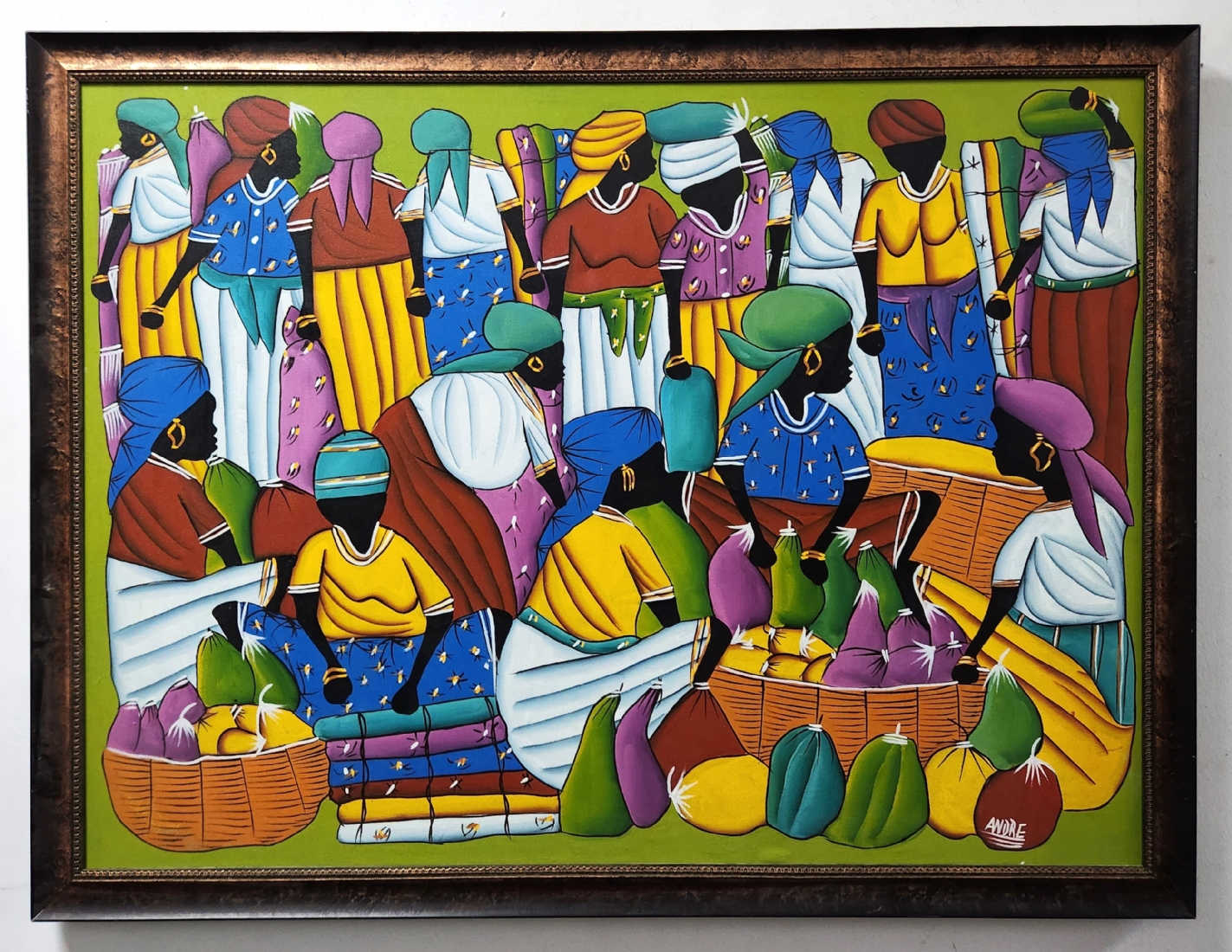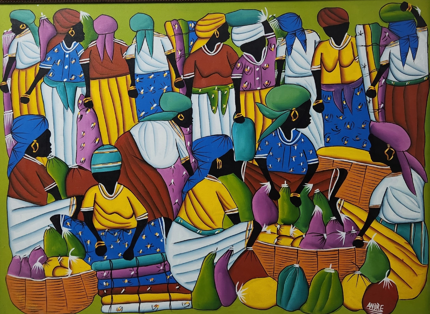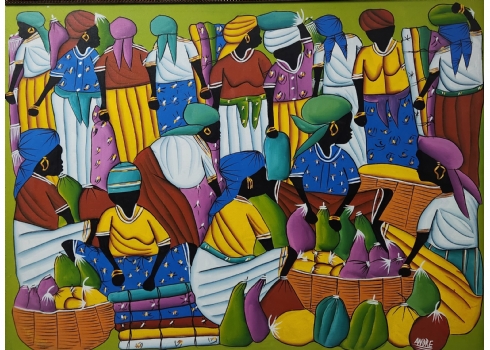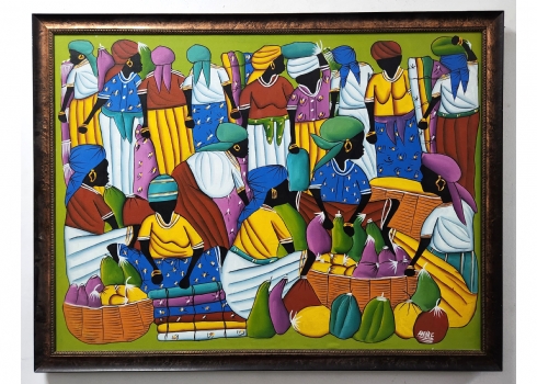 'נשים בשוק הפירות' - ציור גדול, אקריליק על בד, חתום, מידות: 73X97 ס"מ, מידות המסגרת: 81X106 ס"מ.