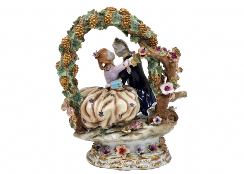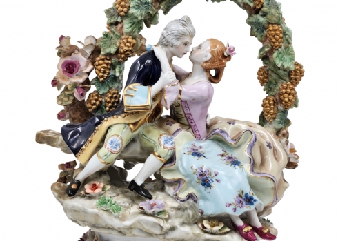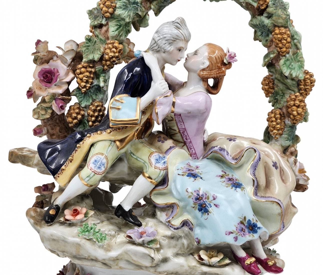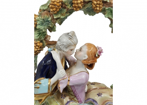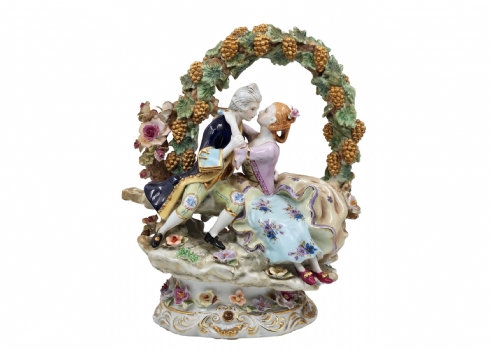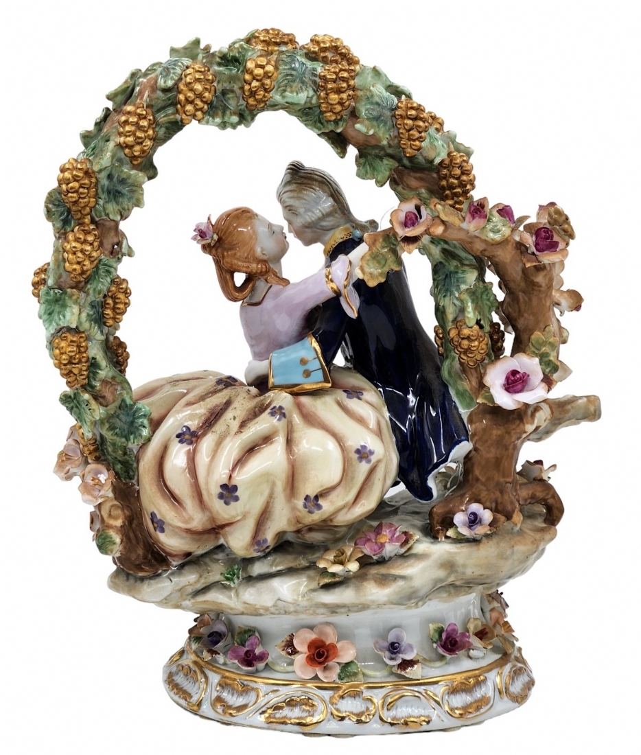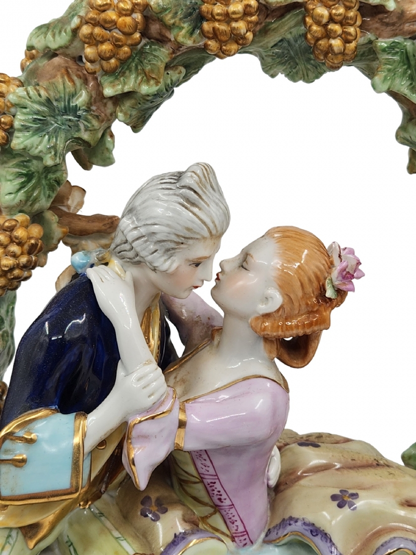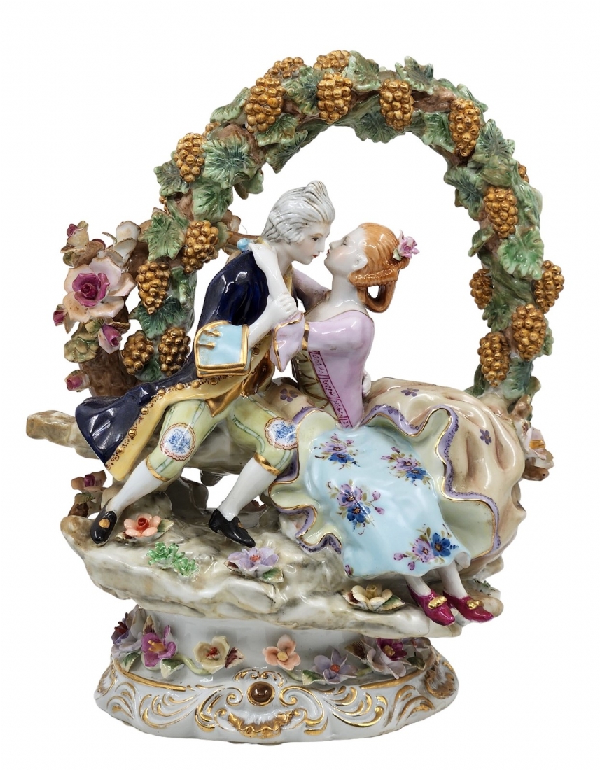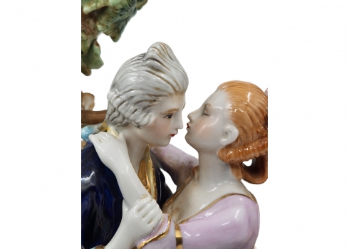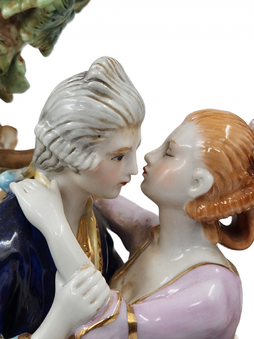 "תנשק אותי כבר קיבינימט" - קבוצה פיסולית גדולה עשויה חרסינה, מעוטרת בצביעת יד באמייל ובזהב, חתומה, רוחב: 30 ס"מ, גובה: 38 ס"מ.