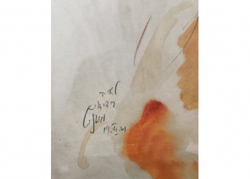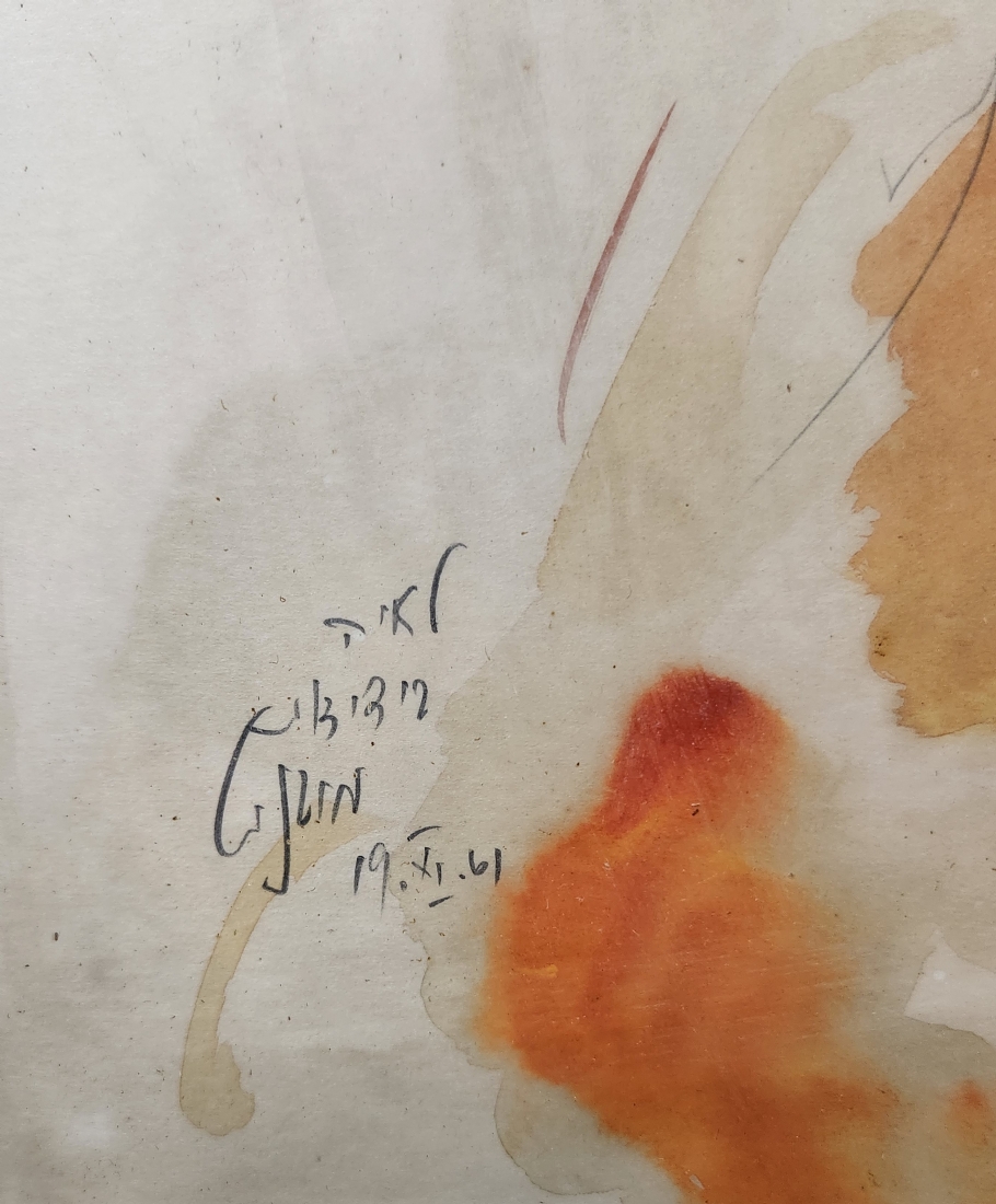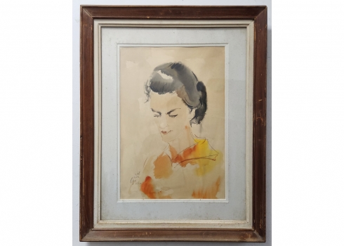 מרדכי אבניאל (Mordechai Avniel) - 'פורטרט אישה בחולצה כתומה' - רישום ואקוורל על נייר, חתום ומתוארך: 1961, מידות: 50X35 ס"מ, מידות המסגרת: 72X57 ס"מ.