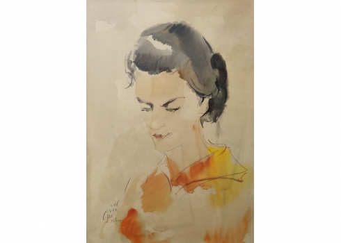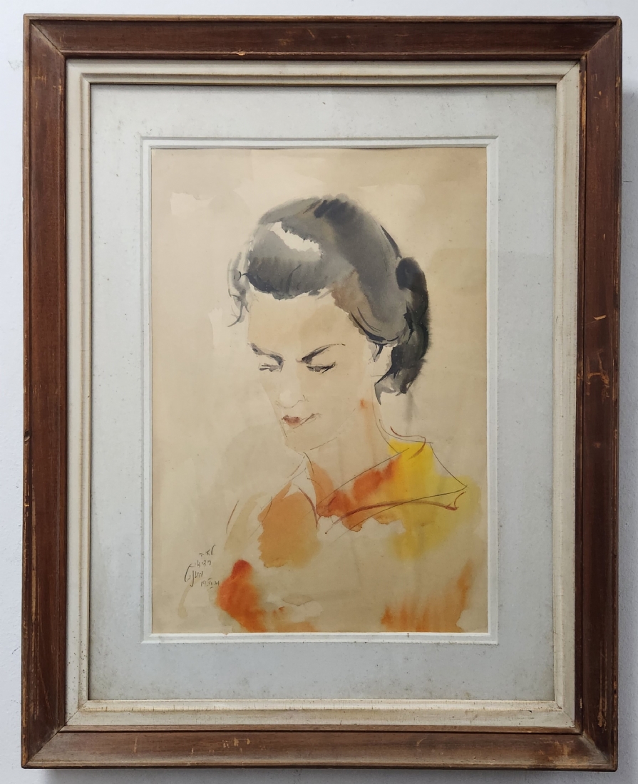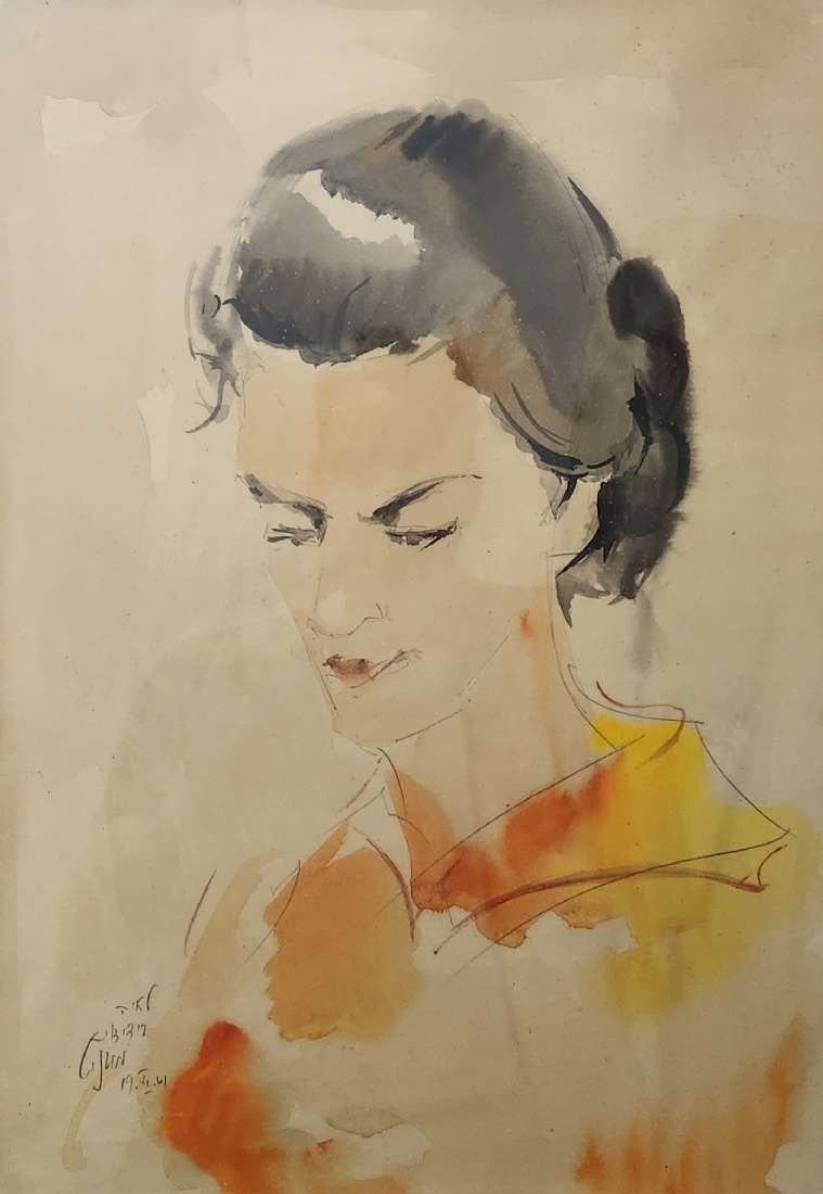 מרדכי אבניאל (Mordechai Avniel) - 'פורטרט אישה בחולצה כתומה' - רישום ואקוורל