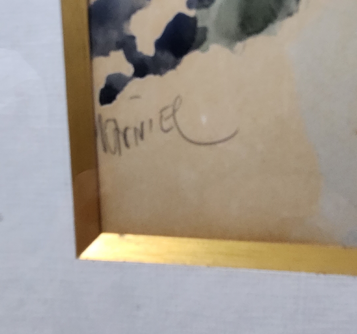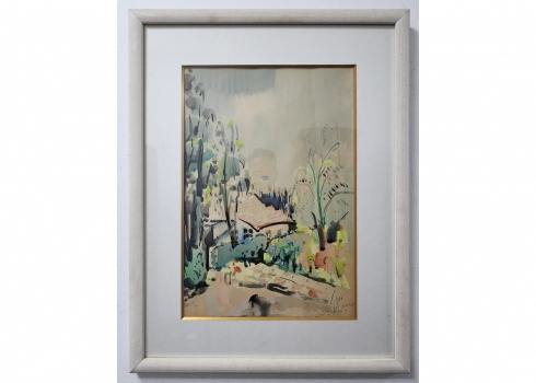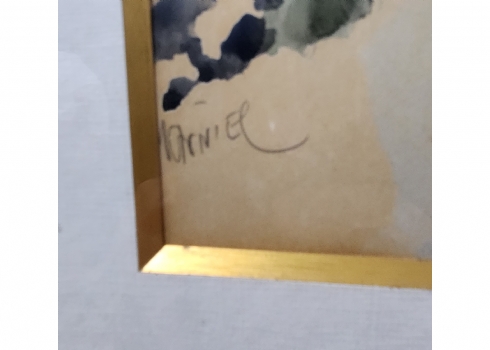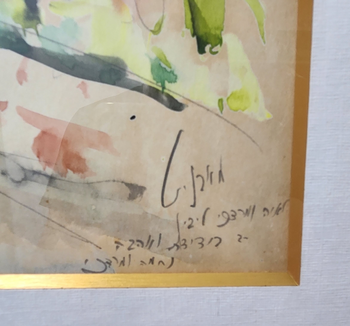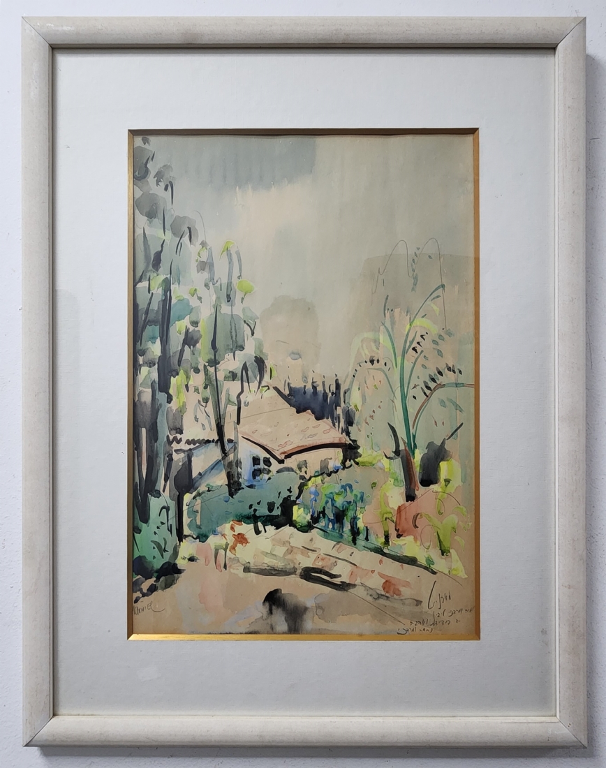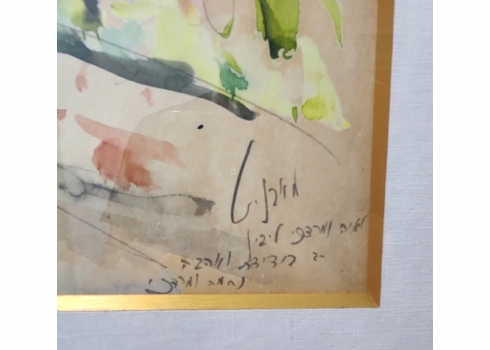 מרדכי אבניאל (Mordechai Avniel) - 'בית בראש פינה' - רישום ואקוורל על נייר, חתום ונושא הקדשה, מידות: 48X33 ס"מ, מידות המסגרת: 67X52 ס"מ.