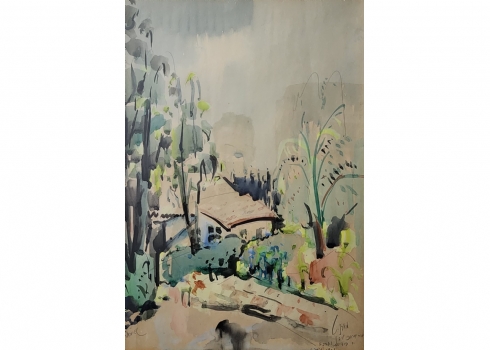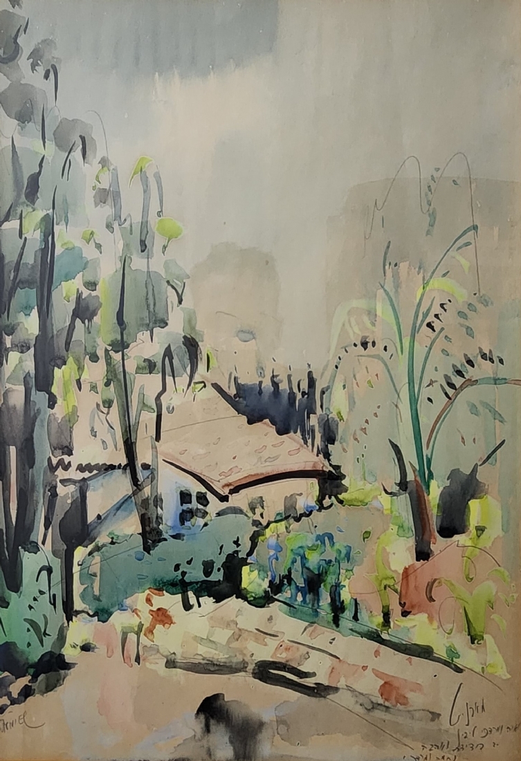 מרדכי אבניאל (Mordechai Avniel) - 'בית בראש פינה' - רישום ואקוורל על נייר, חתום