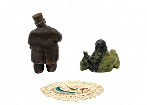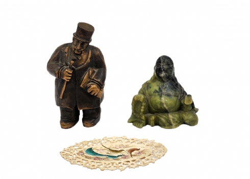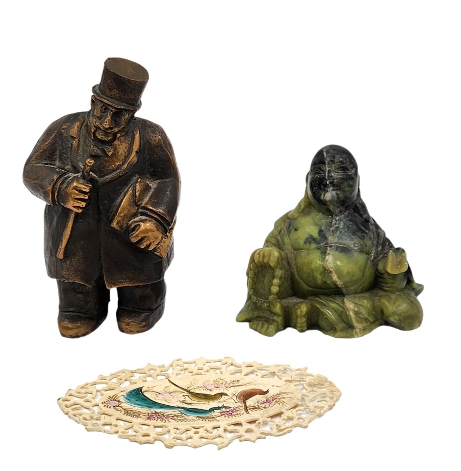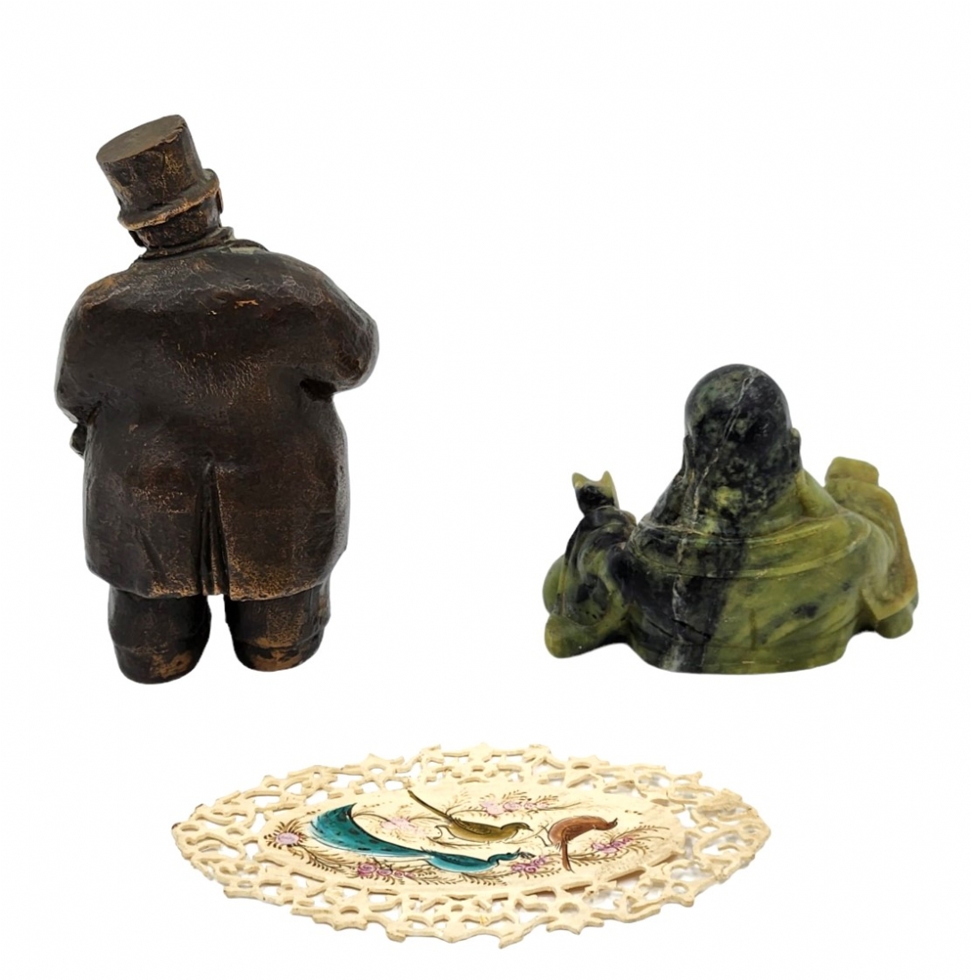 לוט של 3 פריטים ישנים שונים, הכולל פסלון פליז, פסלון ג'ייד (תיקון ישן) וקישוט דקורטיבי עשוי חומק יצוק, גובה פסלון הפליז: 12 ס"מ, רוחב פסלון הג'ייד: 9 ס"מ.