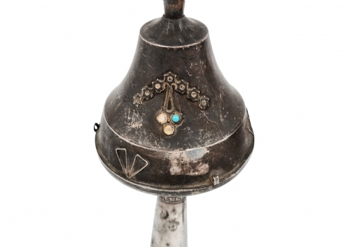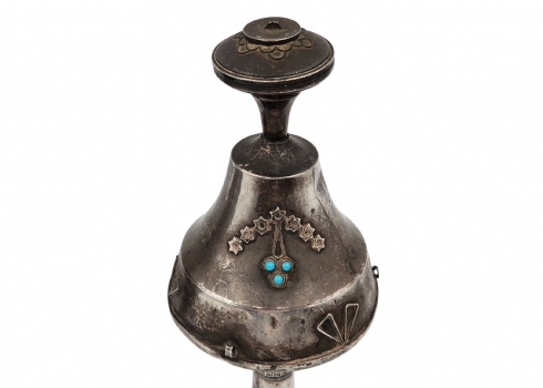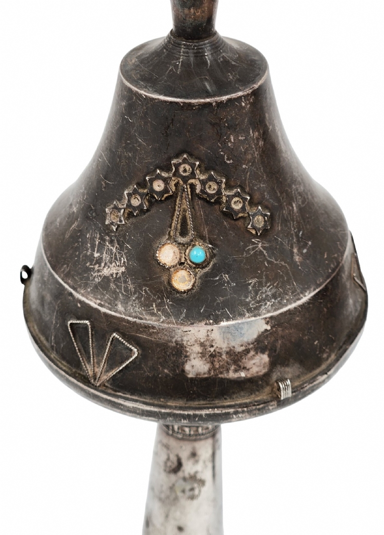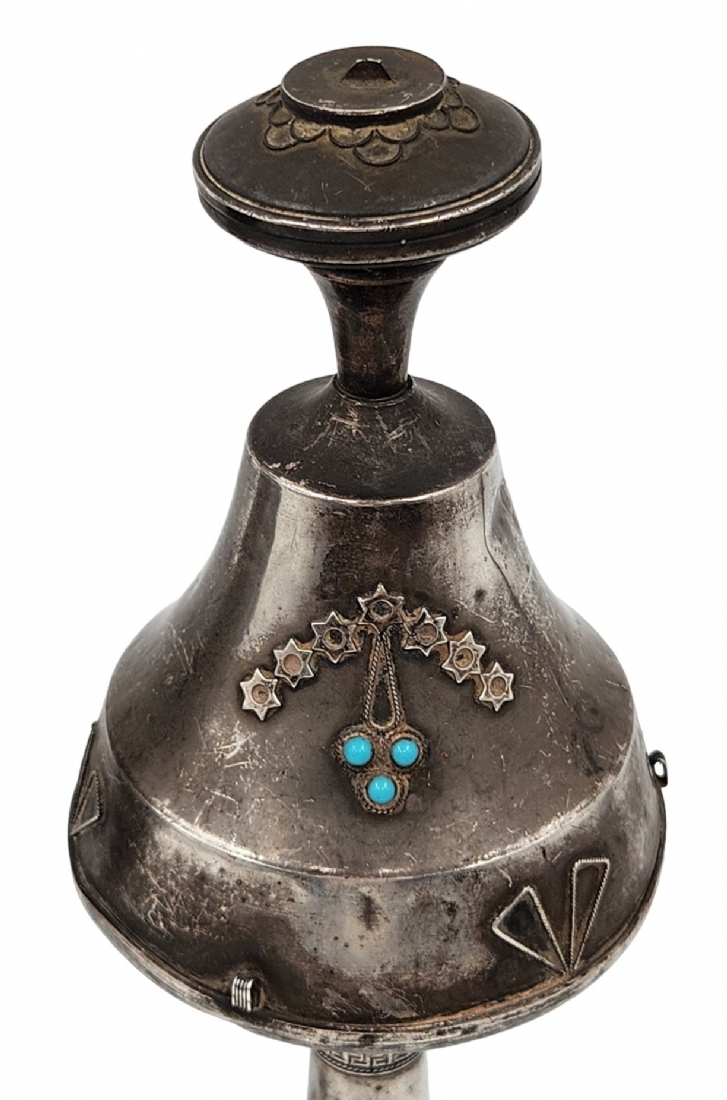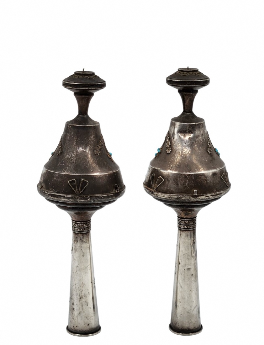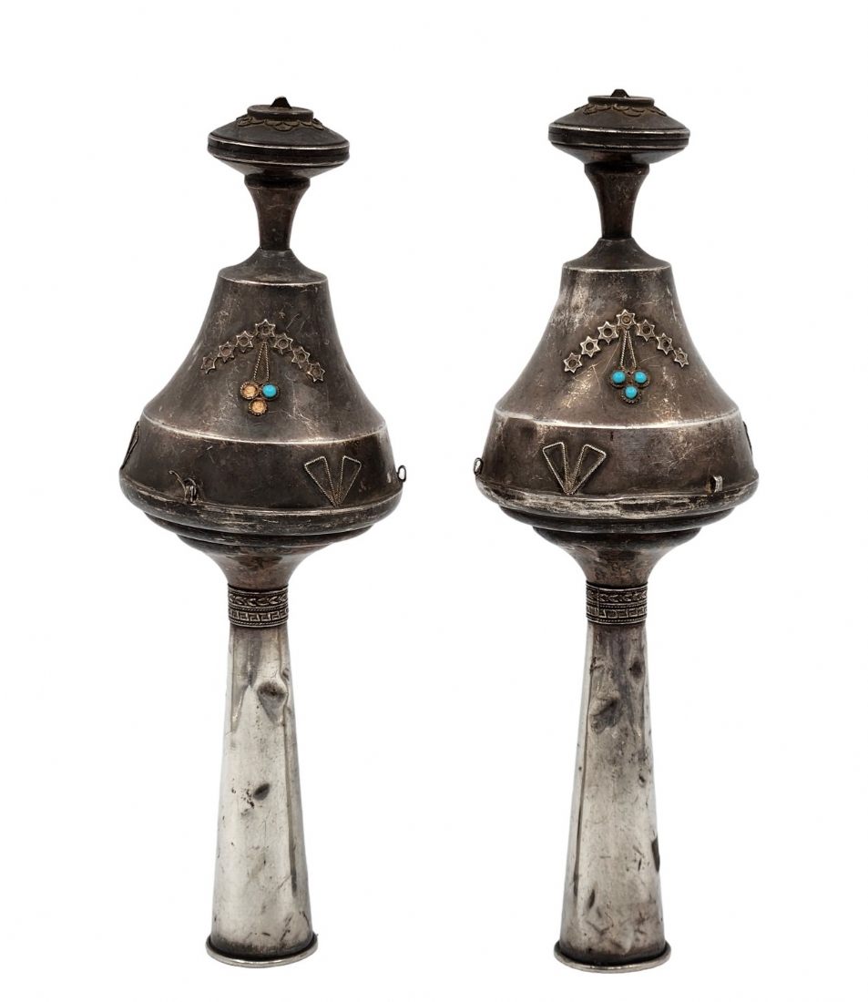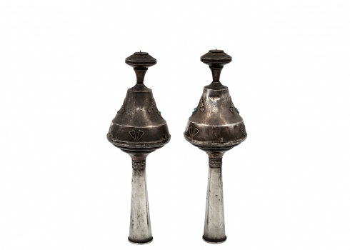 זוג רימונים ישראלים ישנים לספר תורה, עשויים כסף, לא חתומים אך טוהר הכסף נבדק