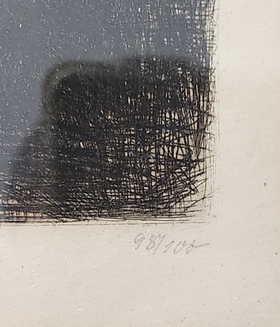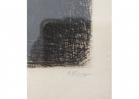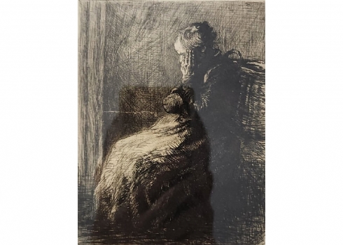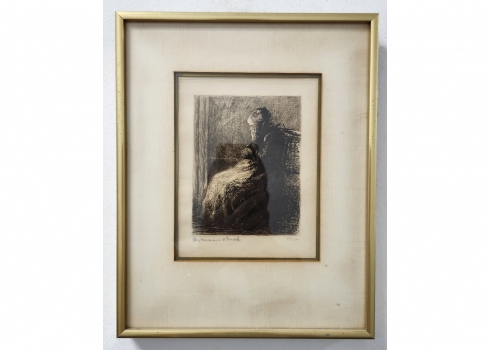 הרמן שטרוק (Hermann Struck) - 'אישה ליד סלי נצרים' - תצריב, חתום בעיפרון וממוספר: 98/100, מידות: 18X14 ס"מ, מידות המסגרת: 30.5X24.5 ס"מ.