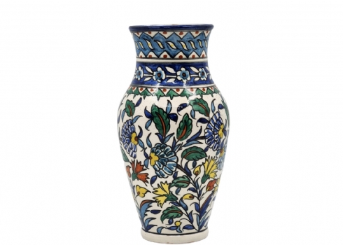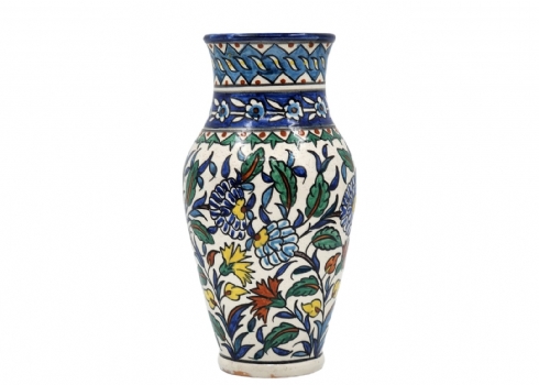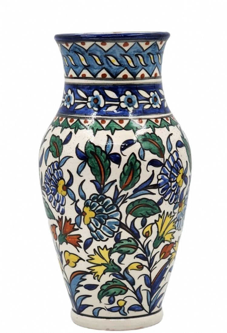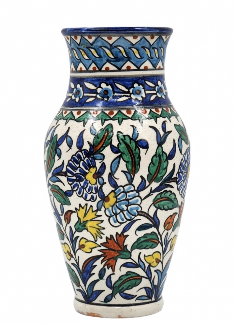 אגרטל ארמני ישן עשוי קרמיקה, מעוטר ציורי יד, חתום, גובה: 25.5 ס"מ, רוחב: 11.5 ס"מ.