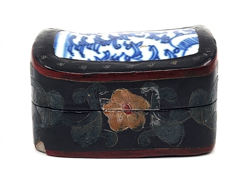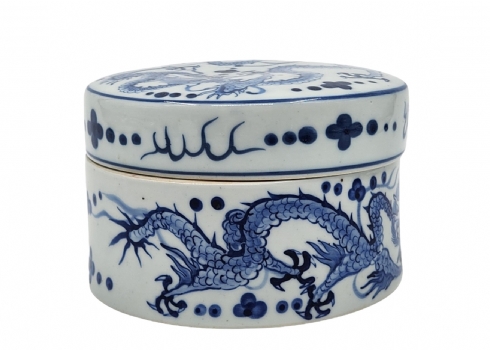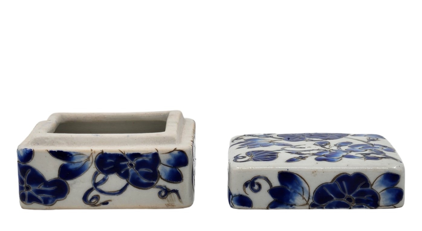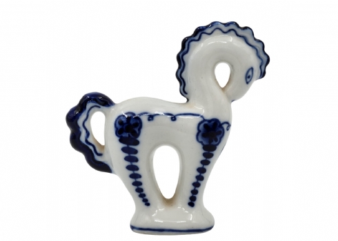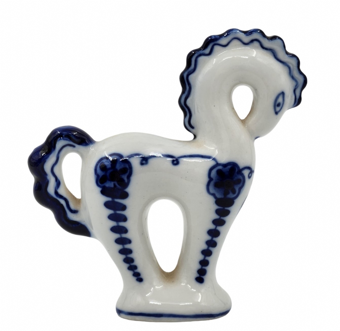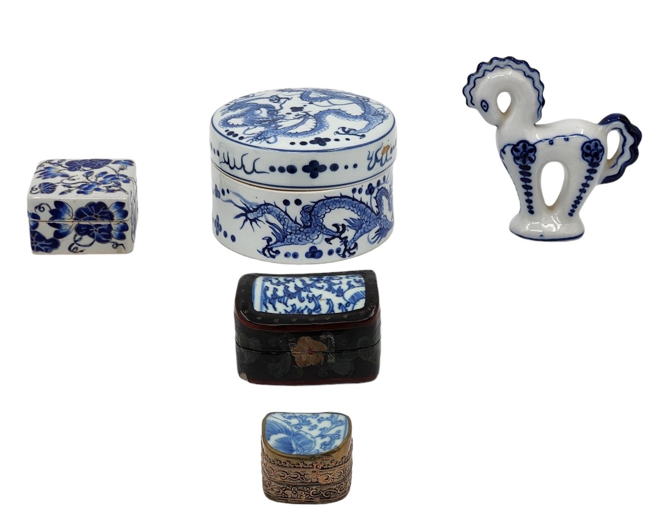 לוט של 5 פריטי כחול לבן ישנים ושונים, עשויים קרמיקה פורצלן, עץ ואלומיניום, לא חתומים, למעט הסוס הסובייטי (צ'יפים לקופסת עץ - מצולם), גובה הסוס: 12 ס"מ, קוטר הקופסה העגולה: 12 ס"מ