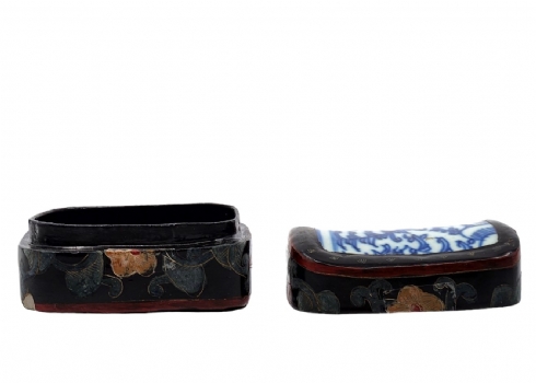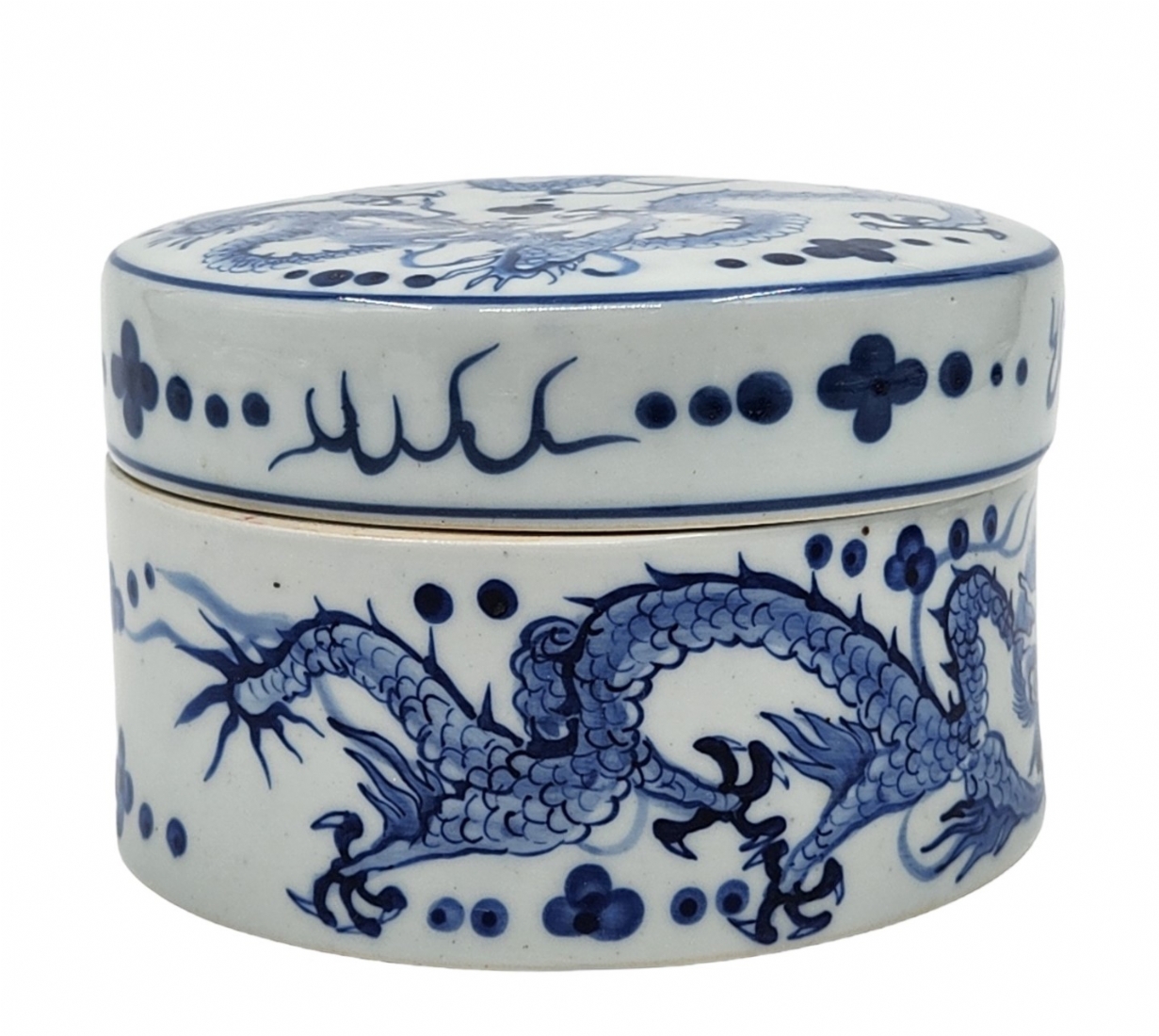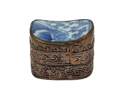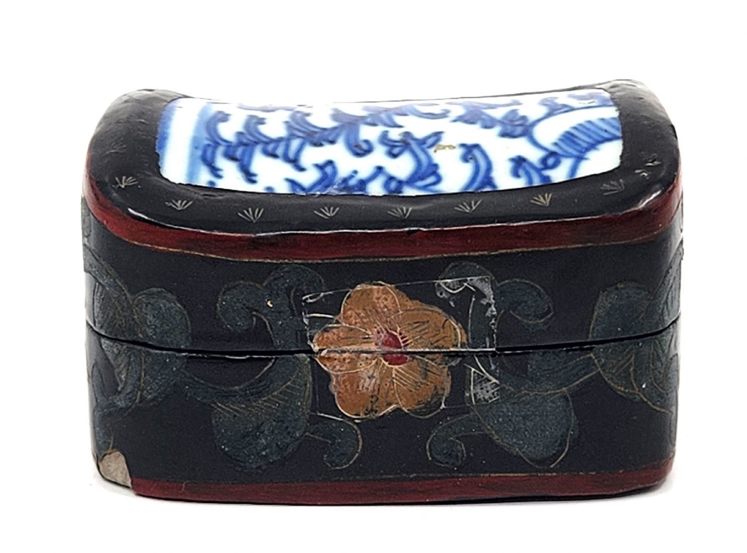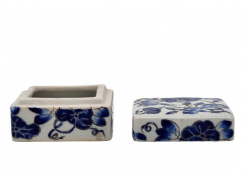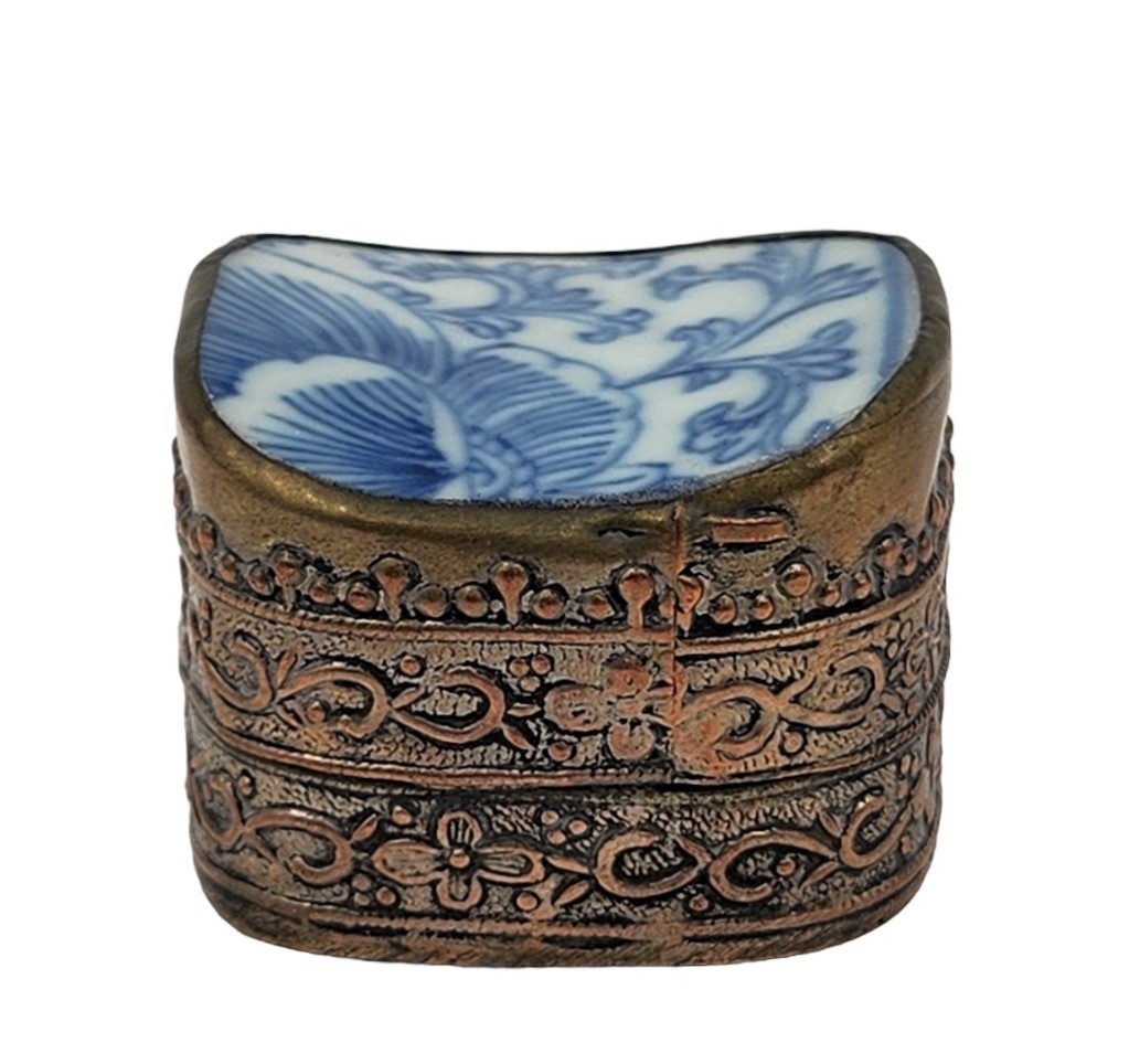 לוט של 5 פריטי כחול לבן ישנים ושונים, עשויים קרמיקה פורצלן, עץ ואלומיניום, לא חתומים, למעט הסוס הסובייטי (צ'יפים לקופסת עץ - מצולם), גובה הסוס: 12 ס"מ, קוטר הקופסה העגולה: 12 ס"מ