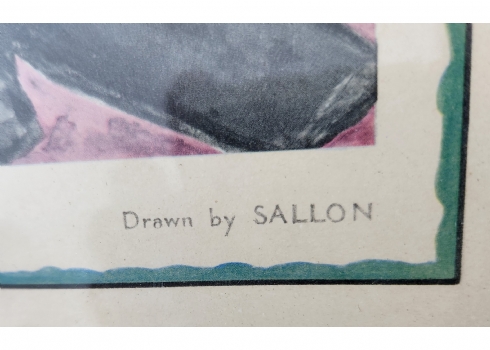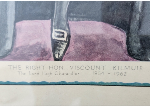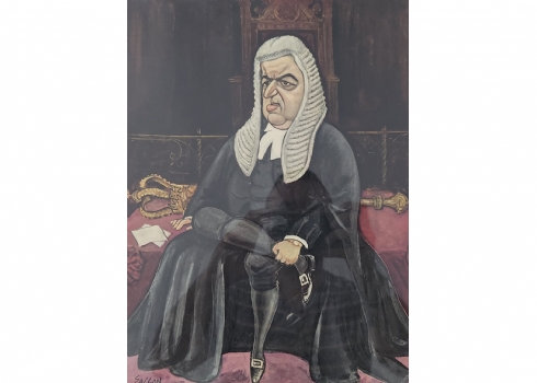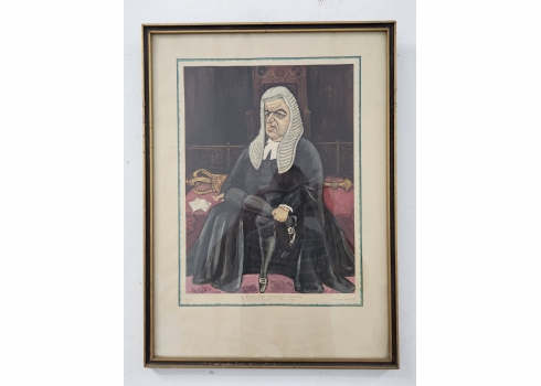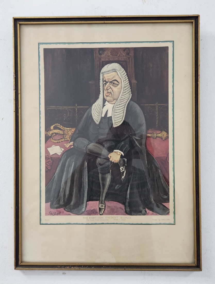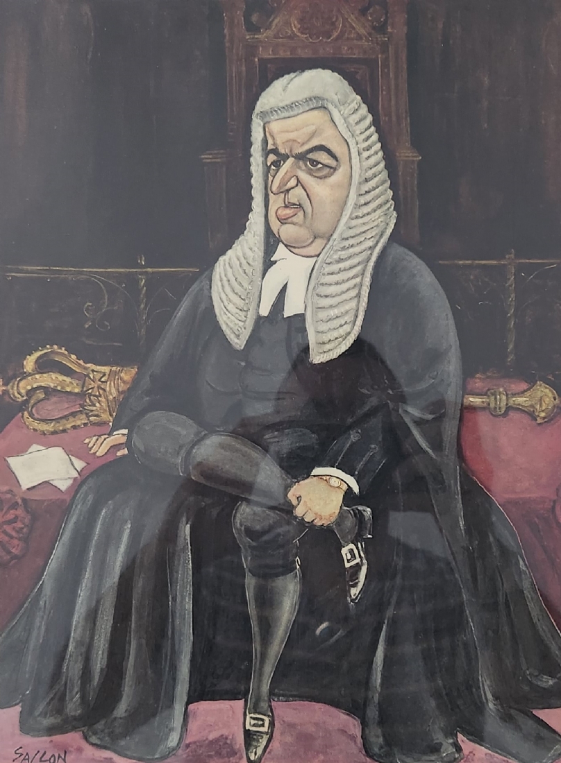 ראלף סאלון, (Ralph Sallon) - 'דיוקנו של סר דייוויד מקסוול פייפ', ליטוגרפיה ישנה, חלק מאוסף קריקטורת דיוקנות של שופטי בית המשפט העליון הבריטי בשנות ה 60, חתום בפלטה, מידות: 38X28 ס"מ, מידות המסגרת: 52.5X39 ס"מ.