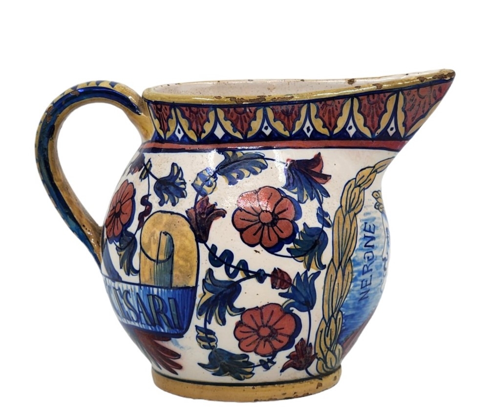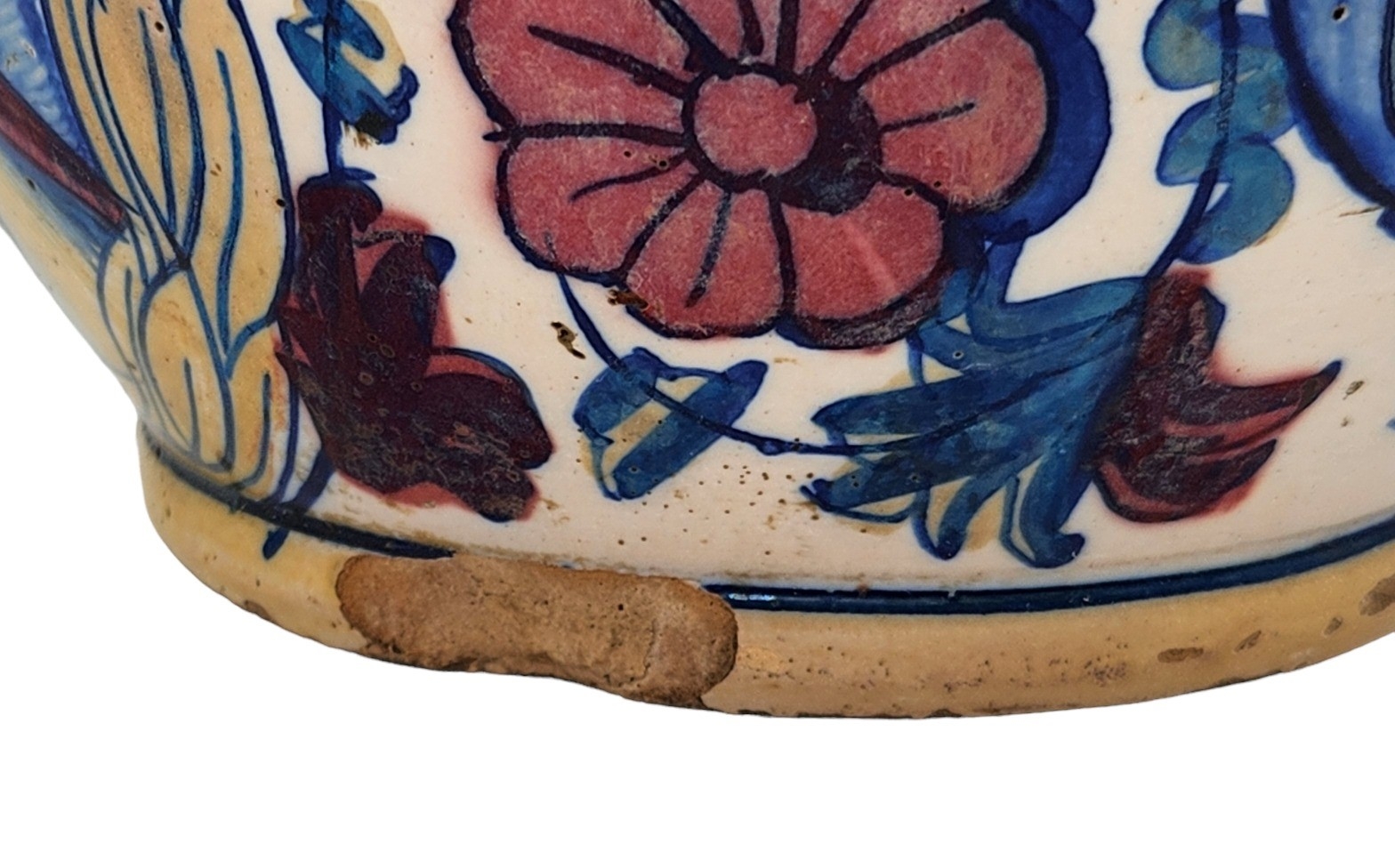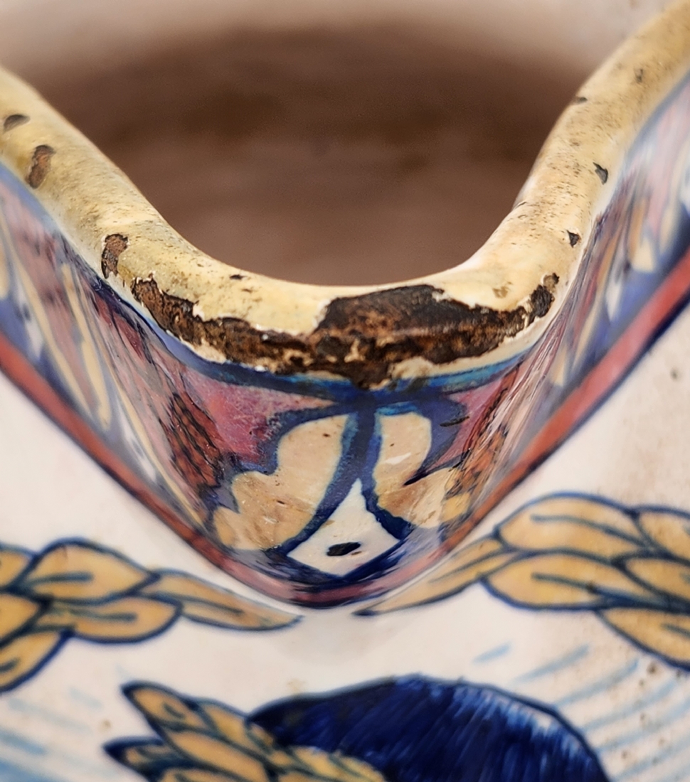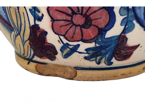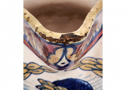 כד חרס ישן ככל הנראה ספרדי, מעוטר בעיטורים אתניים יווניים (צ'יפ בתחתית - מצולם), גובה: 16 ס"מ, רוחב כולל ידית וזרבובית: 21.5 ס"מ.