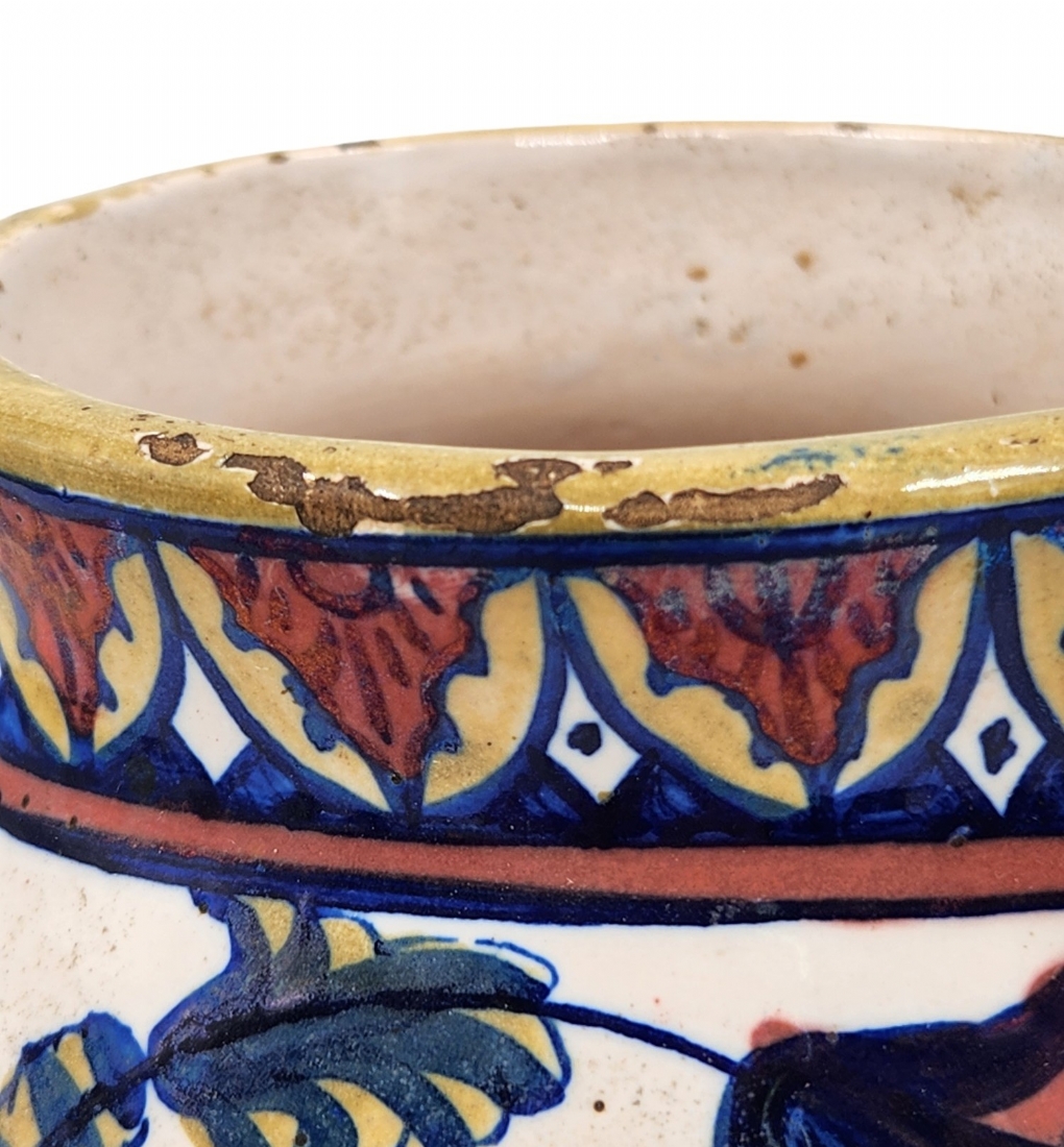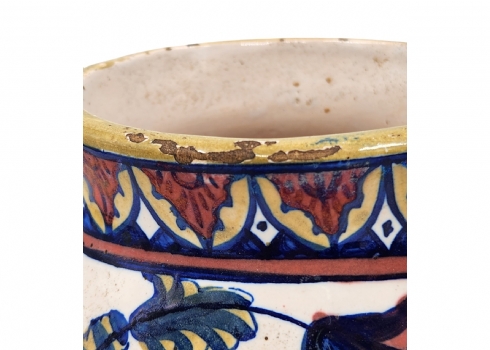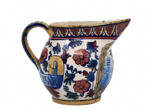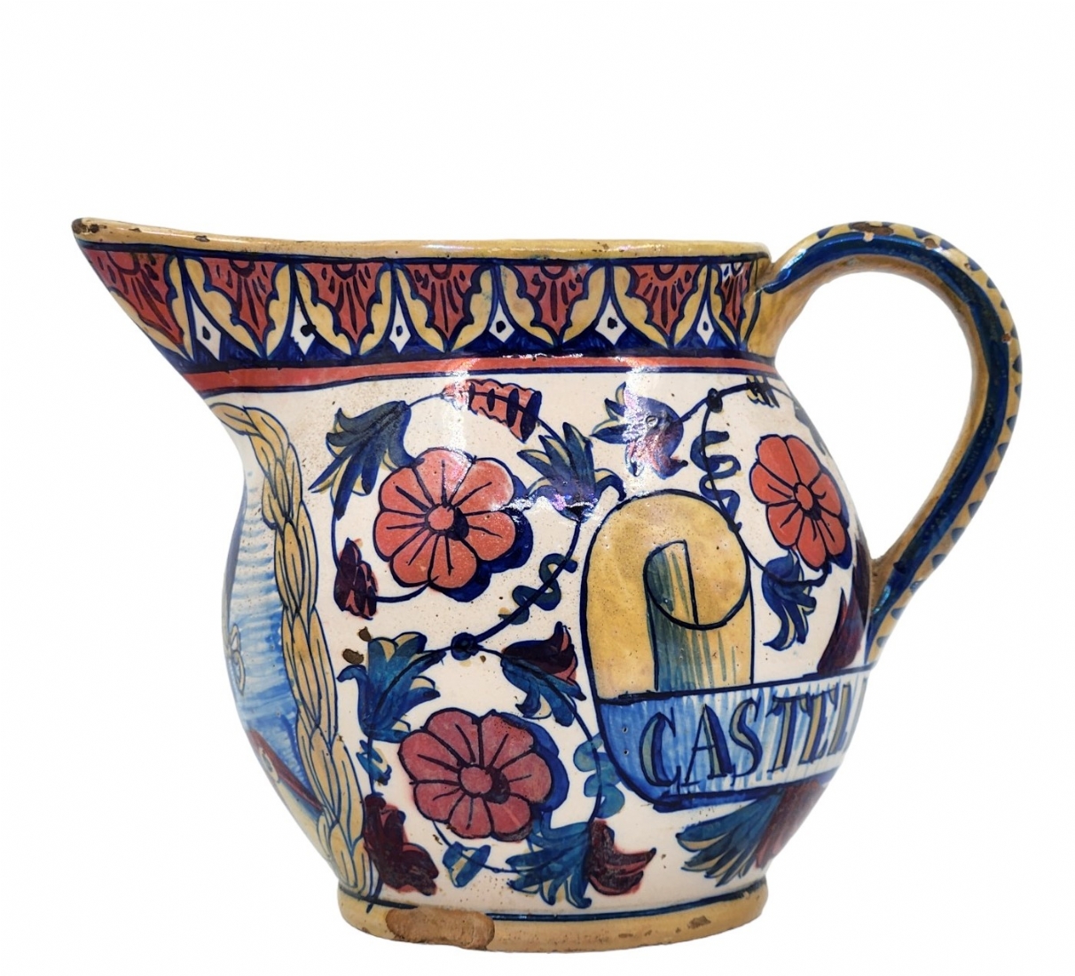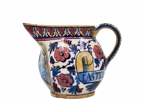 כד חרס ישן ככל הנראה ספרדי, מעוטר בעיטורים אתניים יווניים (צ'יפ בתחתית - מצולם), גובה: 16 ס"מ, רוחב כולל ידית וזרבובית: 21.5 ס"מ.