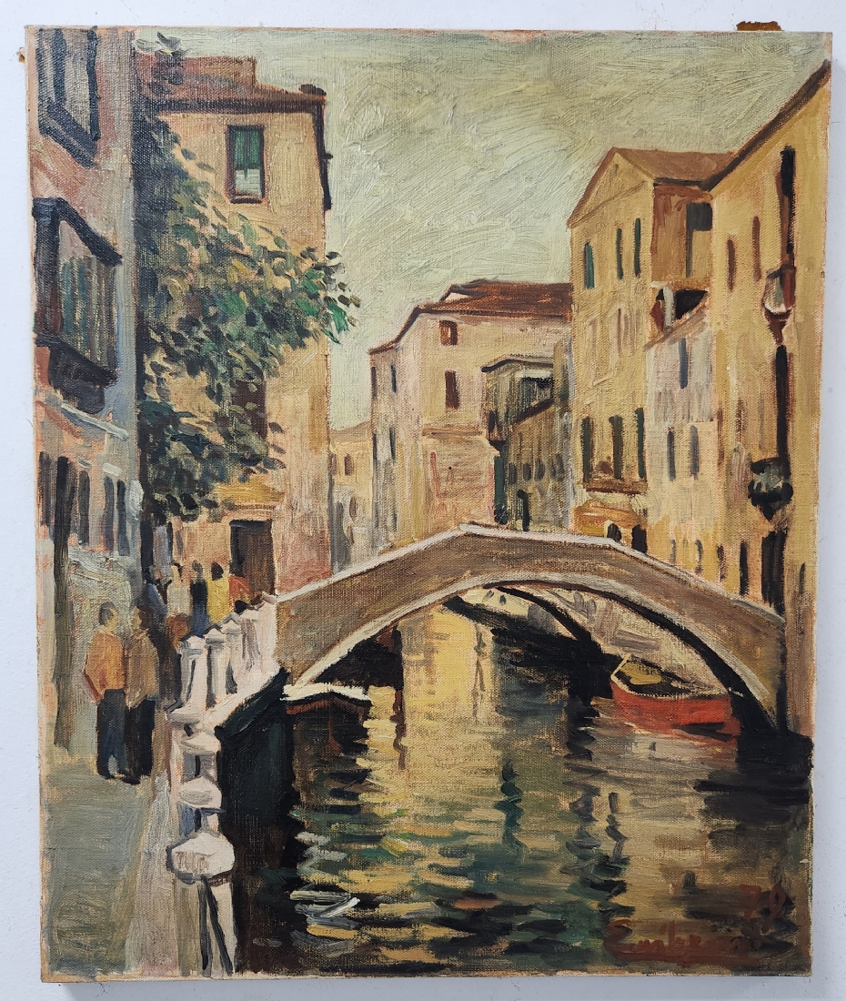 אדגרדו ריביירו (Edgardo Ribeiro, צייר יליד בארטיגאס, אורוגוואי נולד בשנת 1921 ונפטר במונטווידאו, אורוגוואי בשנת 2006) - 'נוף גשר מעל תעלה בוונציה' - שמן על בד, חתום ומתוארך: 1979, מידות: 65X54 ס"מ.