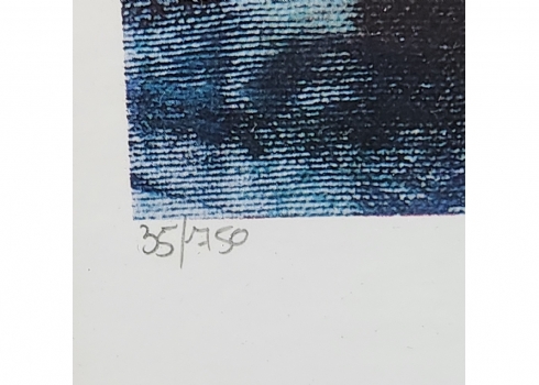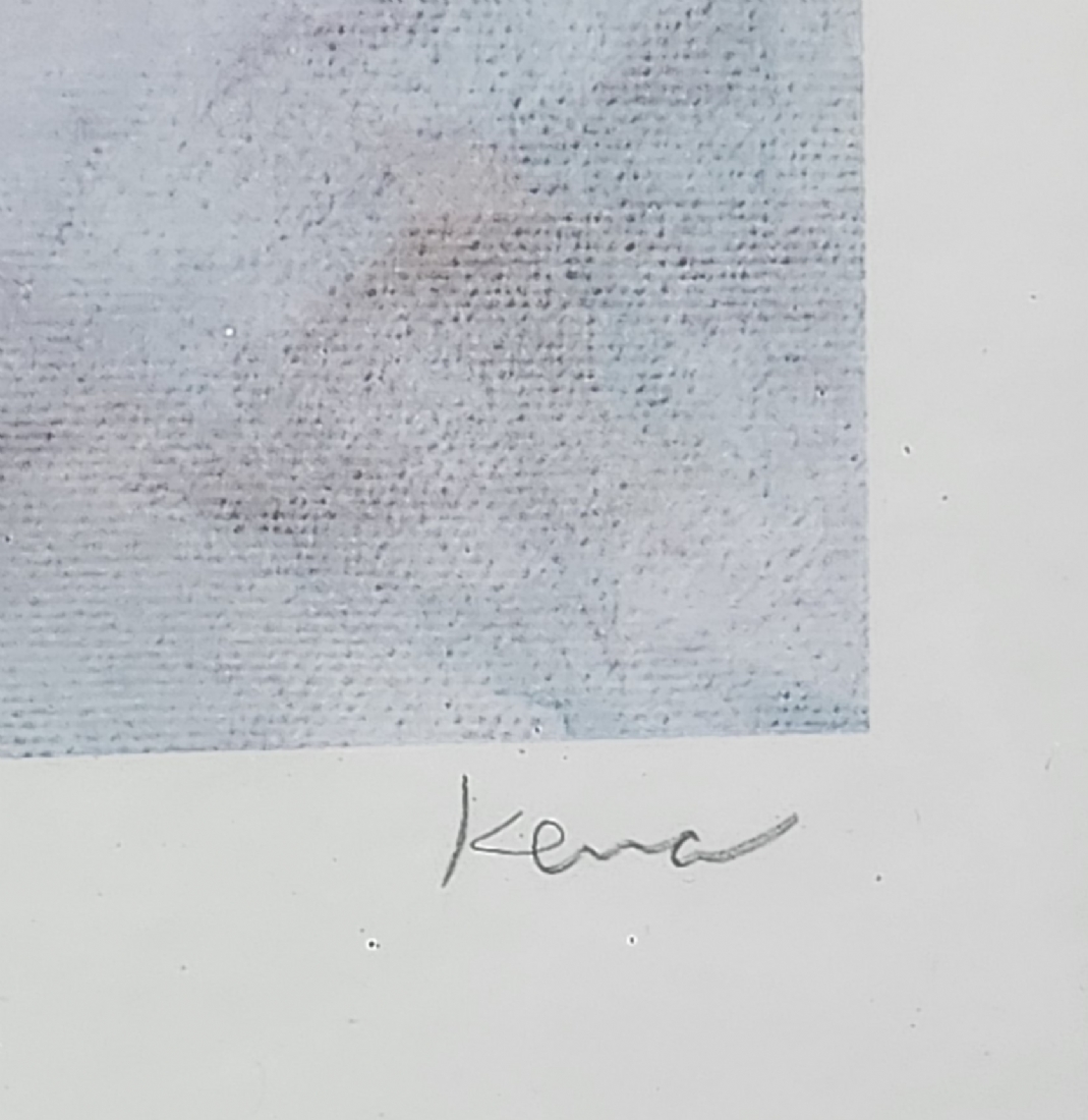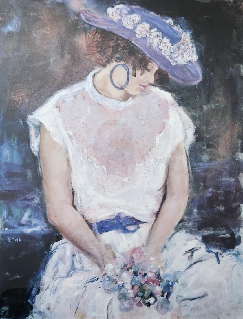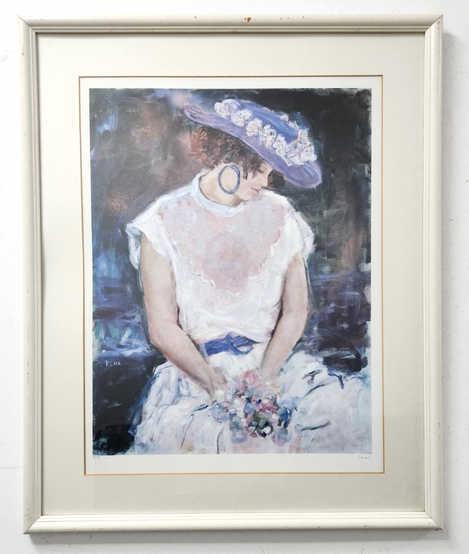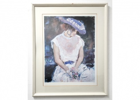 קנה פינקר (Kena Finker) - 'נערה פרחונית', ליטוגרפיה ישנה, חתומה בעיפרון וממוספרת 35/750, מידות: 58X44.5 ס"מ, מידות המסגרת: 81X66 ס"מ.