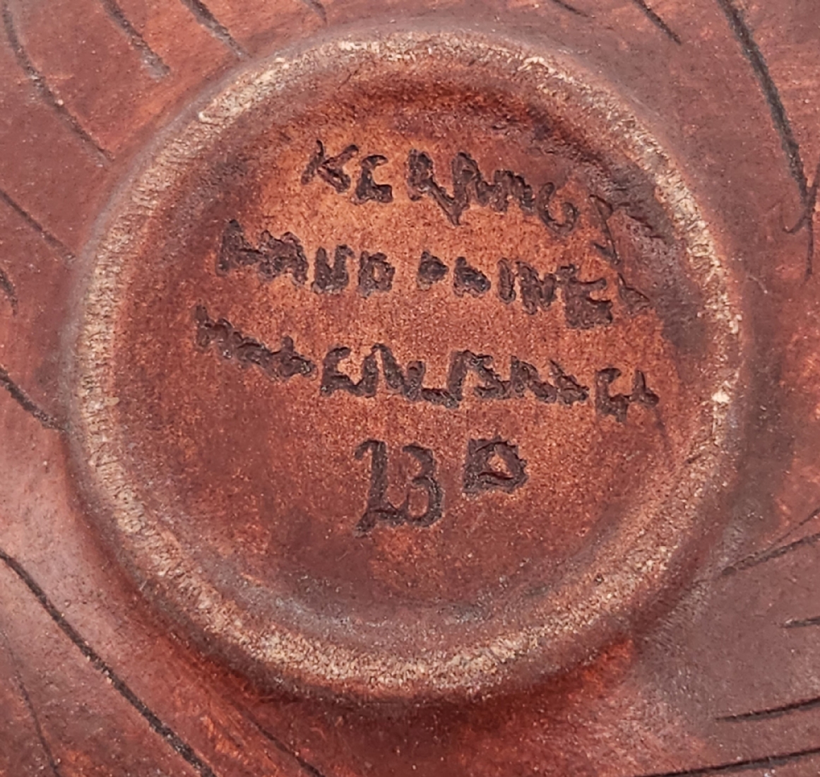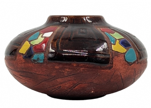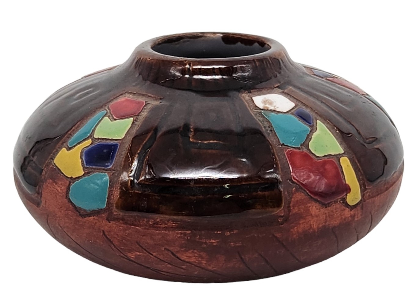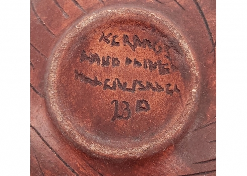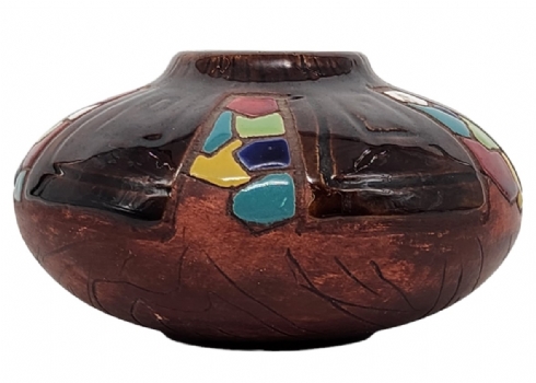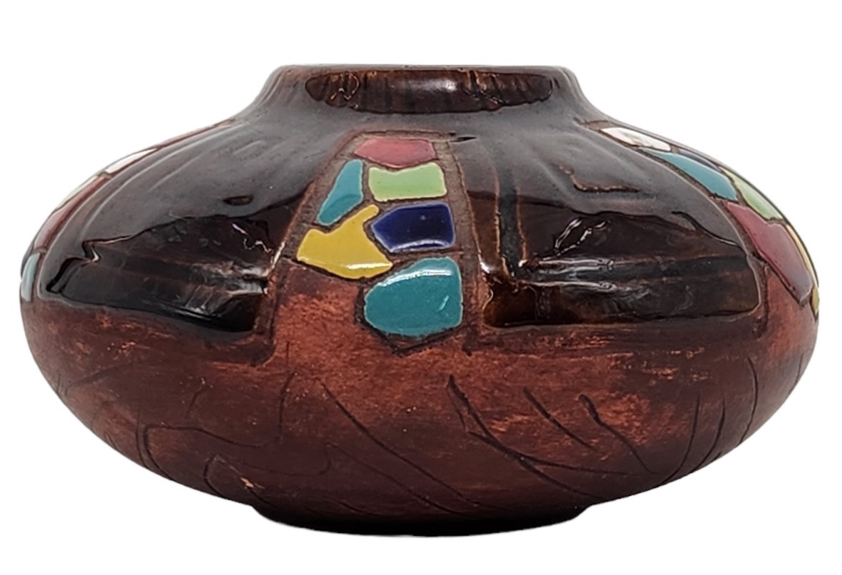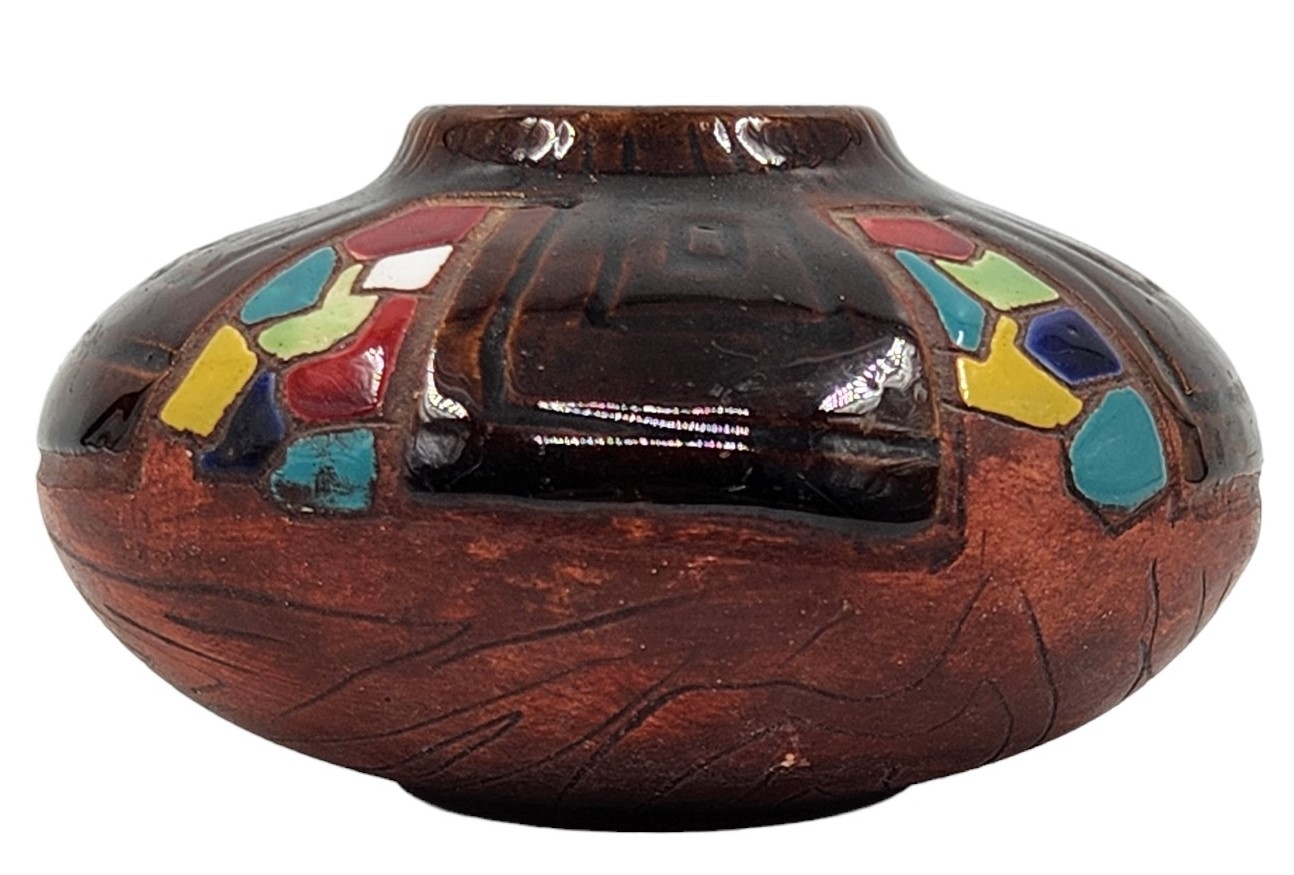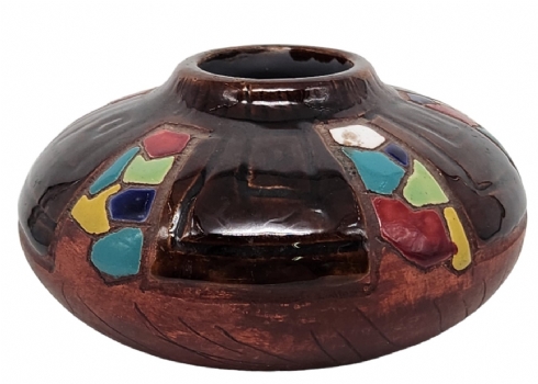 כד קרמיקה ישראלי ישן מתוצרת: 'קרמוס' (Keramos), מעוטר ומזוגג, חתום, גובה: 6 ס"מ, רוחב: 10.5 ס"מ.