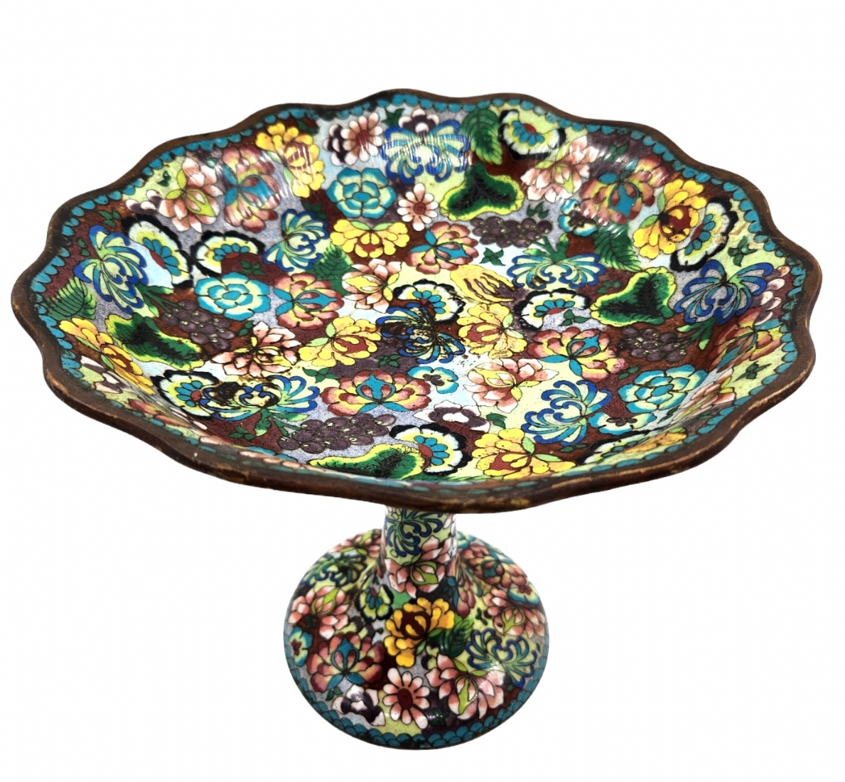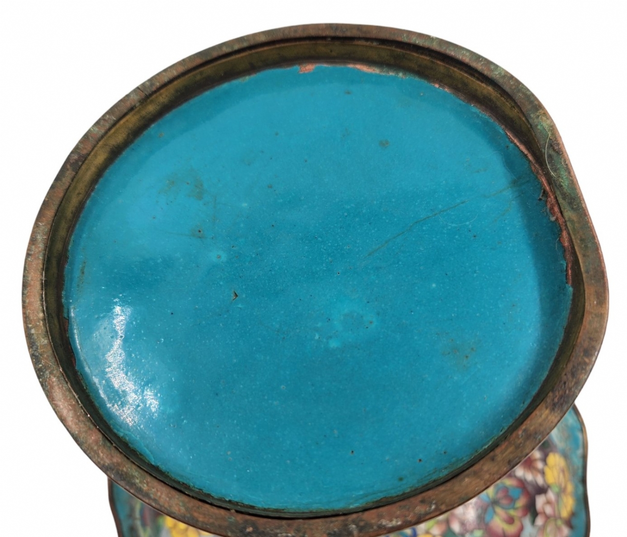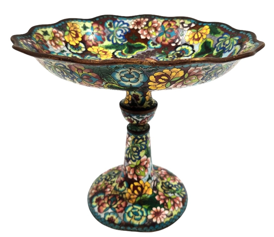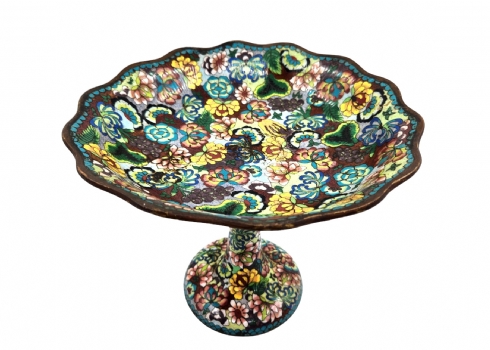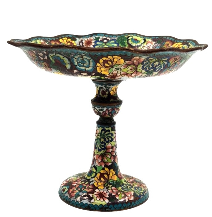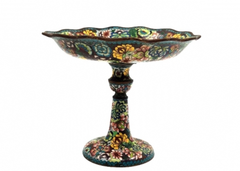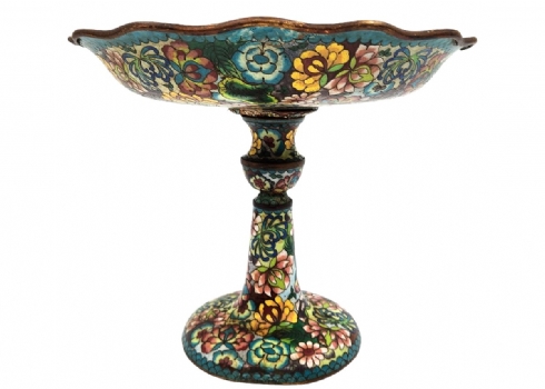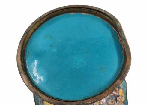 סנטרפיס קלאוזונה (Cloisonné) סיני ישן, עשוי נחושת ומועטר באמייל, סימני חלודה, מצב בהתאם לגיל, תיקון לצוואר, גובה: 22 ס"מ, קוטר מפתח: 26 ס"מ.