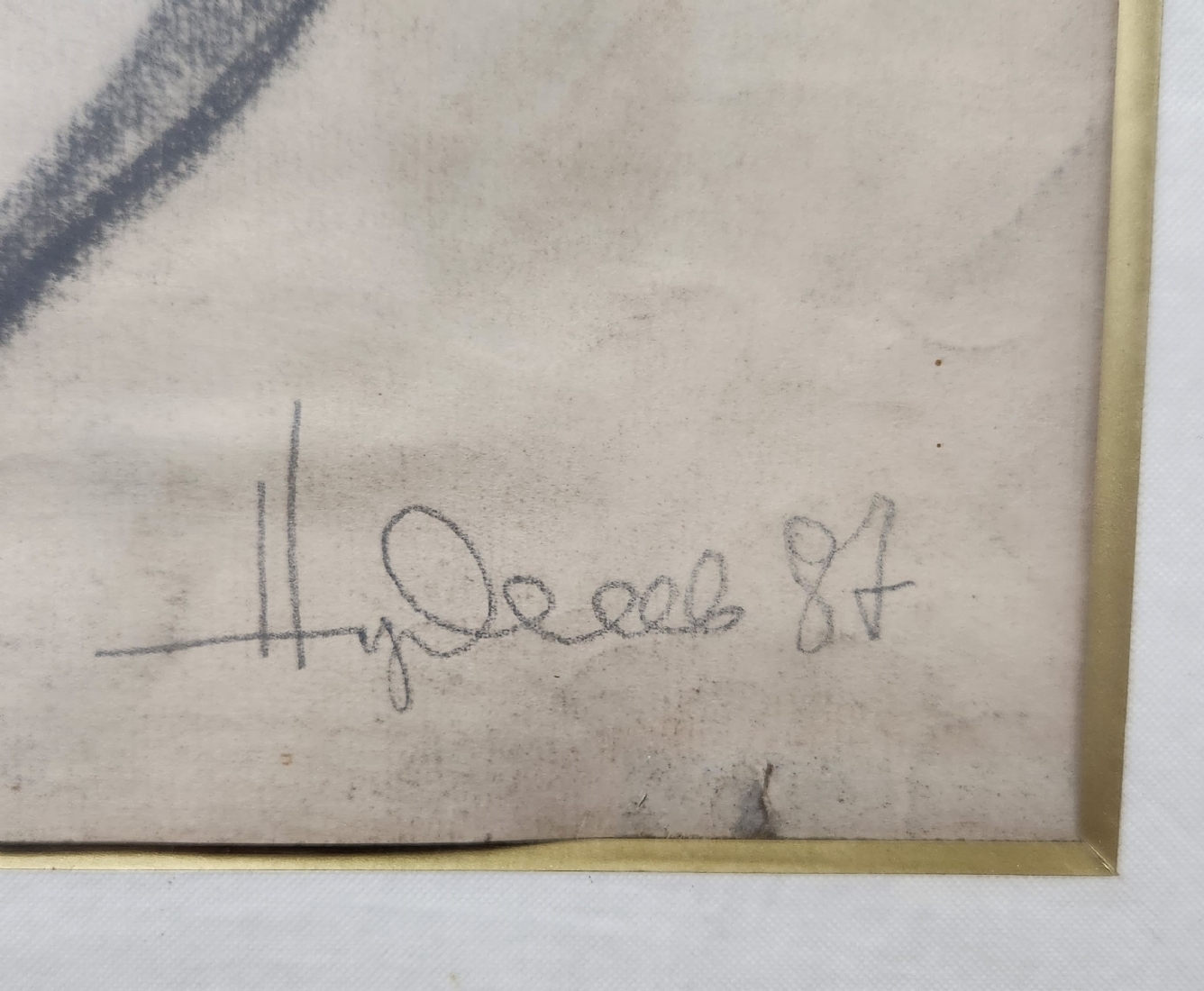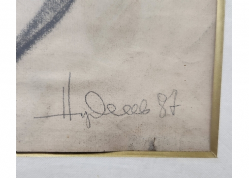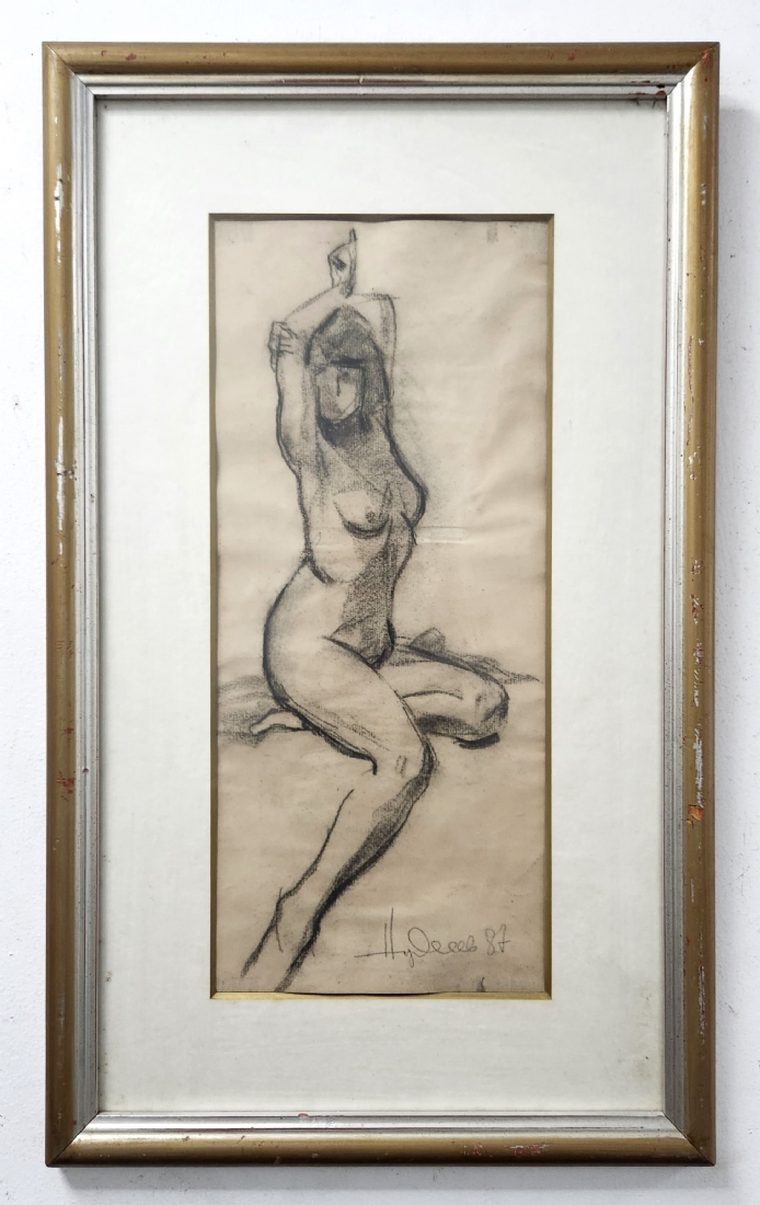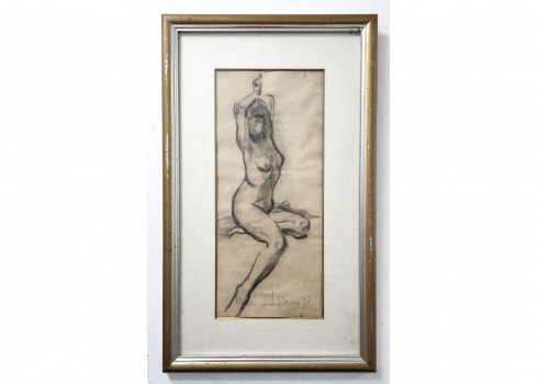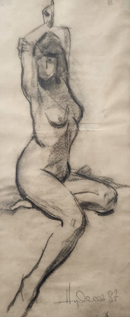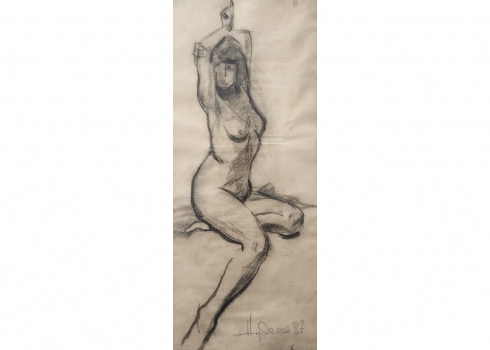 'ערום נשי מתמתחת' - רישום פחם על נייר, חתום (נשמח לעזרה בזיהוי האמן) ומתוארך: 1987, מידות: 50X22 ס"מ, 70X42 ס"מ.