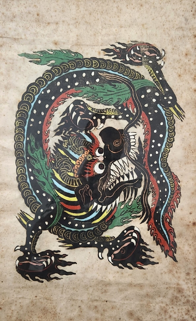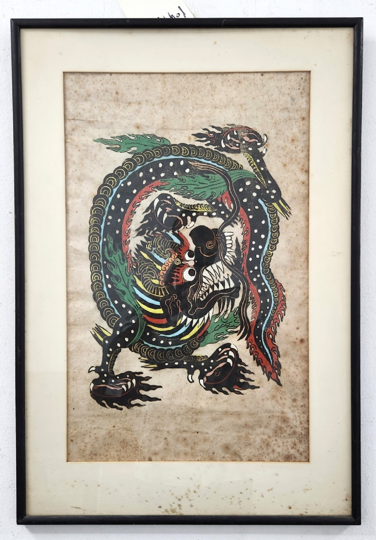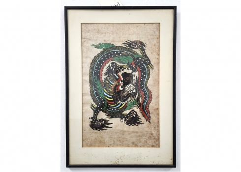 תמונה סינית ישנה, גואש על נייר מודפס (לנייר קמטוטים וכתמים), לא חתום, מידות: 30.5X53.5 ס"מ, מידות המסגרת: 47.5X69.5 ס"מ.