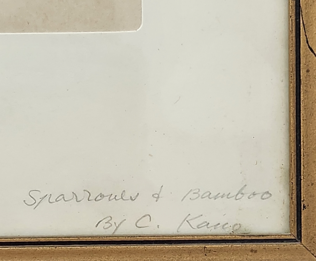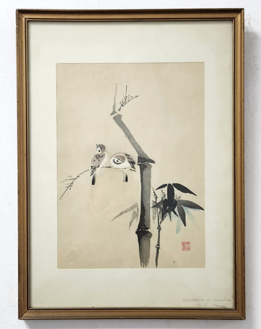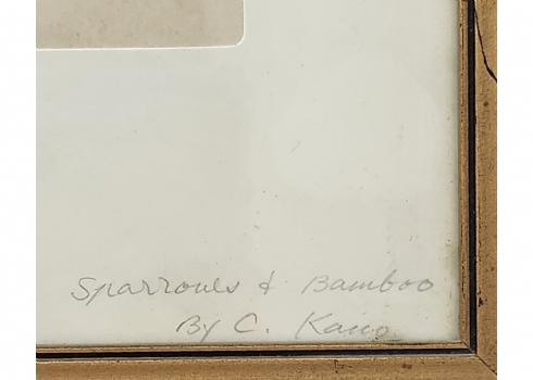 'דרורים על גבעול במבוק' - ציור סיני ישן, אקוורל על נייר, חתום ונושא את שם היצירה בעיפרון, מידות: 26X19 ס"מ, מידות המסגרת: 39X285 ס"מ.
