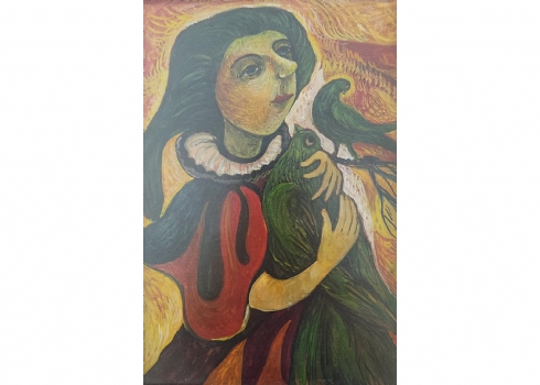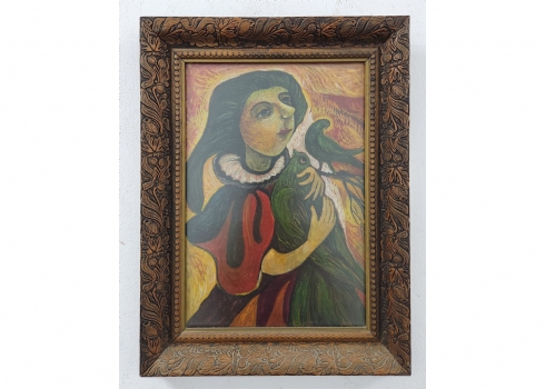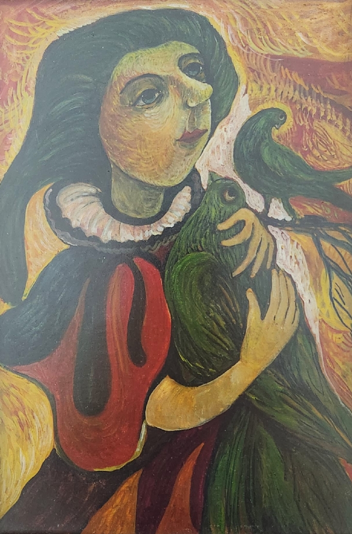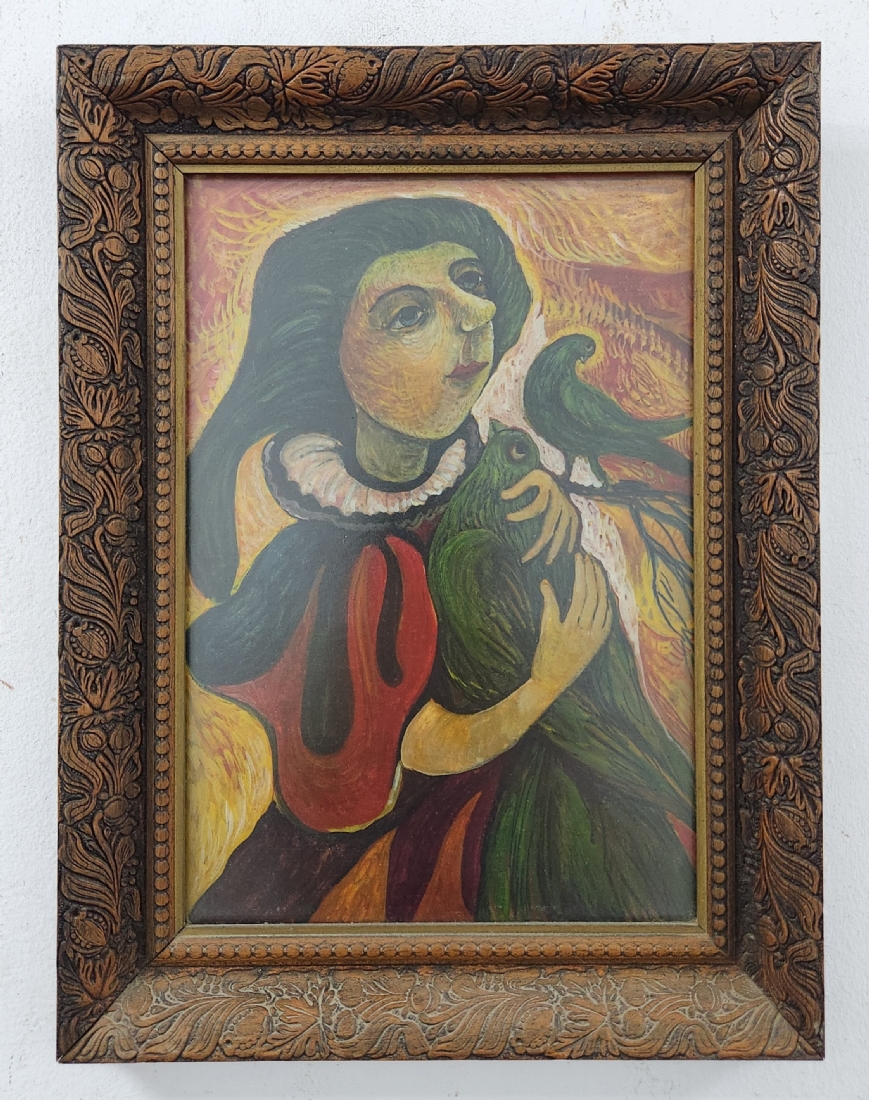 אולנה בורדאש (Olena Burdash) - 'הלוחשת לעופות', שמן על נייר, לא חתום, מידות: 32X22 ס"מ, מידות המסגרת: 41X31 ס"מ.