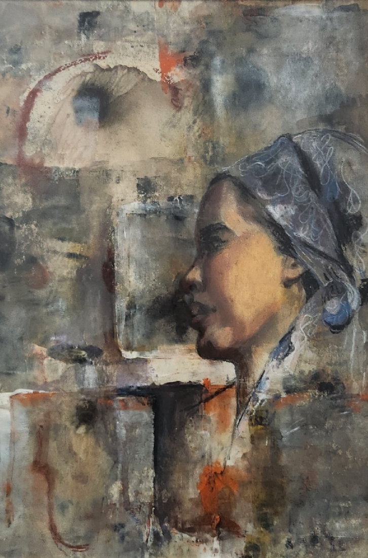 'אישה בשביס כחול' - ציור ישן ואיכותי, כפי הנראה אסייתי, אקוורל וגואש על נייר