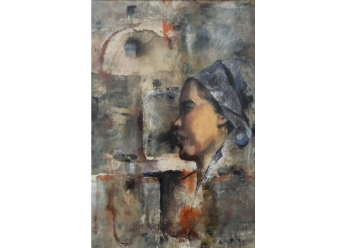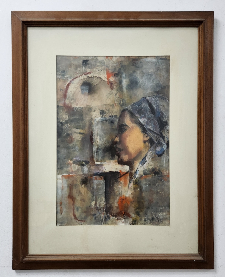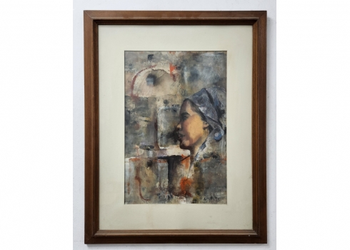 'אישה בשביס כחול' - ציור ישן ואיכותי, כפי הנראה אסייתי, אקוורל וגואש על נייר, לא חתום, אמן לא ידוע, מידות: 47X32 ס"מ, מידות המסגרת: 71X56 ס"מ.