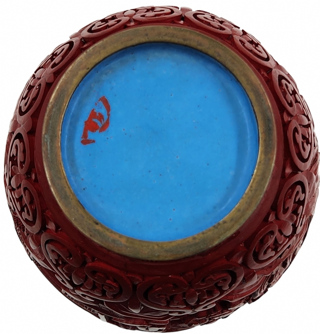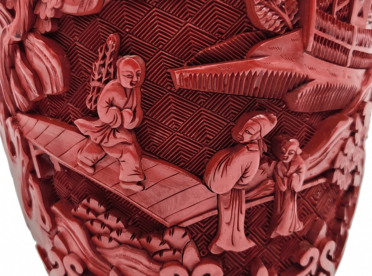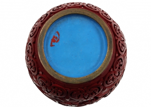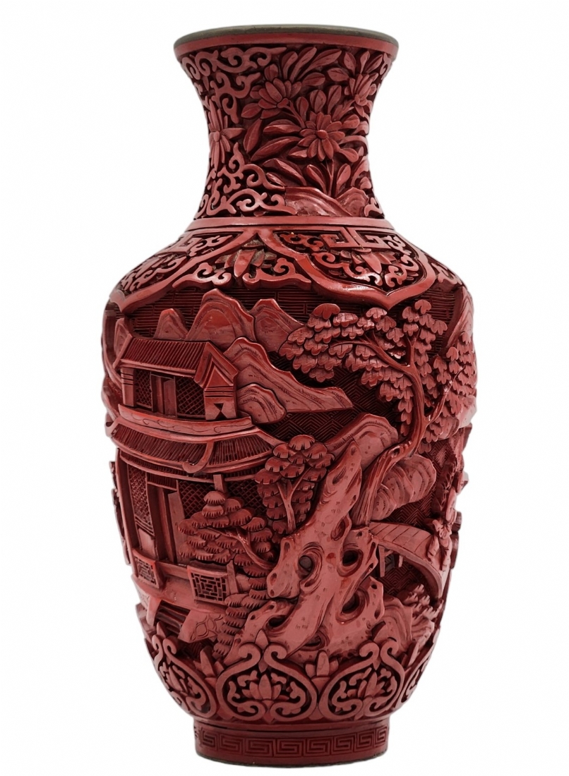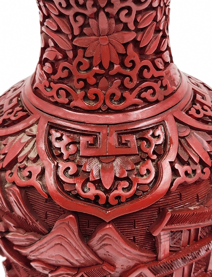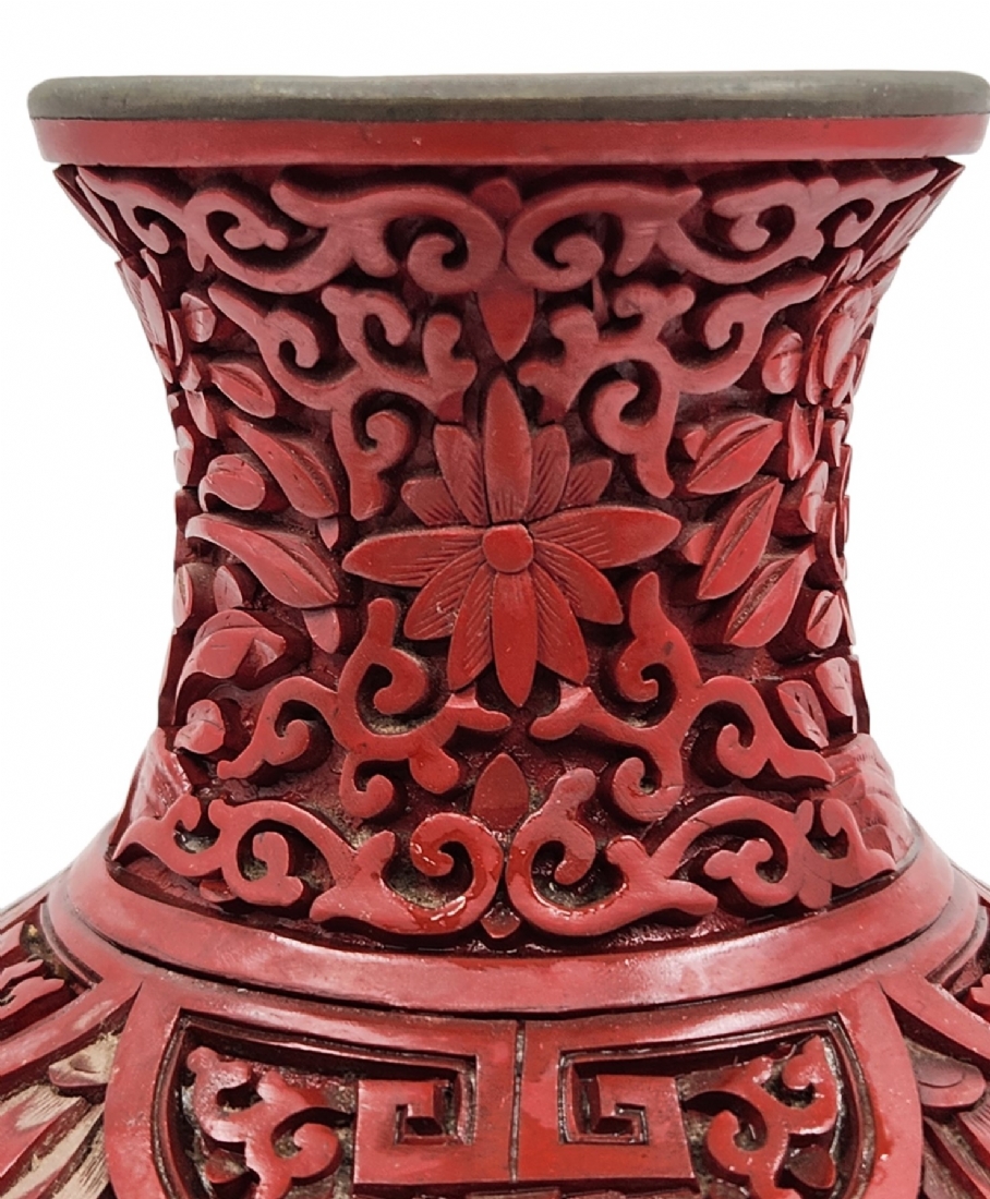 אגרטל לכה סיני ישן, עשוי נחושת, מעוטר לכה אדומה מסוג 'Red Cinnabar' ואמייל בגוון