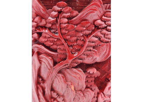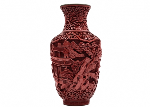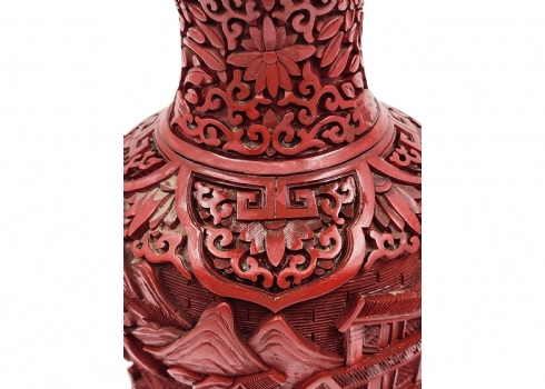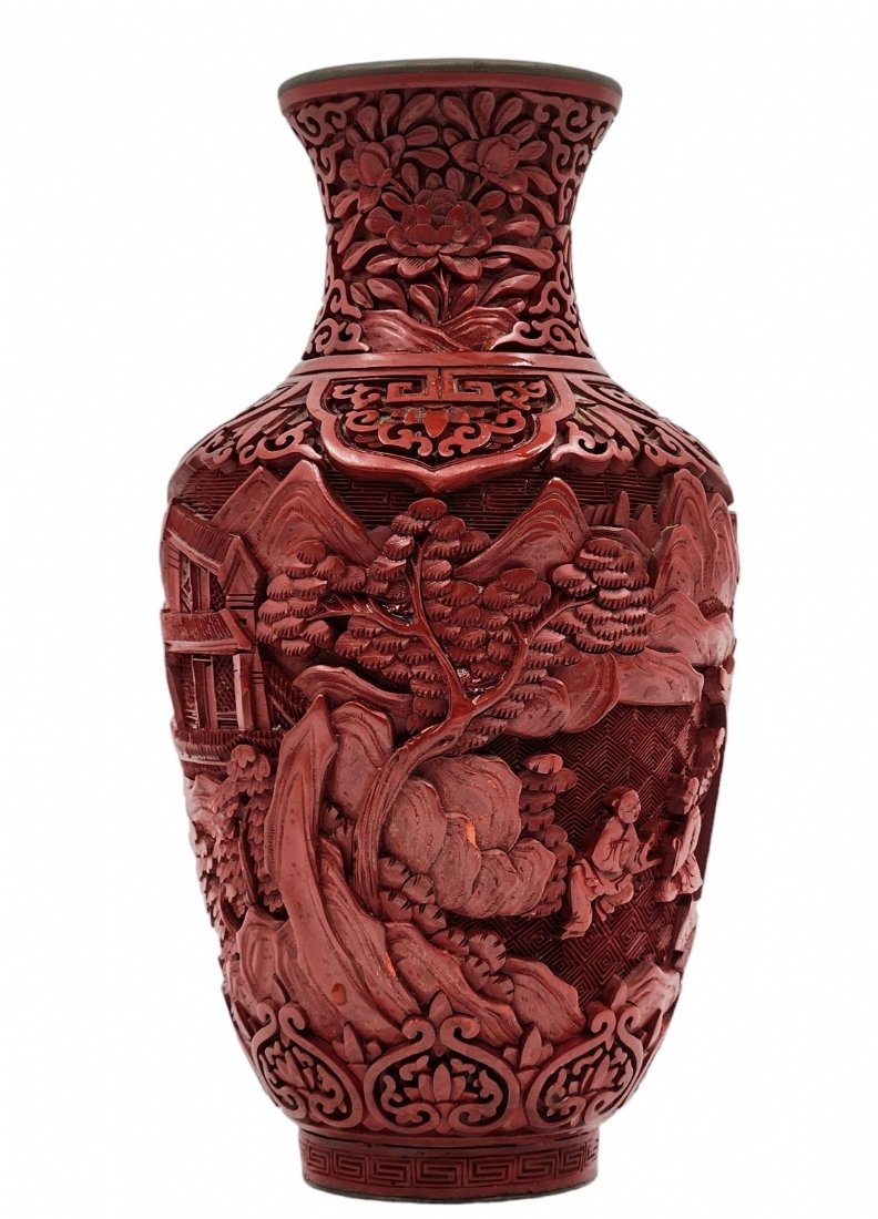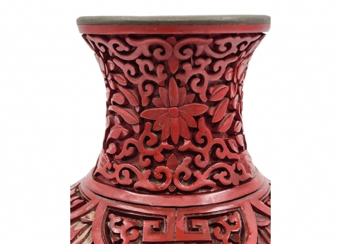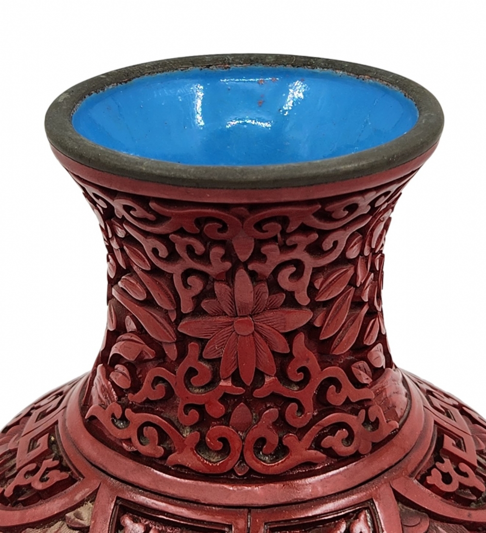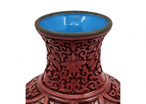 אגרטל לכה סיני ישן, עשוי נחושת, מעוטר לכה אדומה מסוג 'Red Cinnabar' ואמייל בגוון כחול, גובה: 23.5 ס"מ.
