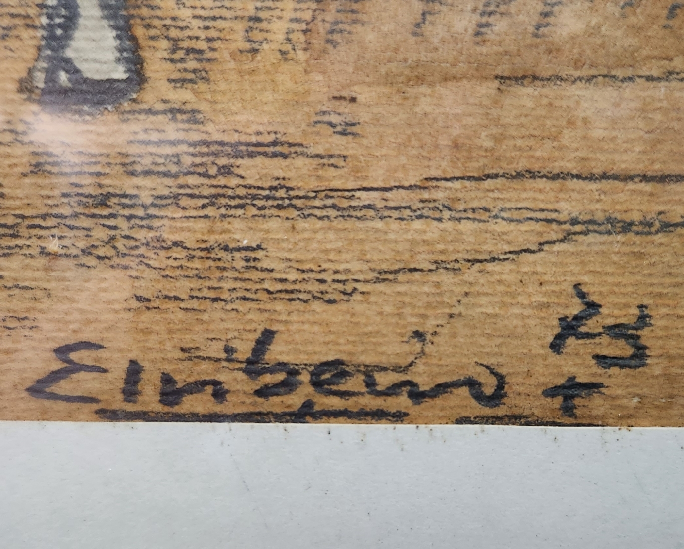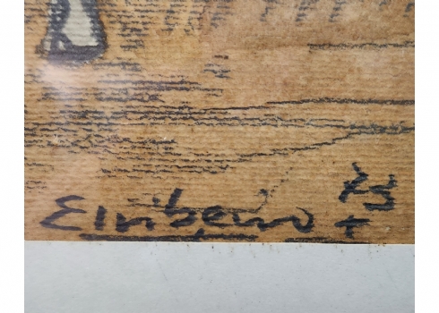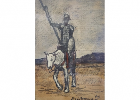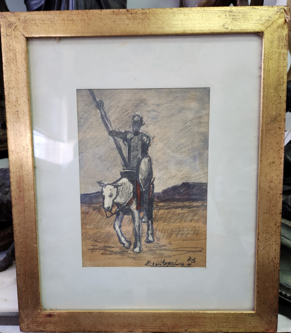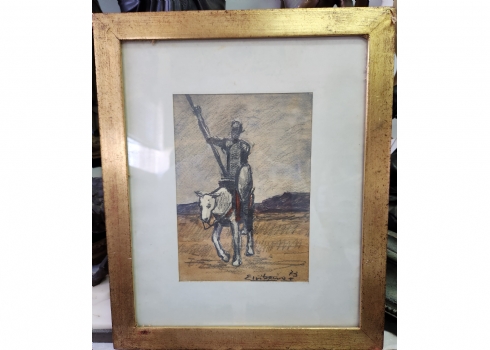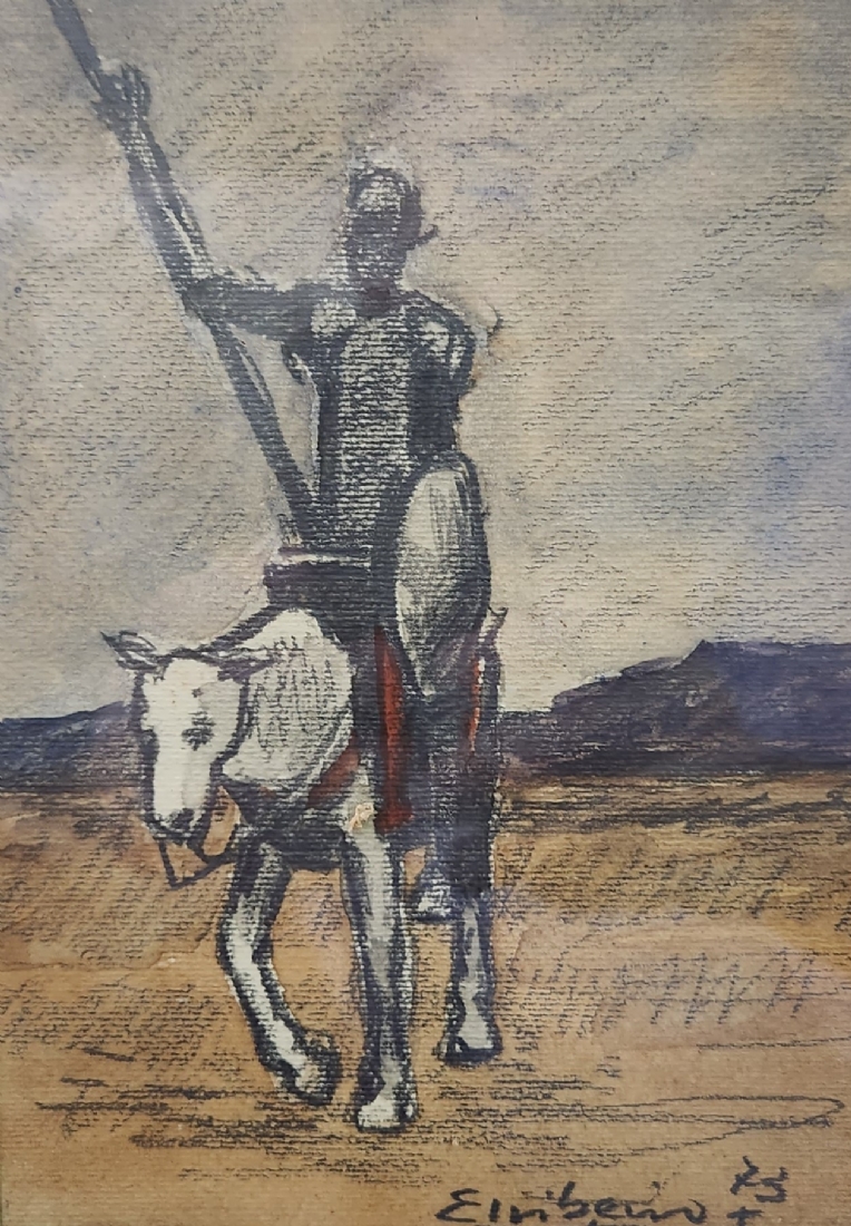 אדגרדו ריביירו (Edgardo Ribeiro, צייר יליד בארטיגאס, אורוגוואי נולד בשנת 1921 ונפטר במונטווידאו, אורוגוואי בשנת 2006) - 'דון קישוט' - טכניקה מעורבת על נייר, חתום ומתוארך: 193, מידות: 19X13.5 ס"מ, מידות המסגרת: 34X28.5 ס"מ.
