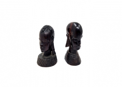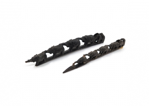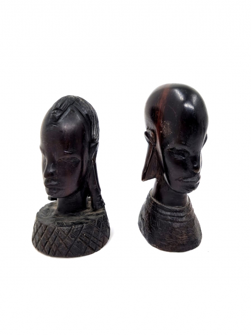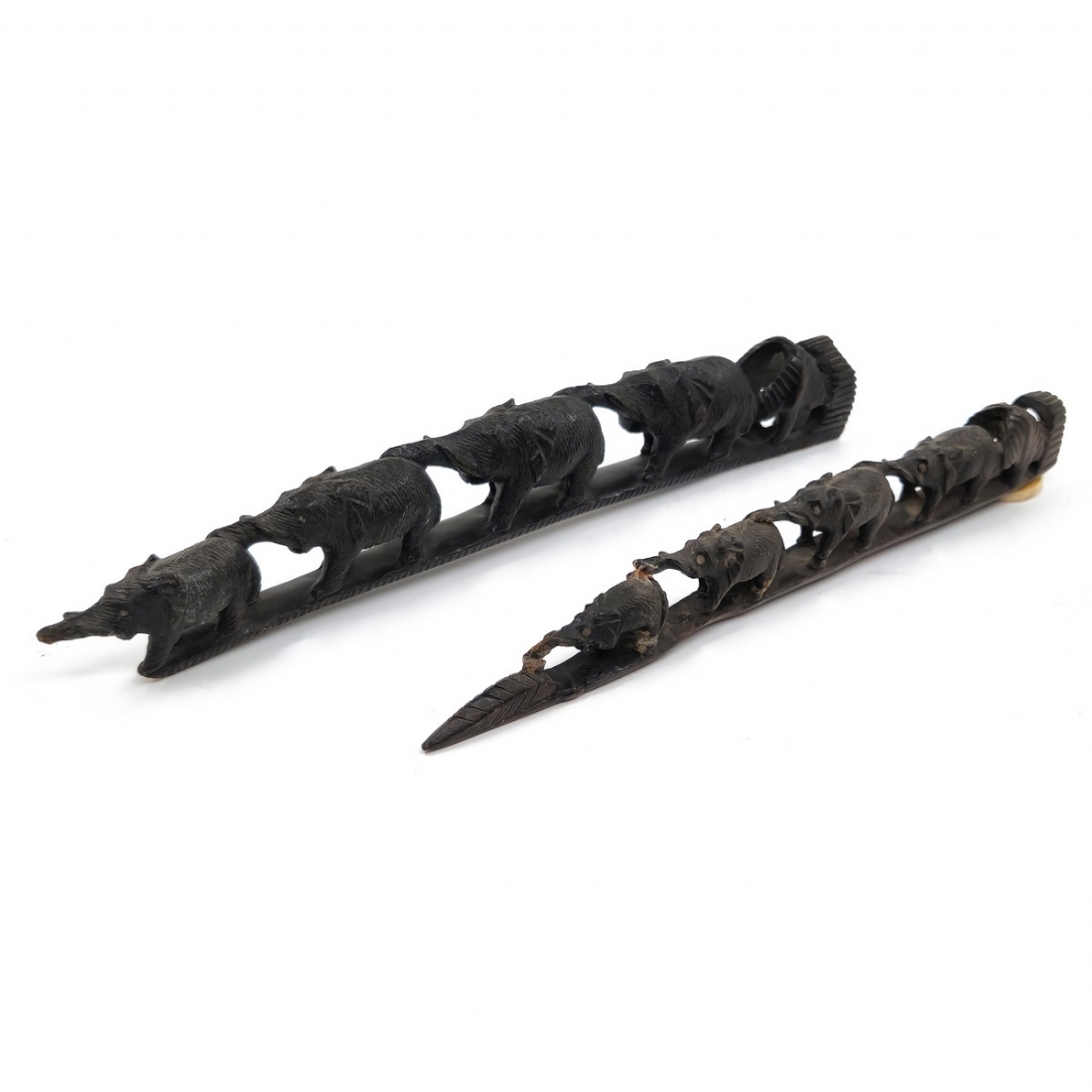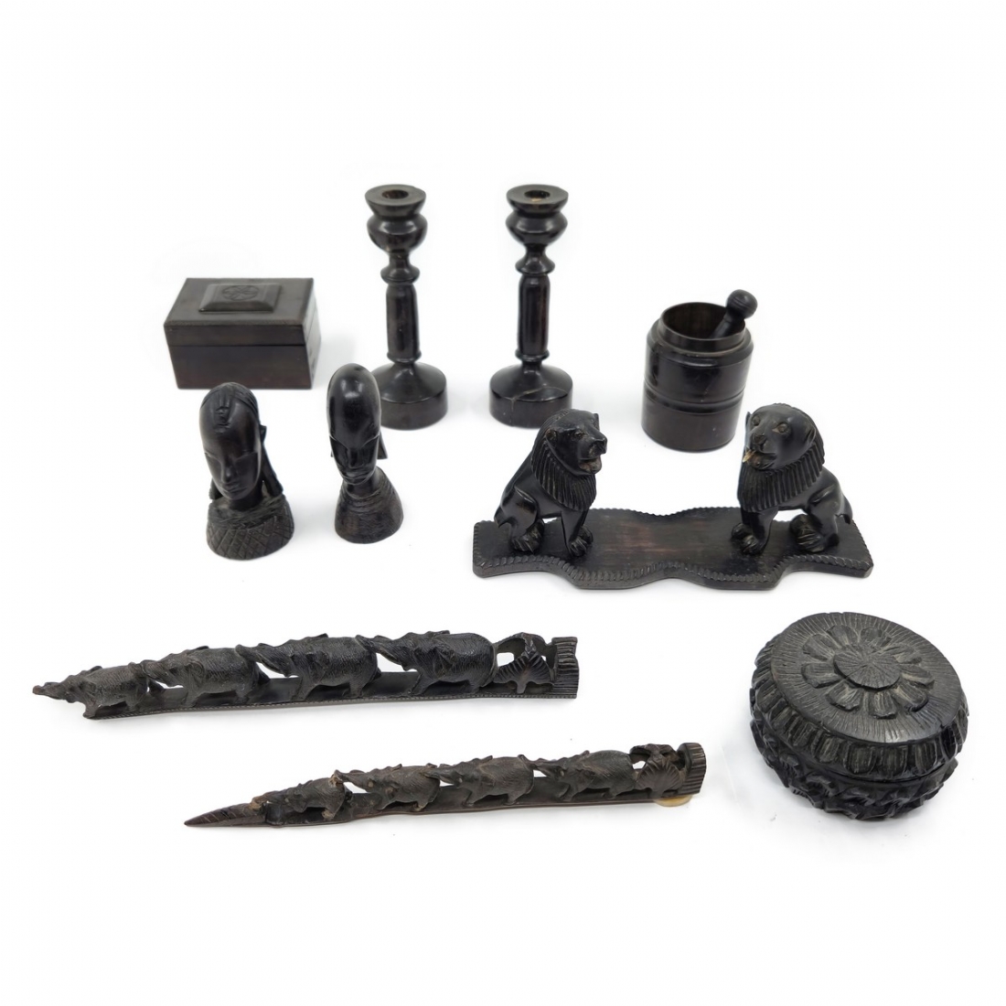 לוט של 10 פריטי נוי אפריקאים מעץ (תיקון ישן לפמוט וחסר בשרשרת הפילים), גובה הפמוט: 16 ס"מ, אורך שרשרת הפילים: 25.5 ס"מ.