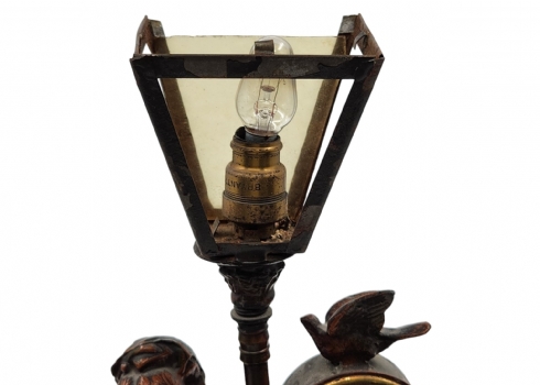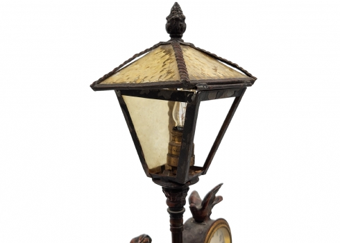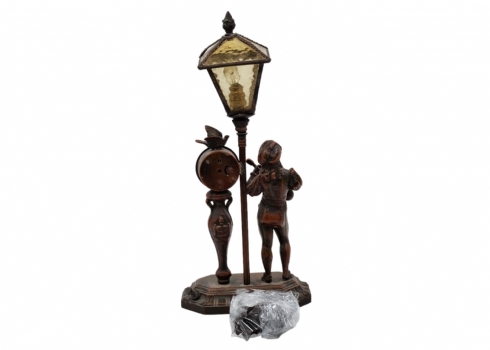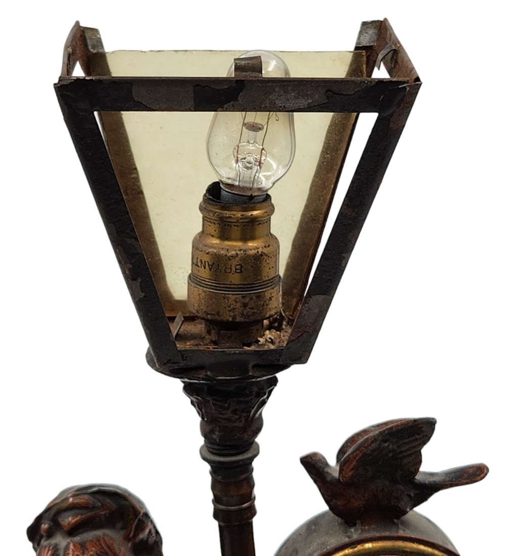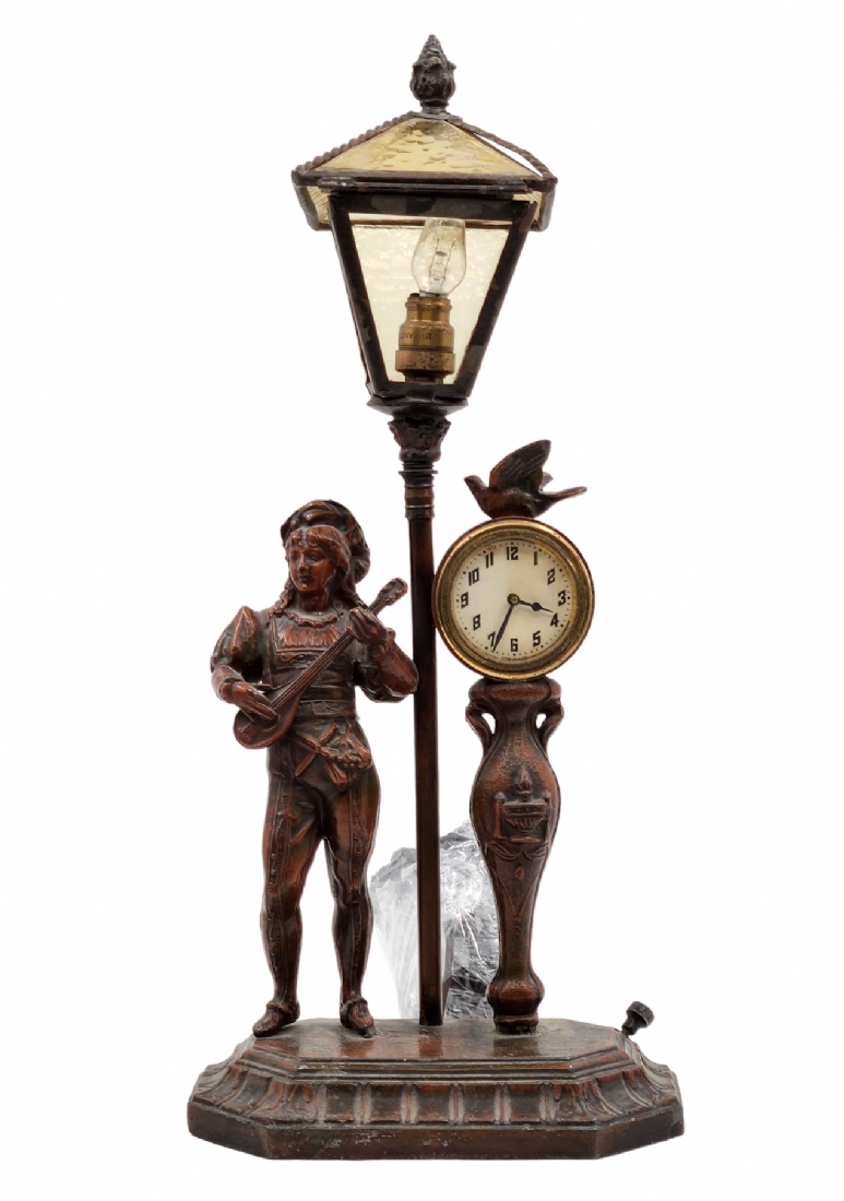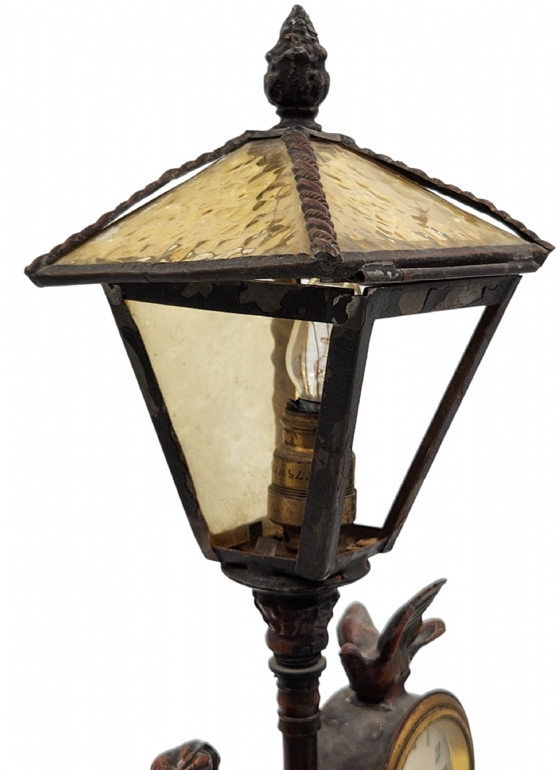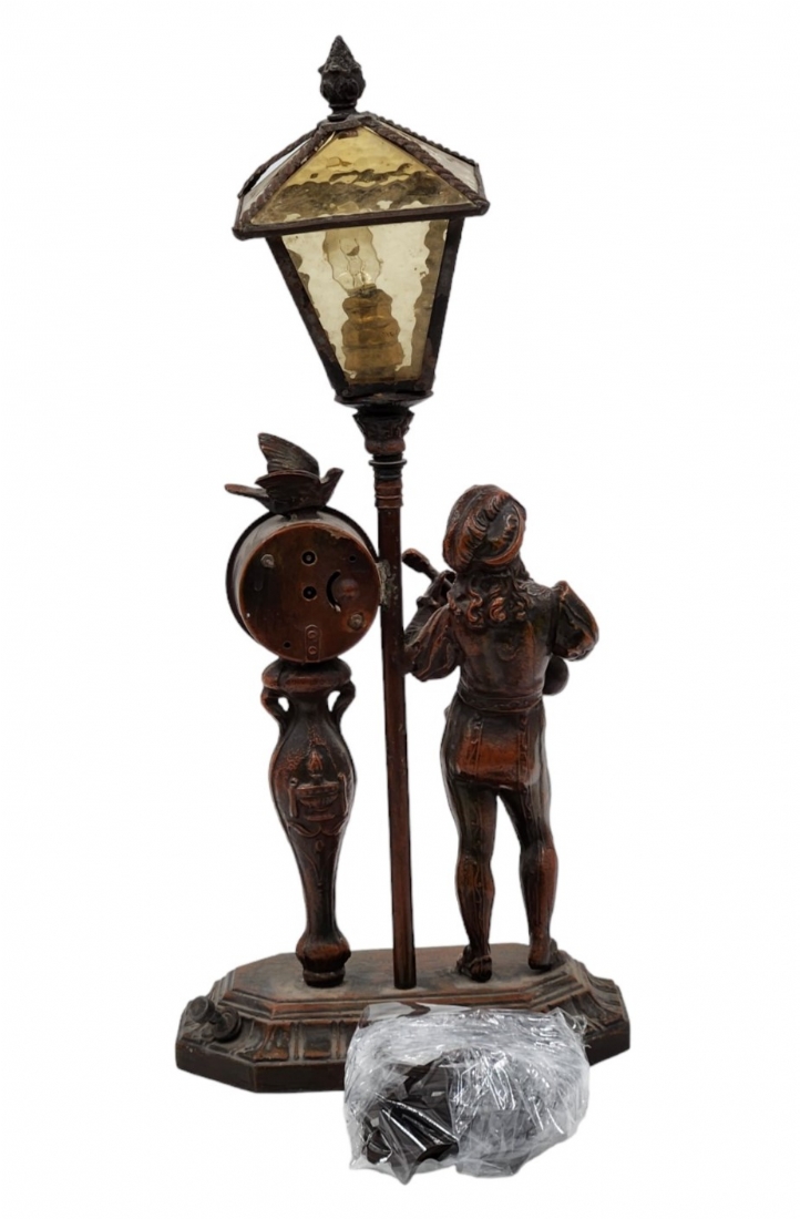 מנורת שולחן ישנה, נושאת שעון מקושטת בדמות אציל, עשויה חומר יצוק, מתכת וזכוכית (דפנות האהיל מפורקות), גובה: 34 ס"מ, רוחב הבסיס: 19 ס"מ.*לא נבדק מצב עבודה.