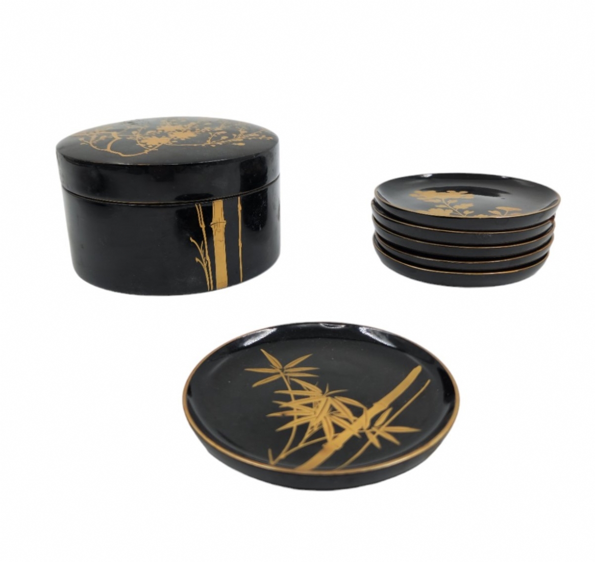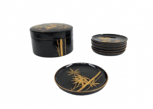 תחתיות סיניות מעוטרות בזהב על רקע לכה שחורה.