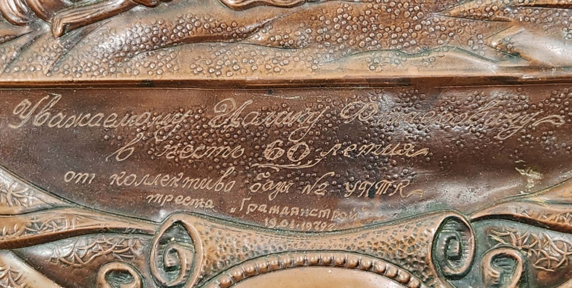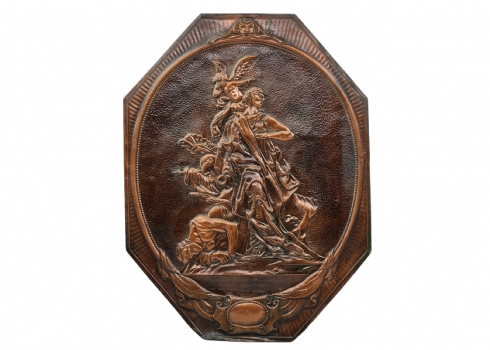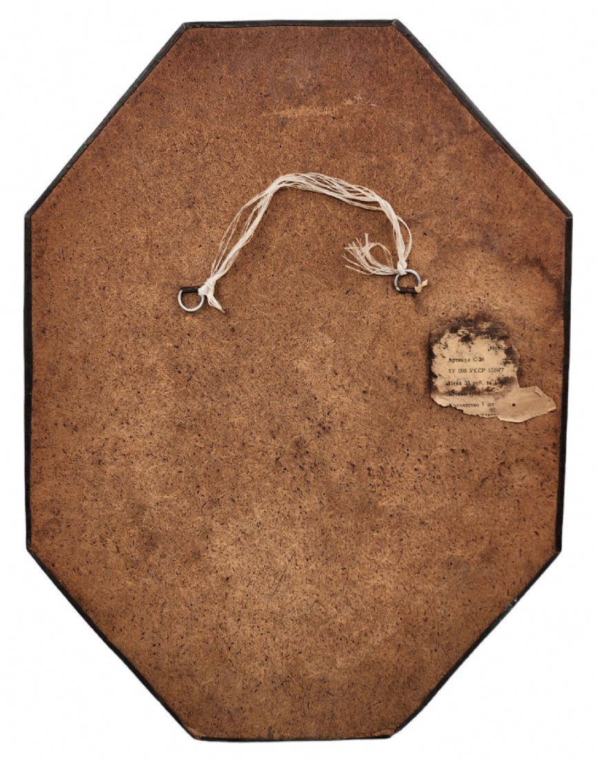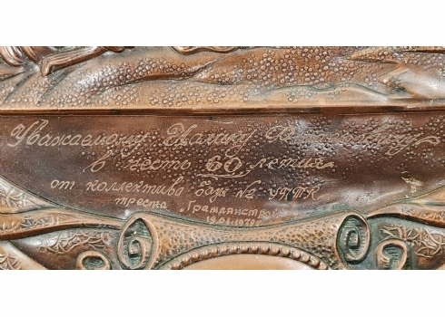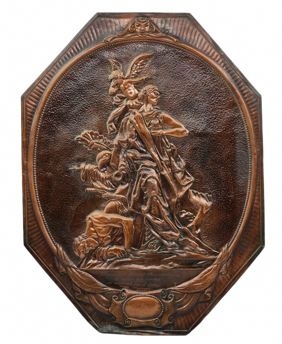 'תבליט נחושת רוסי (סובייטי) מתומן, ישן ויפה, נושא בחזיתו הקדשה, רוחב: 38 ס"מ, גובה: 50.5 ס"מ.