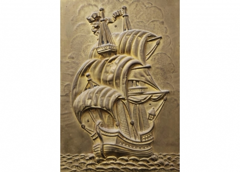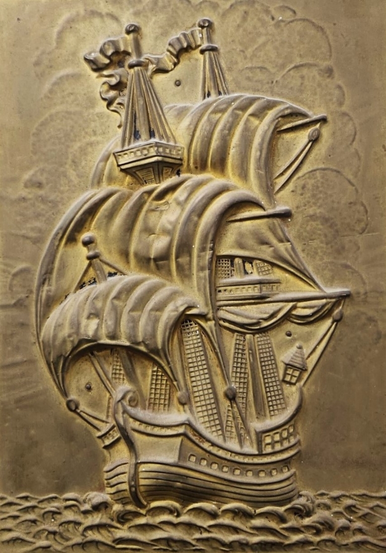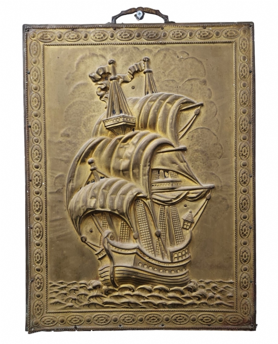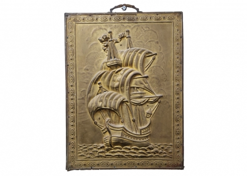 תבליט נחושת ישן, כפי הנראה הולנדי, מרוקע בדגם ספינה, מוצמד ללוח עץ, מצב בהתאם לגיל (חוסר בשול תחתון) , מידות: 50X38 ס"מ.