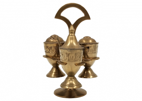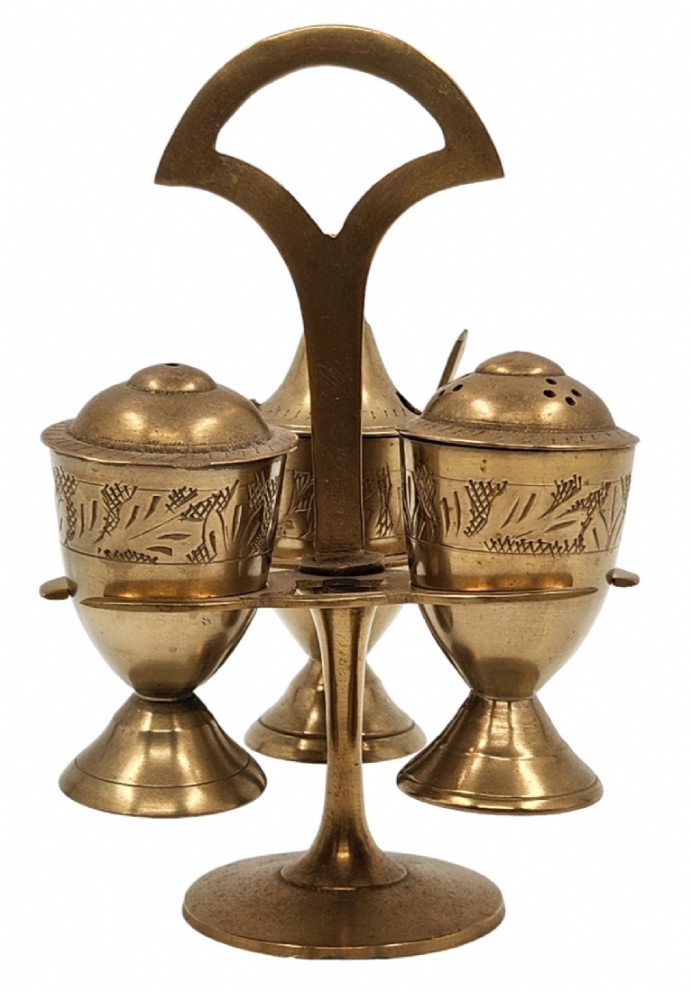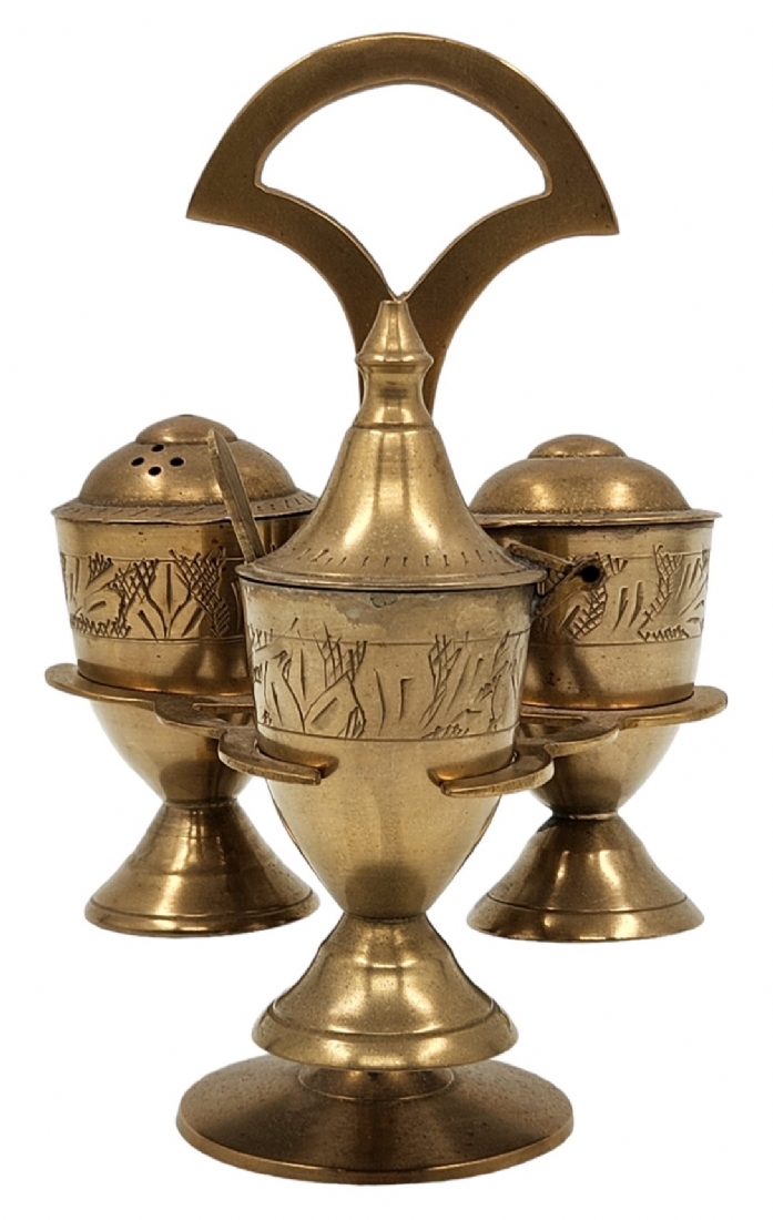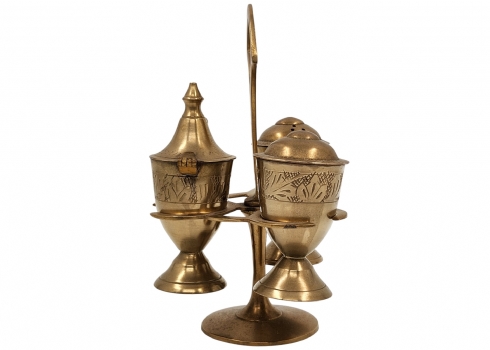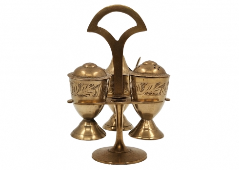 סט פליז ישן לתבלינים, כולל, פלפליה, מלחייה, כלי לסוכר ומעמד תואם, גובה המעמד: 16 ס"מ, גובה מלחייה: 8 ס"מ.