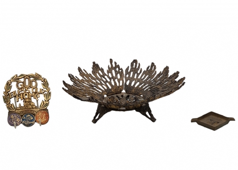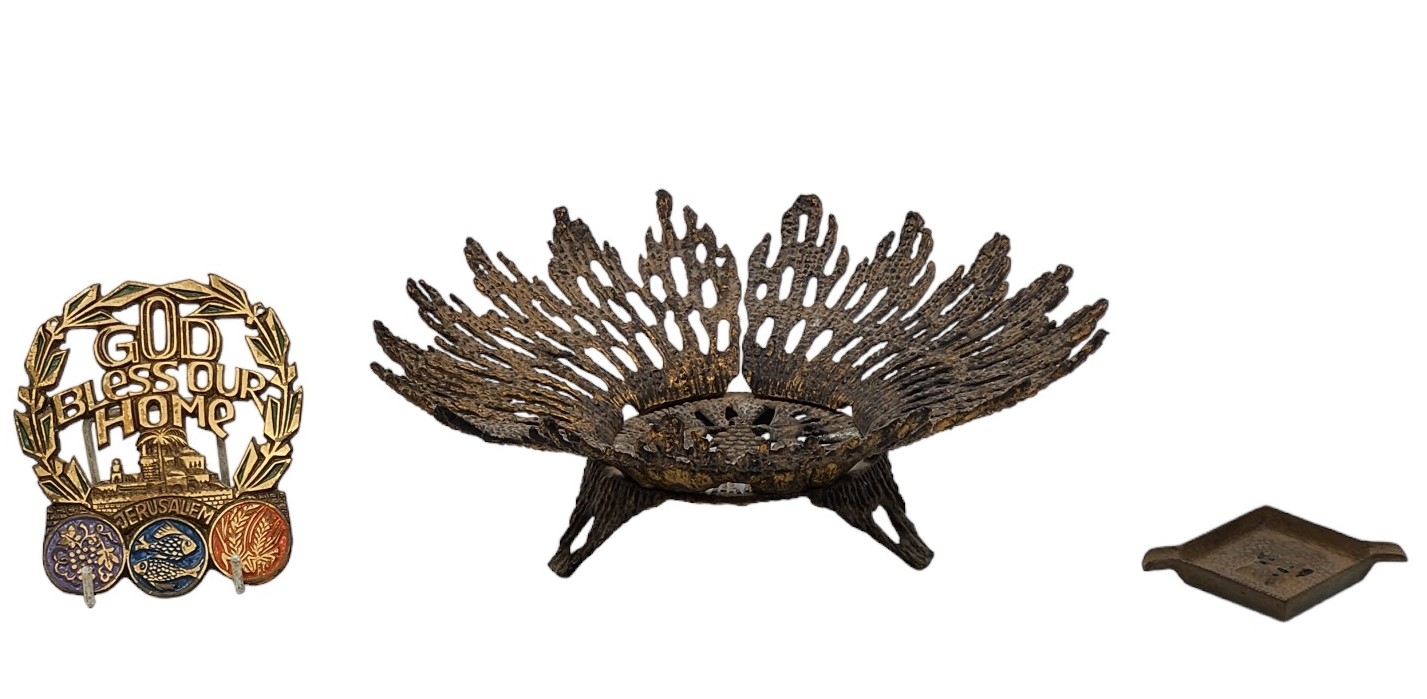 לוט של 3 חפצי ישראליאנה ישנים ממתכת הכולל קערת פליז מתוצרת ווינברג (wainberg), קוטר הקערה 25 ס"מ, קישוט קיר עם ברכת הבית בגובה 12 ס"מ ורוחב: 10 ס"מ, ומאפרה שולחנית ישנה מתוצרת נורדיה (Nordia), ברוחב: 9.5 ס"מ.