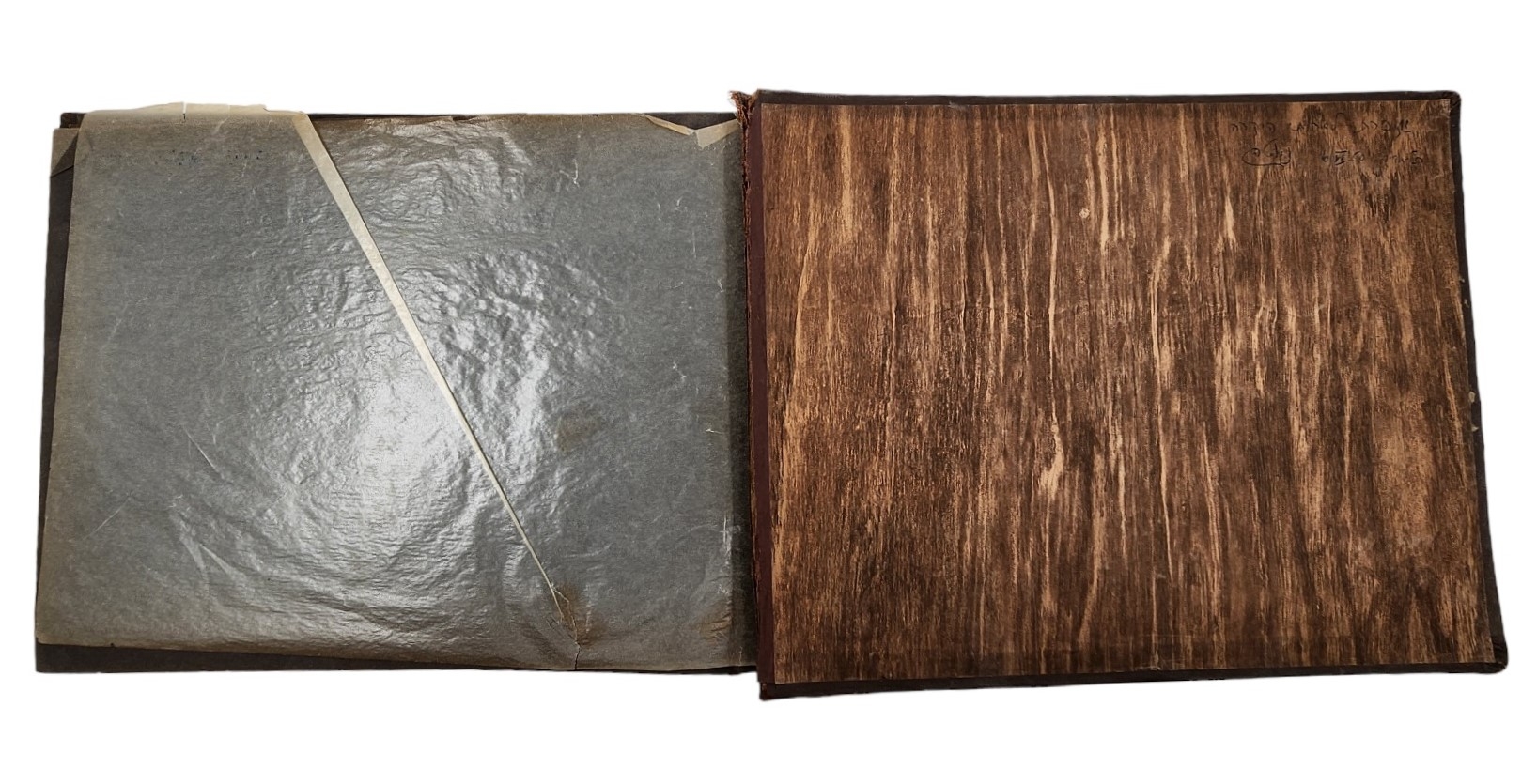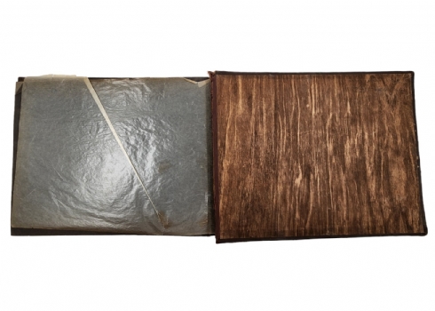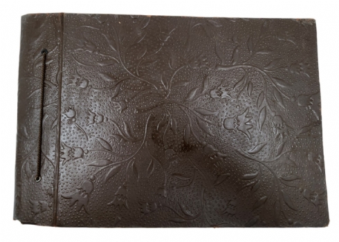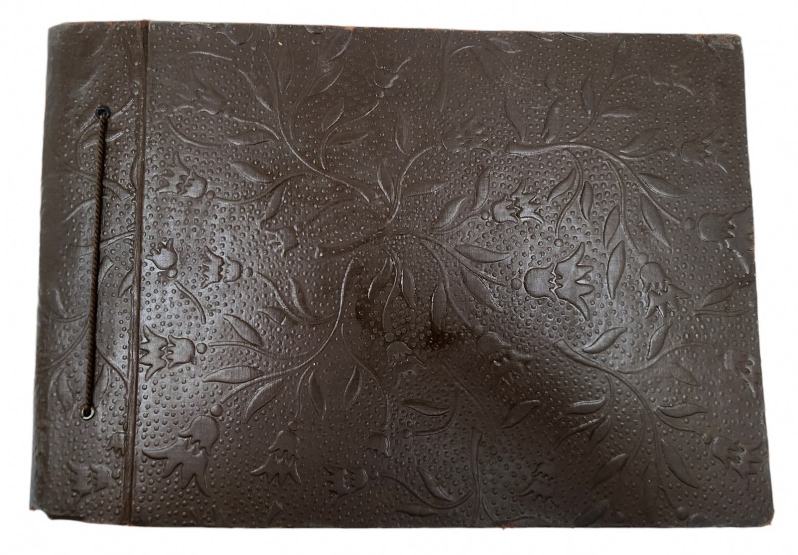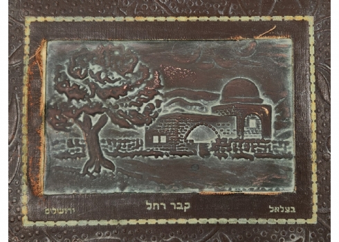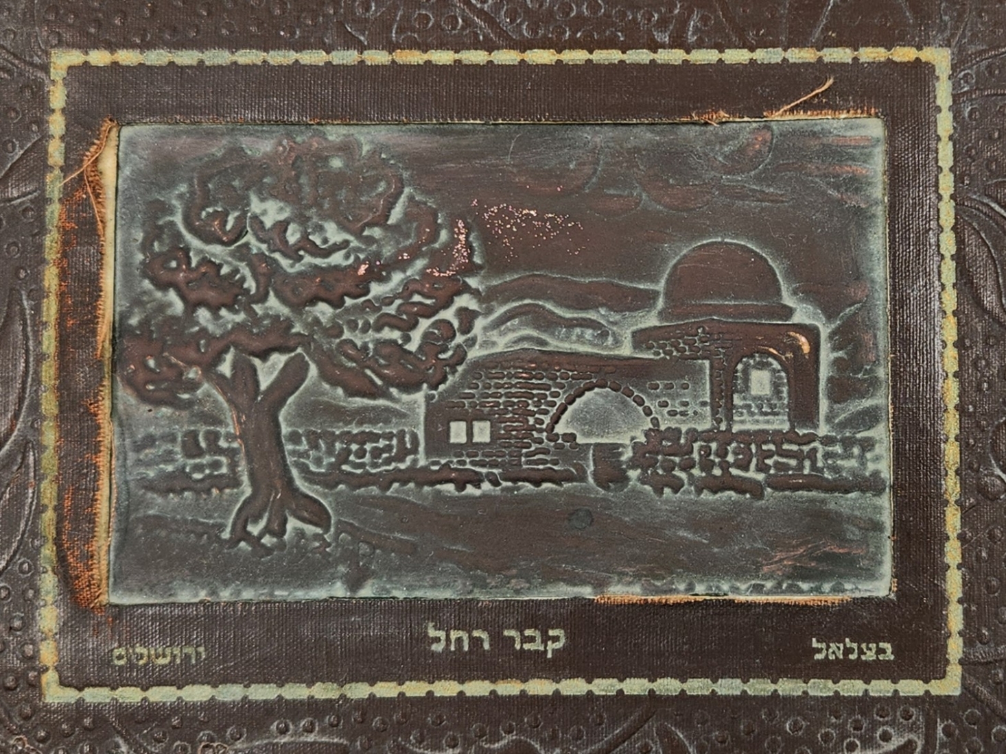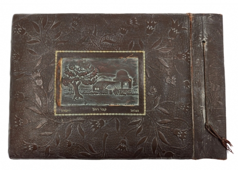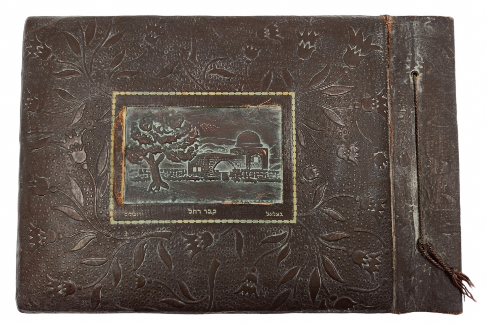אלבום ישן מתוצרת 'בצלאל ירושלים', כריכה דמוית עור, משובצת במרכזה בתבליט נחושת המתאר את קבר רחל, חתום, מידות: 25X37 ס"מ.