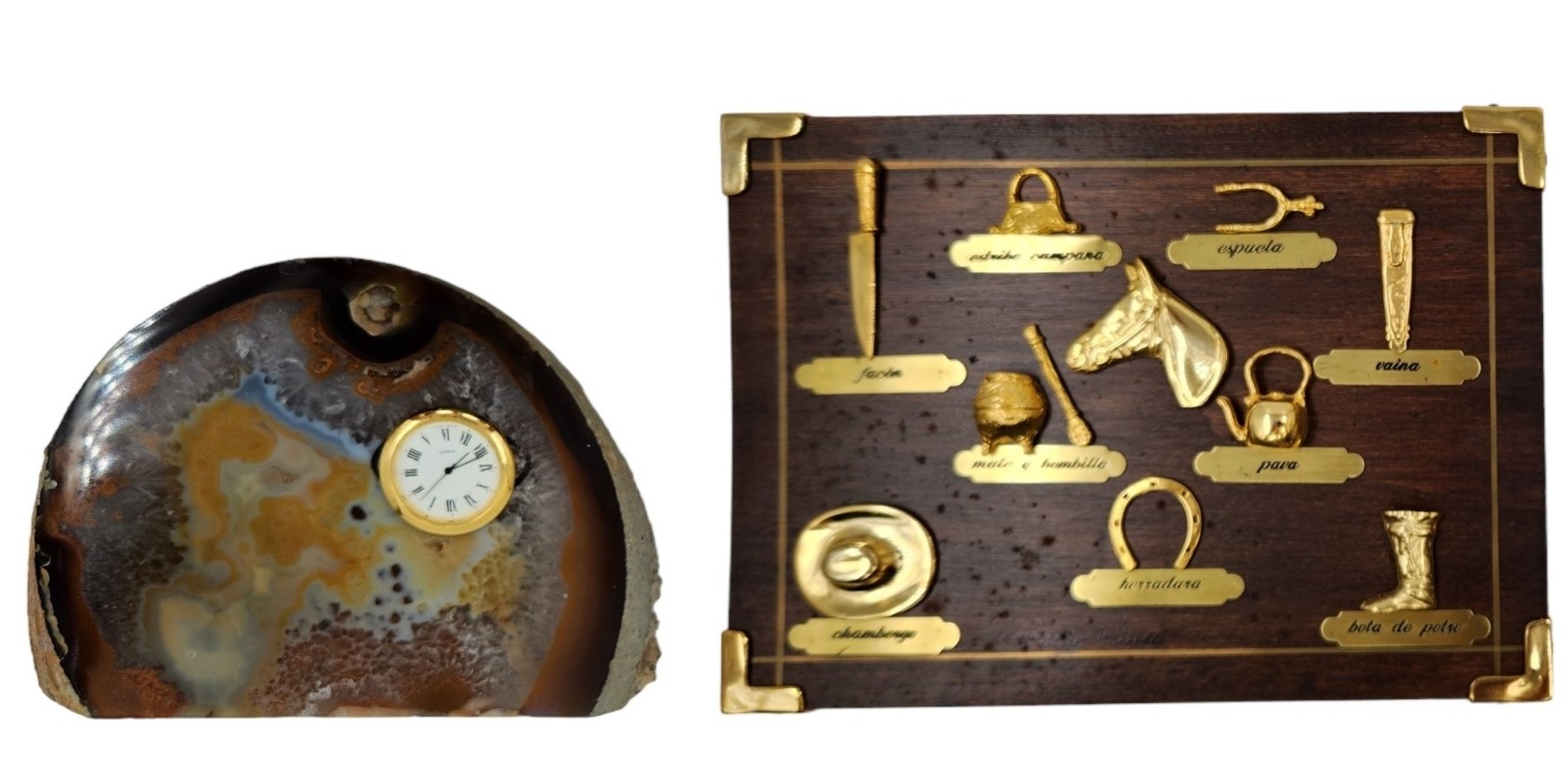לוט של 2 קישוטים דקורטיביים שונים, הכולל, שעון שולחני דקורטיבי משובץ באגת בגובה 13 ס"מ, ורוחב 19 ס"מ, ולוח קטלוג פריטים, הונגרי, עשוי פליז ועץ עשוי עבודת יד, מידות: 18X24 ס"מ.