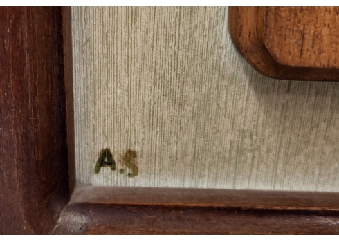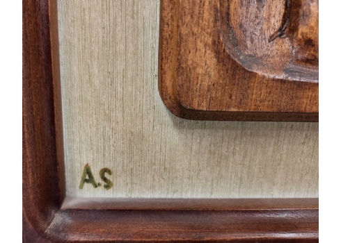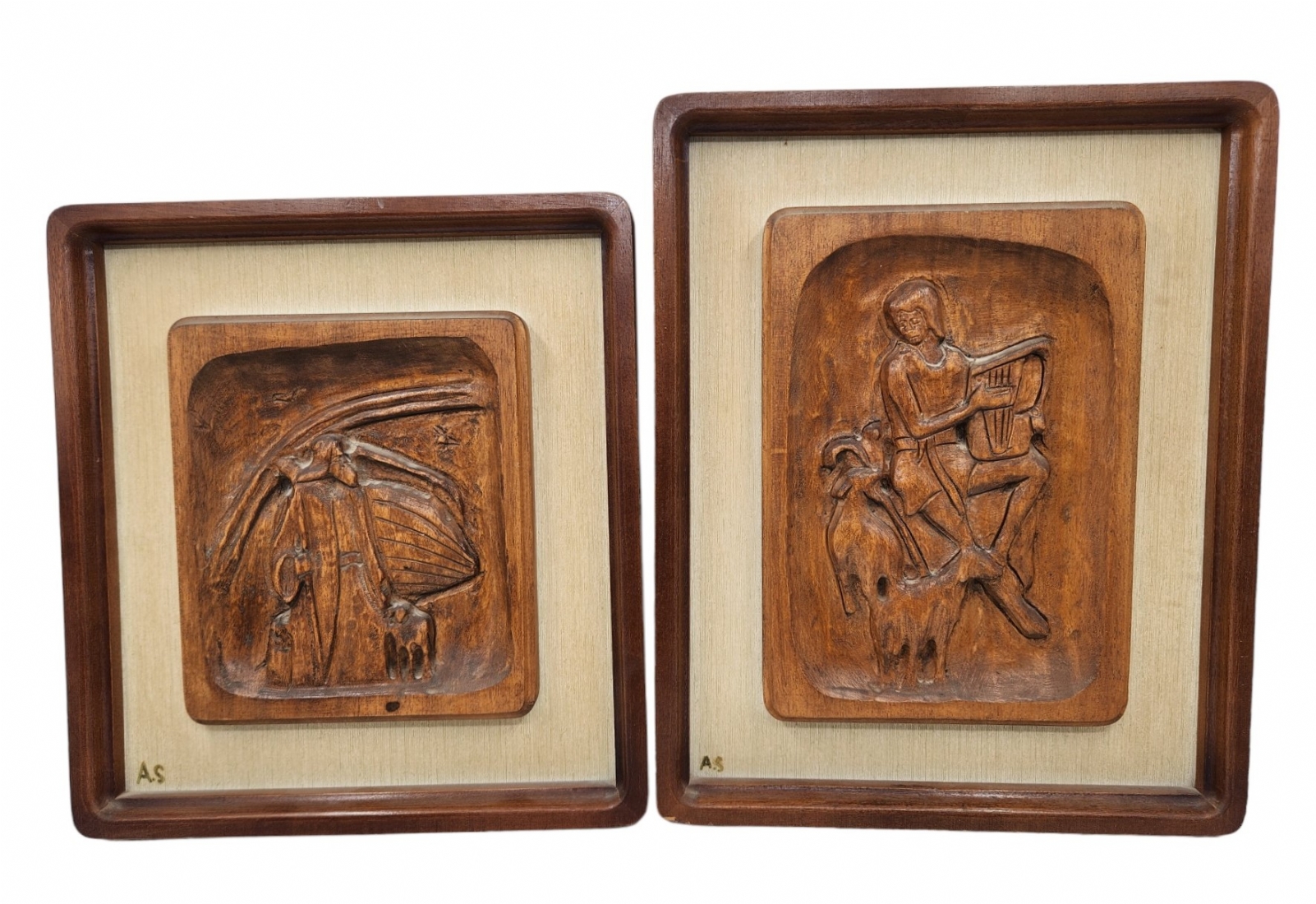 זוג תבליטי עץ מגולפים בעבודת יד אמן עם דמויות תנכ"יות, אחד בדמות דוד המלך רועה צאן והשני בדמות נח ליד תיבת נח והקשת בענן, חתומים הראשי תיבות (נשמח לעזרה בזיהוי האצן), גובה המסגרות בהתאמה: 36, 41 ס"מ, רוחבן: 33 ס"מ.