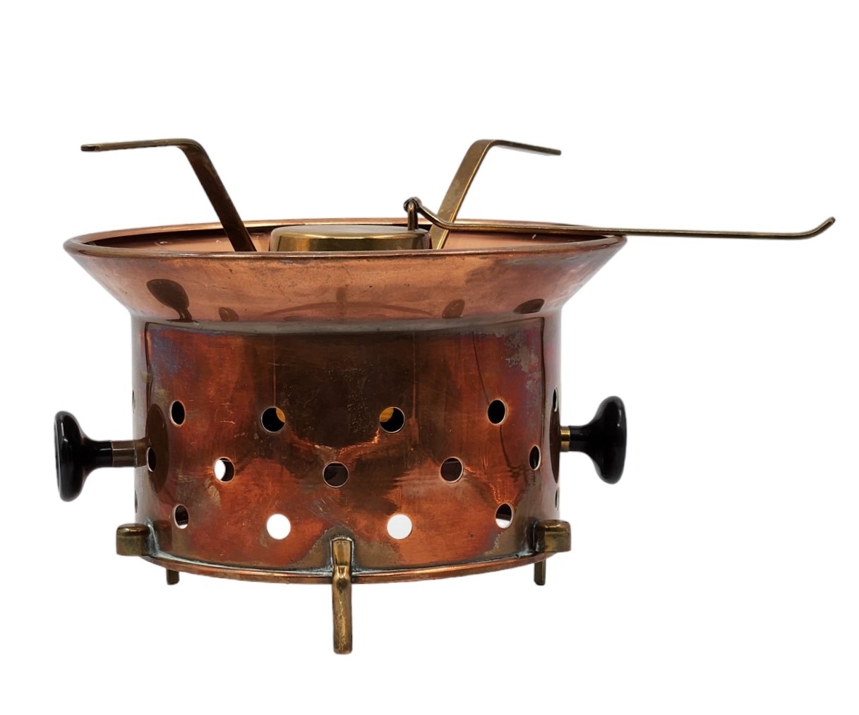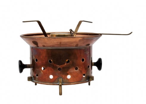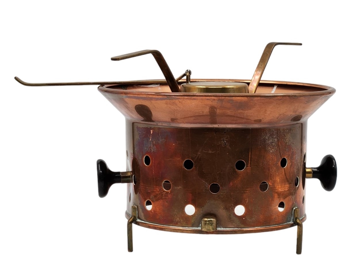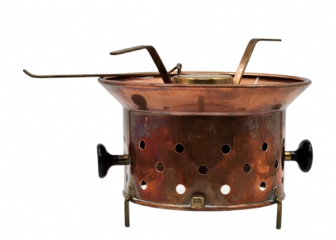 מעמד ישן לסיר פונדו, עשוי נחושת ופליז, גובה כולל: 20 ס"מ, רוחב כולל: 32 ס"מ.