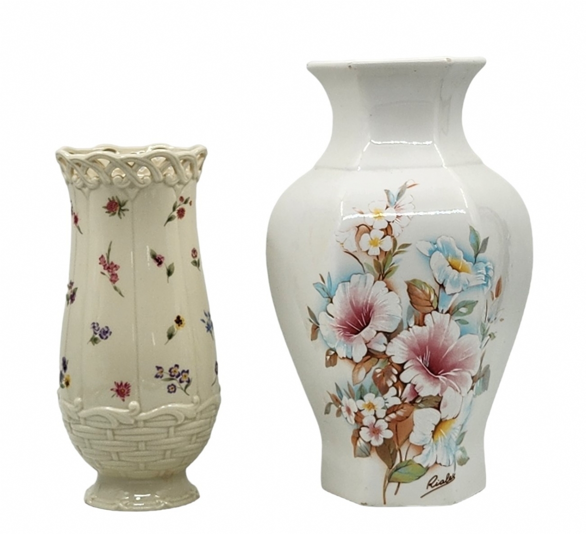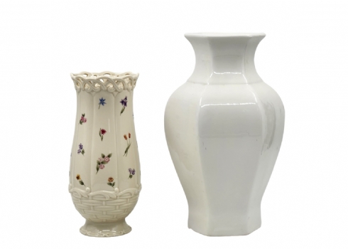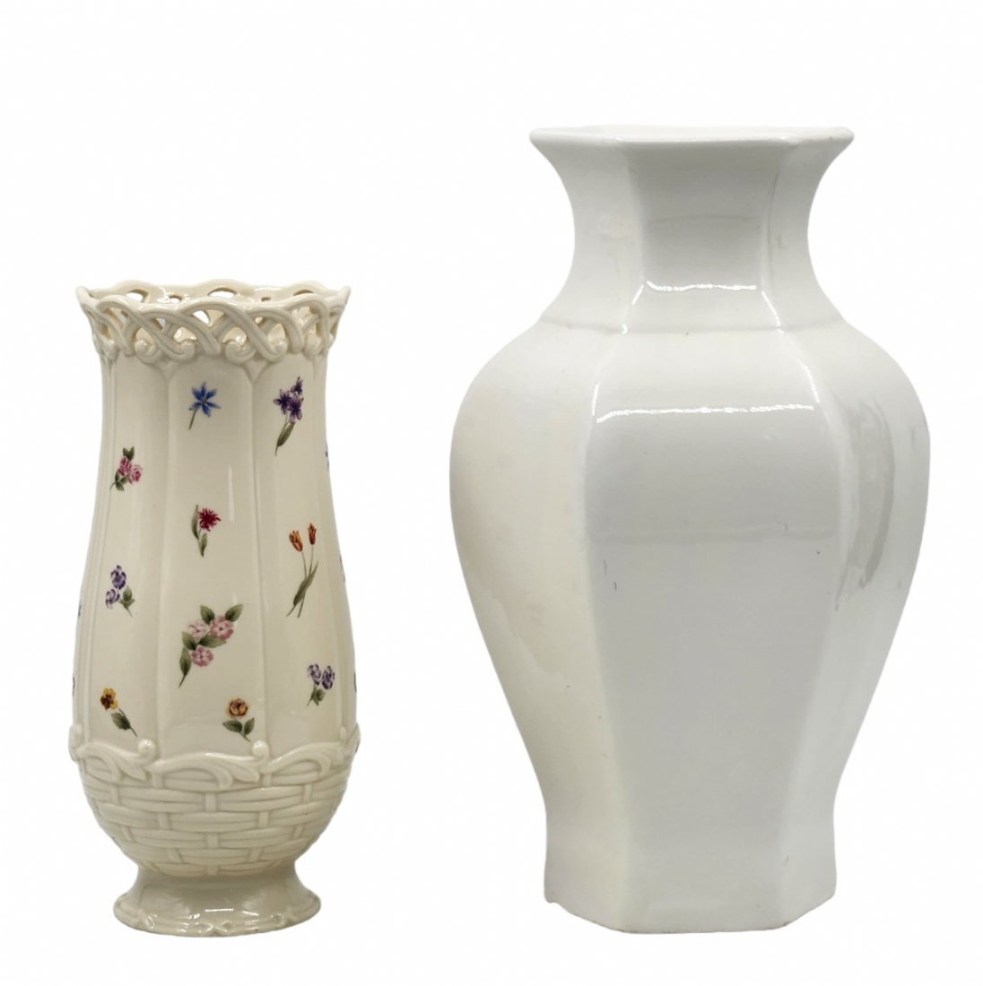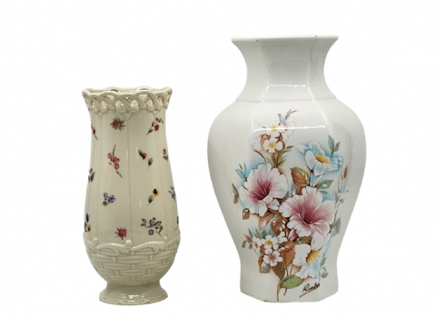 לוט של 2 אגרטלי חרסינה, הנמוך מתוצרת: 'לנוקס' ארה":ב (Lenox), לגבוה צ'יפ מינורי לשפה העליונה, רק הלנוקס חתום, גובה בהתאמה: 24, 30 ס"מ.