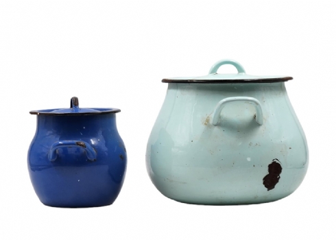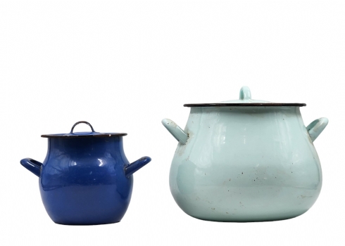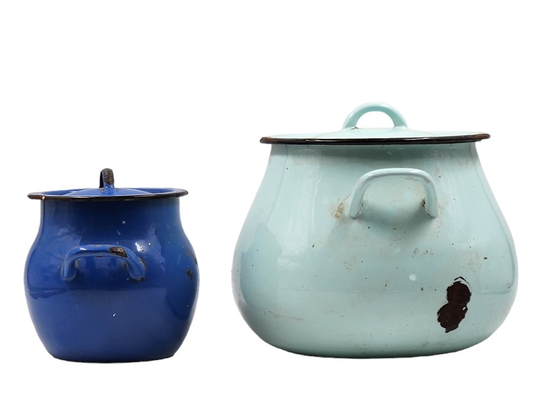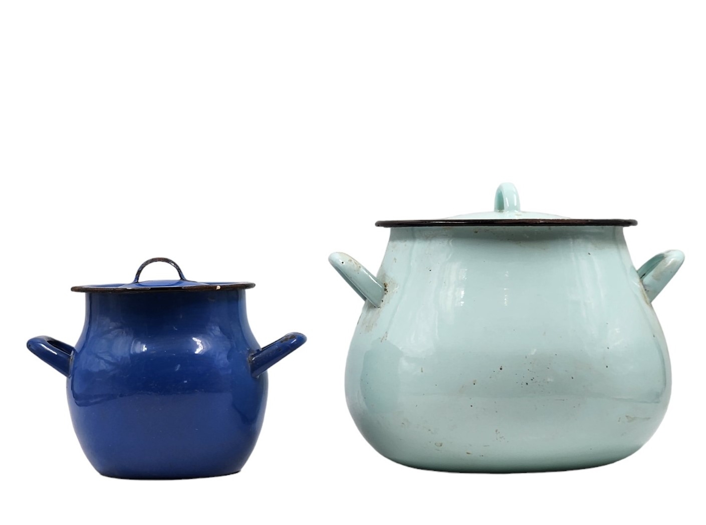לוט של 2 סירי אמייל ישנים, מצב משומש (מצולם), רוחב בהתאמה: 19, 28 ס"מ, גובה בהתאמה: 19, 25 ס"מ.