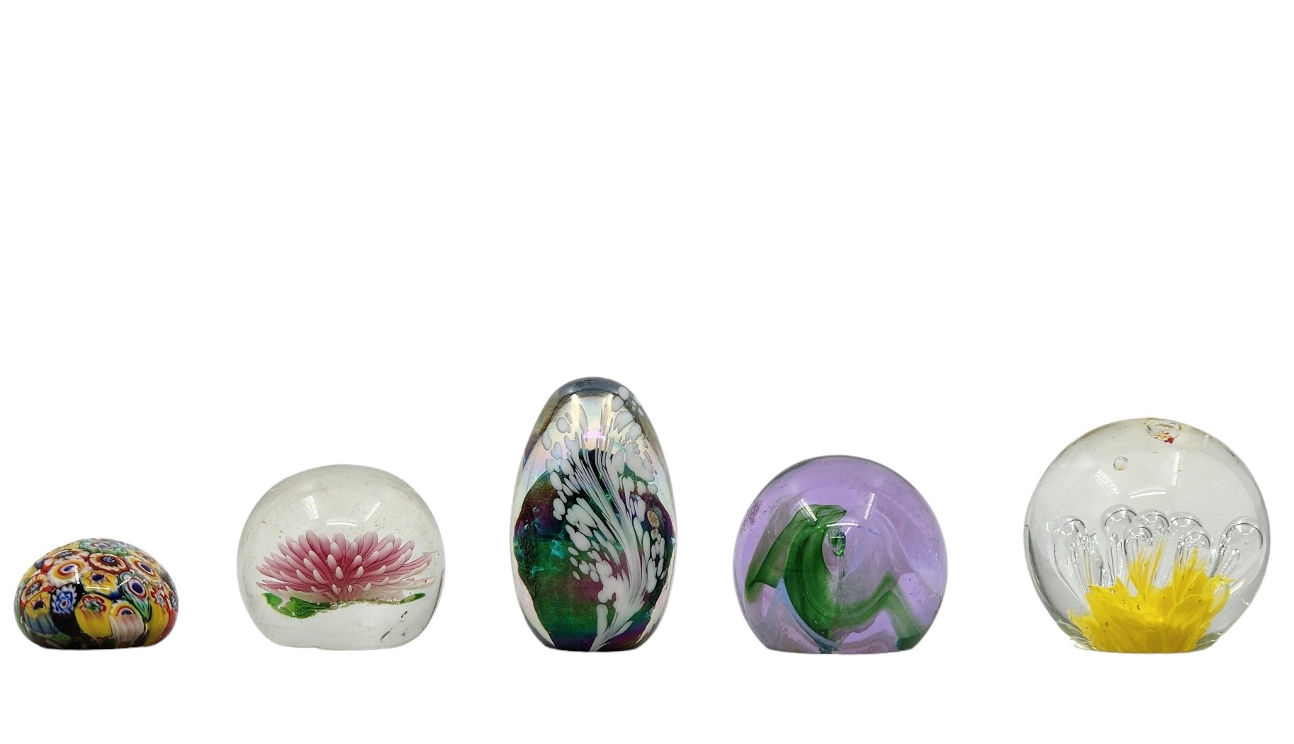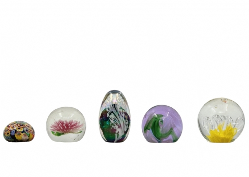 לוט של 5 משקולות נייר, הכולל, משקולת סקוטית, תוצרת 'Caithness', חתומה, משקולת מעוטרת עבודת מילפיורי, משקולת מעוטרת בעבודת 'בוליסנטה' (Bullicante glass), משקולת בסגנון טיפאני מעוטרת בדגם פרח מים, גובה המשקולת הגבוהה: 7 ס"מ, רוחב המשקולת הצהובה: 5.5 ס"מ.