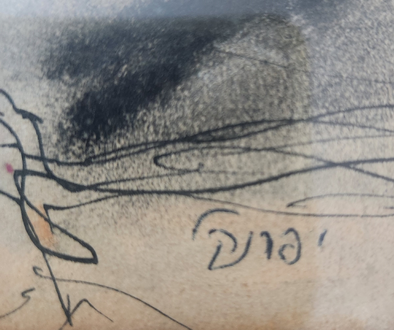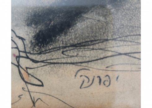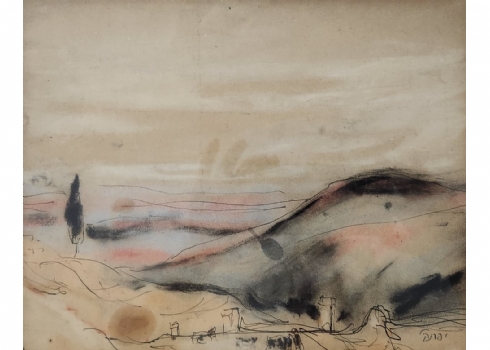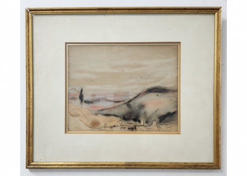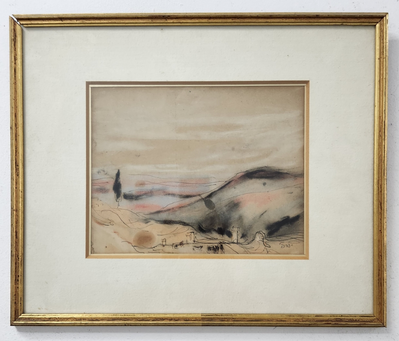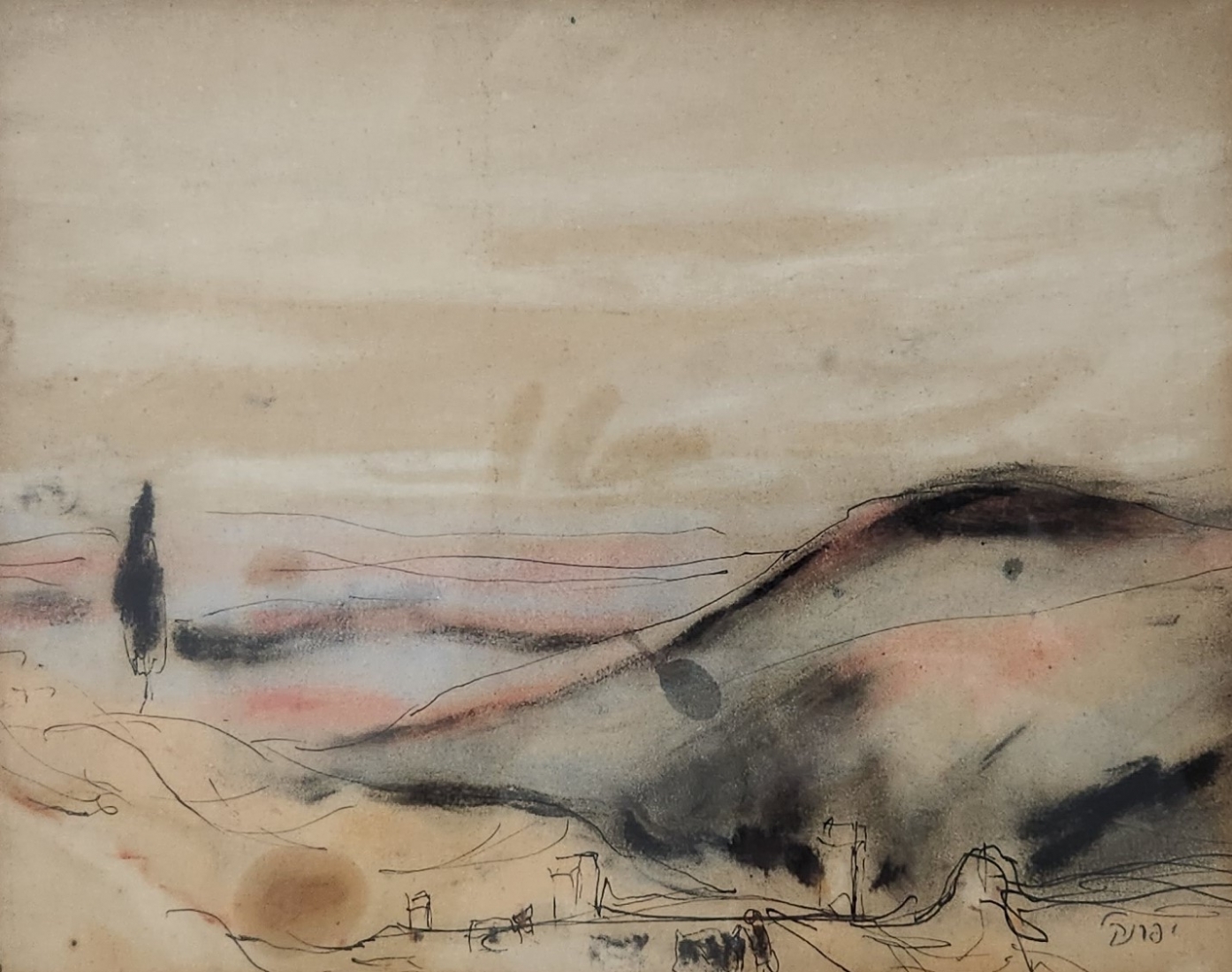 יצחק פרנקל פרנל (Isaac Frenel Frenkel) - 'ברוש שחור בנוף' - רישום דיו וגירי פסטל על נייר, חתום, מידות: 21X27 ס"מ, מידות המסגרת: 37X45 ס"מ.