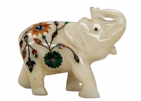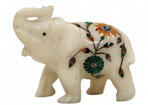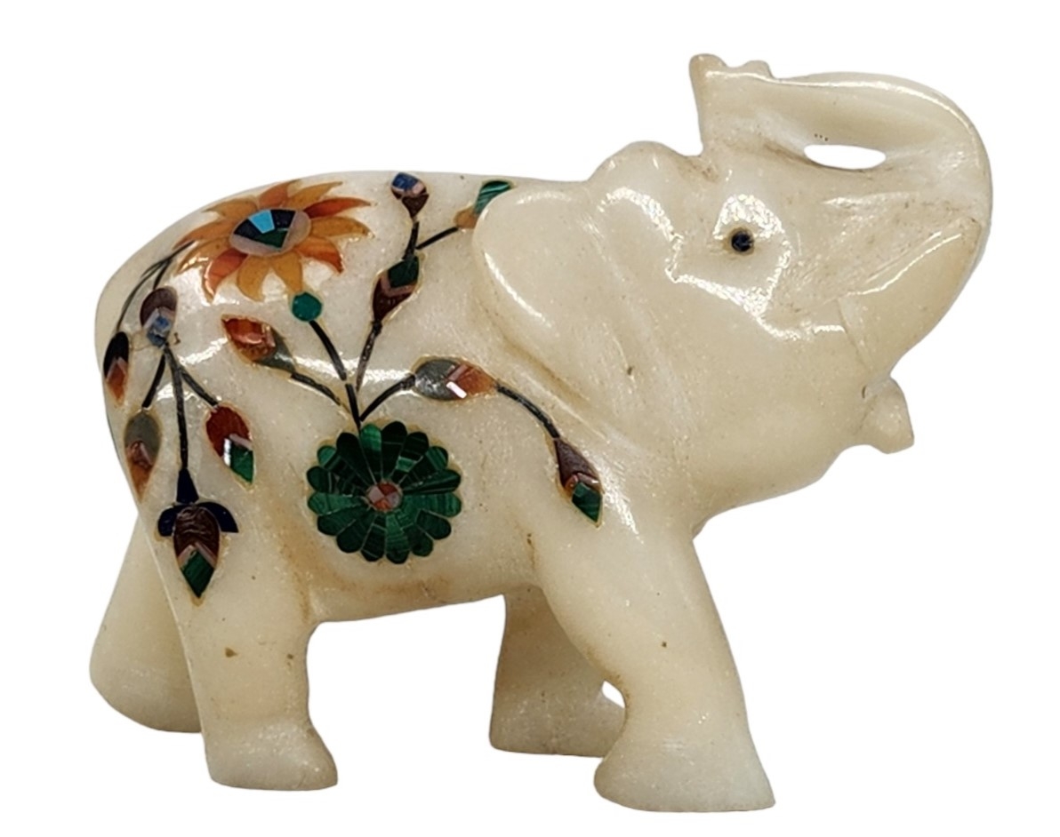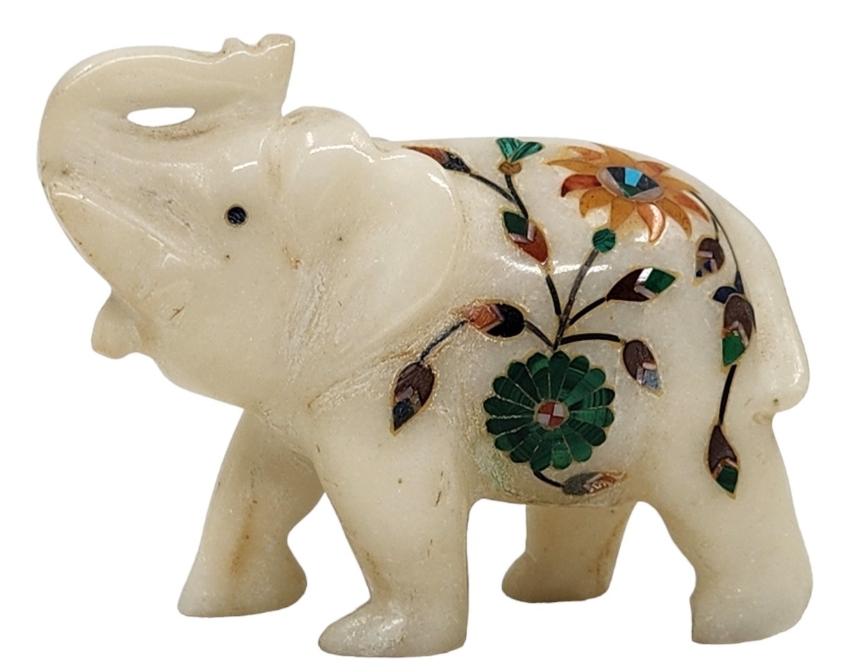 פסלון הודי ישן בדמות פיל עשוי אלבסטר לבן מעוטר בשיבוץ מסוג פארצ'ין-קארי (Parchin