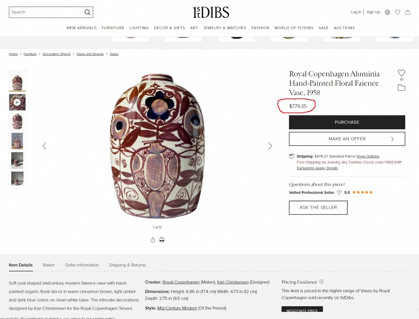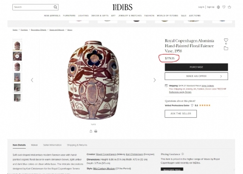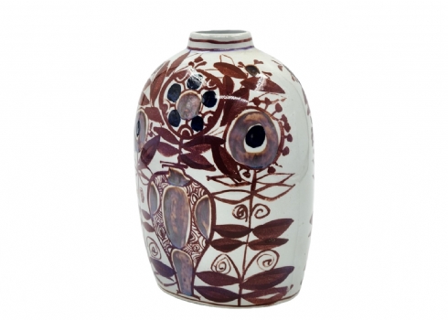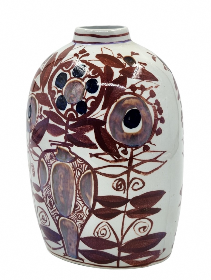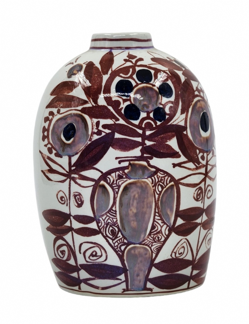 לאספנים - כד קרמיקה דני מתוצרת 'אלומיניה' (Aluminia) המפעל שרכש את 'רויאל קופנהגן' (Royal Copenhagen), על פי עיצוב של: 'קרי קריסטיאנסן' (Kari Christensen) מתוך סדרה הנקראת 'Tenera', מעוטר בציורי יד וחתום, 1958 בקירוב, רוחב: 13 ס"מ, גובה: 19 ס"מ.